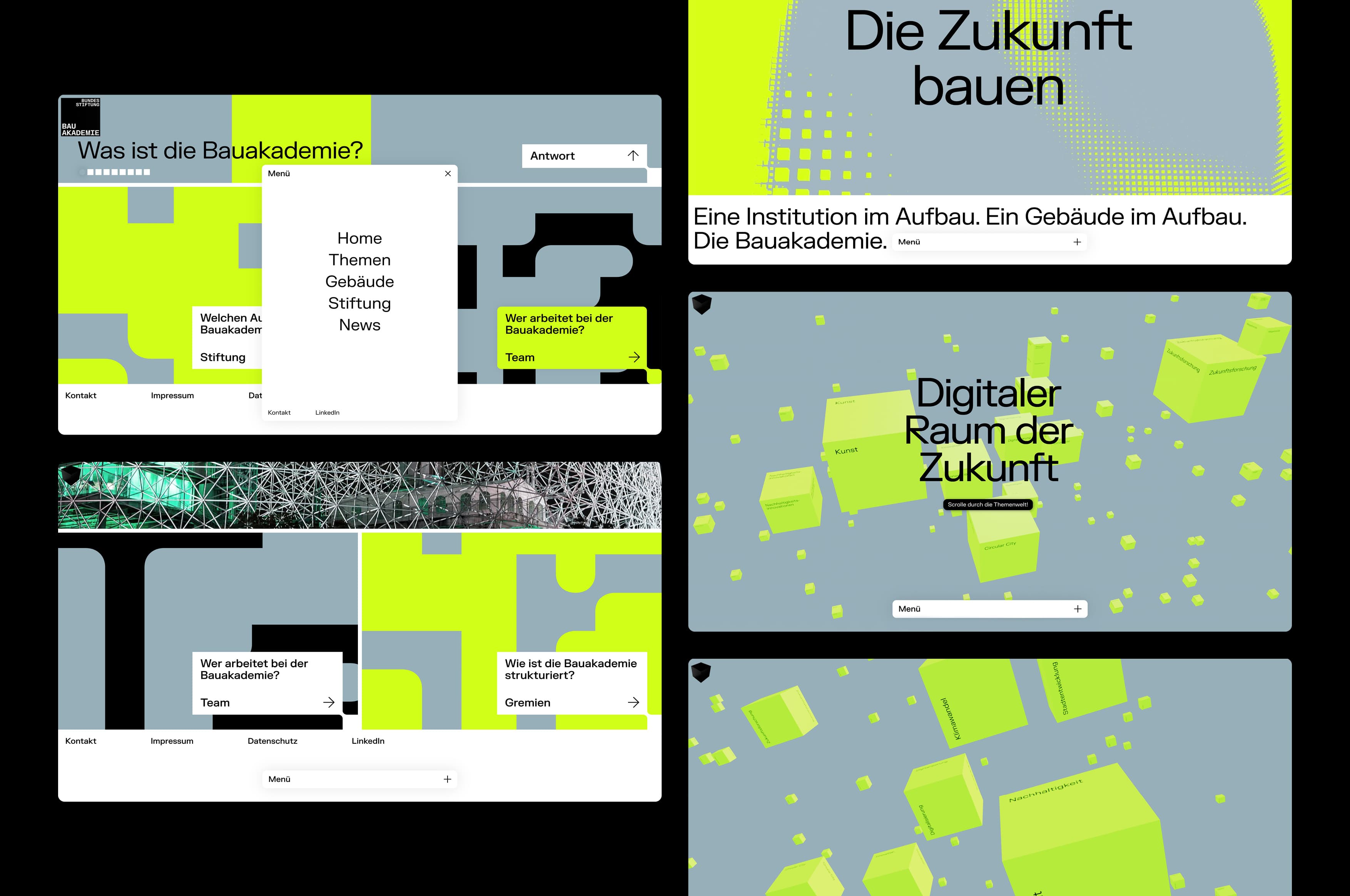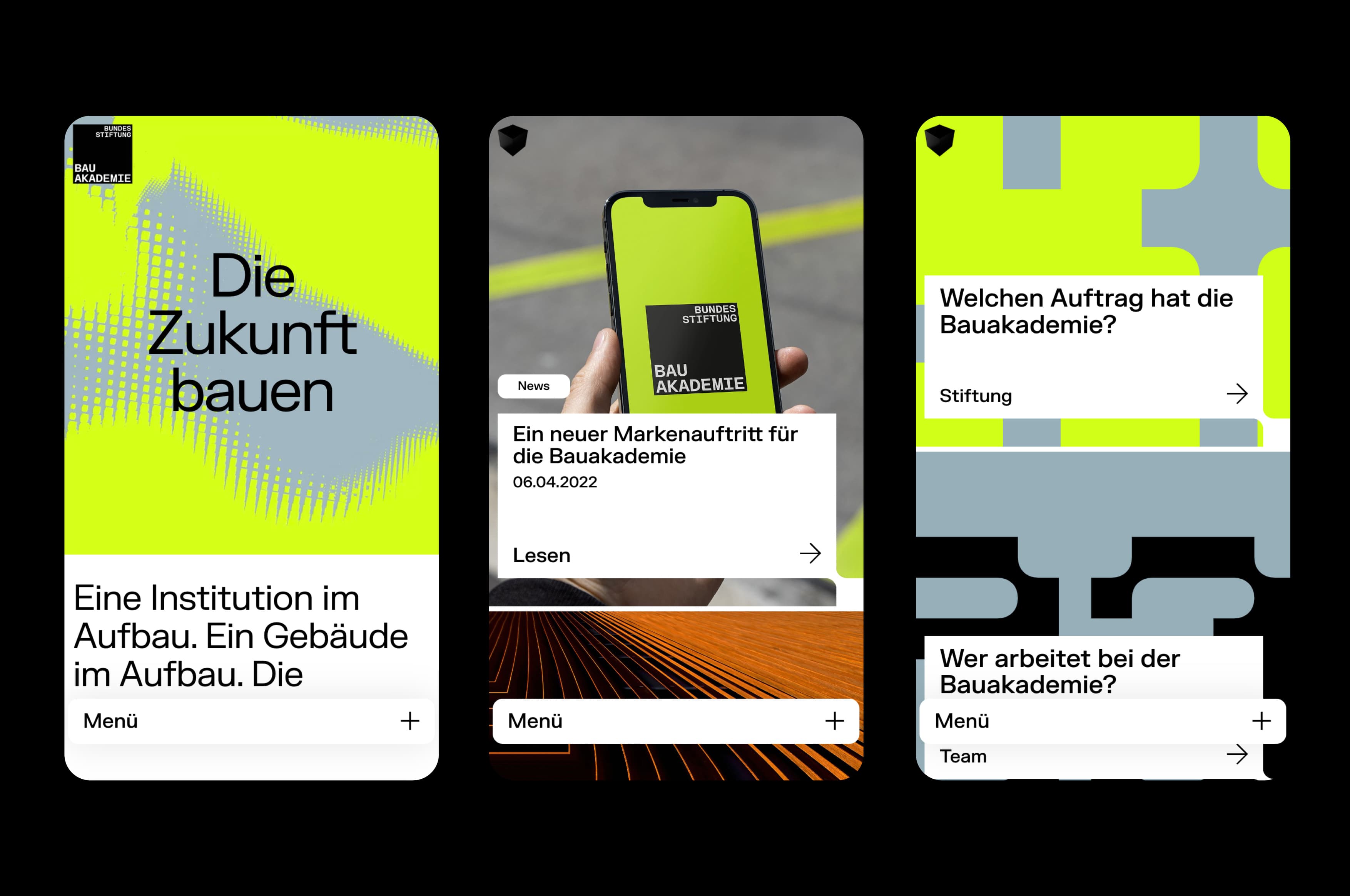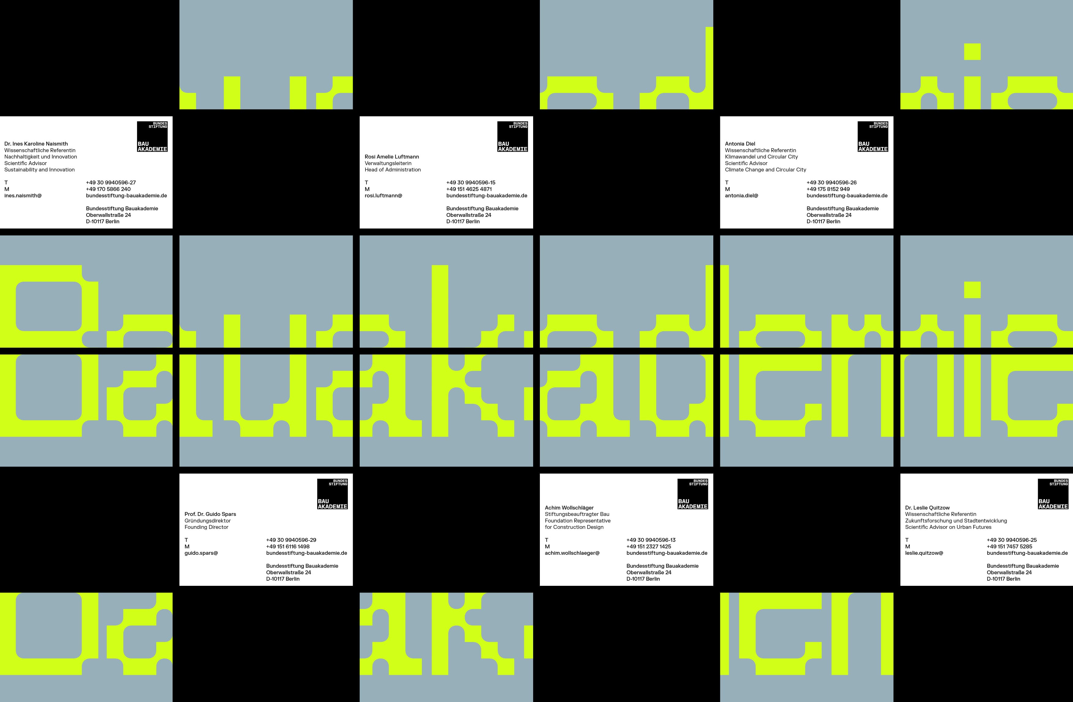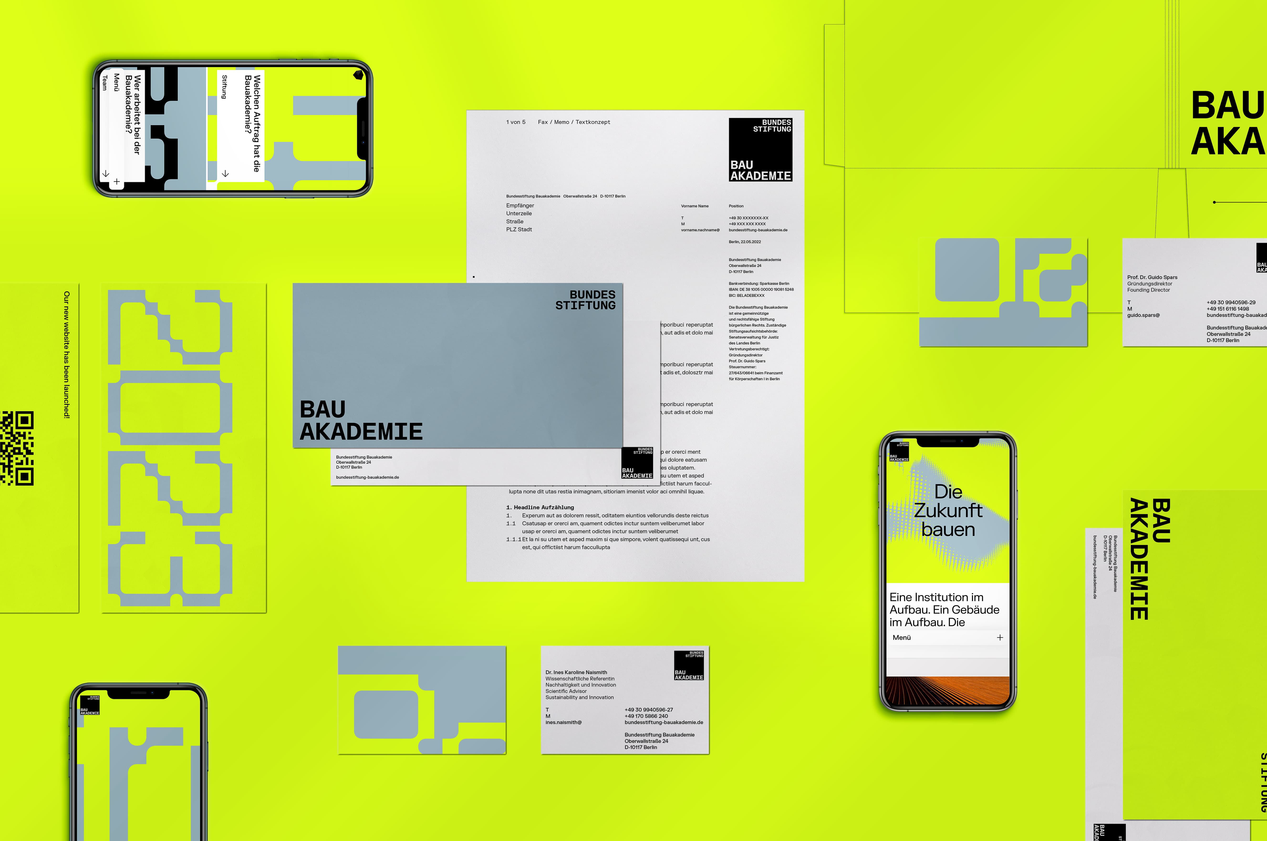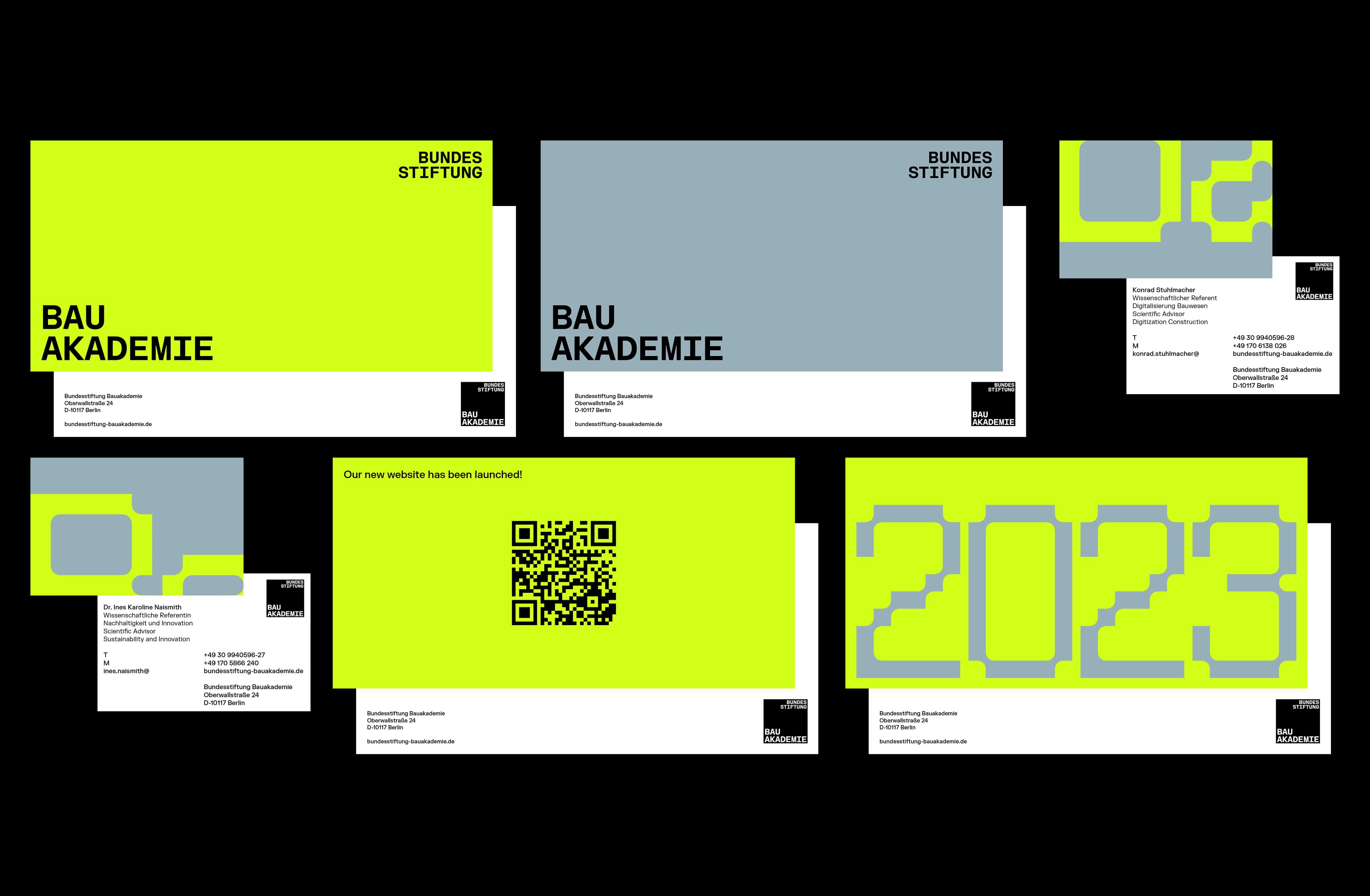 The Bauakademie has taken on a new brand identity. Its visual image is now defined by clear, simple shapes that express the Bauakademie’s self-image as a pioneering institution for sustainable planning and construction. The basic element is the square, a particularly memorable and variable shape. It also alludes to the square footprint of Karl Friedrich Schinkel’s historic Bauakademie, whose former location will be the site of the new Bauakademie building. The color scheme features the primary color gray and the accent color luminous green, which is used to evoke associations with themes such as sustainability, nature and technology. The entire graphic concept was developed under the motto of “physical and mental space of the future” by Stan Hema brand agency (Berlin).