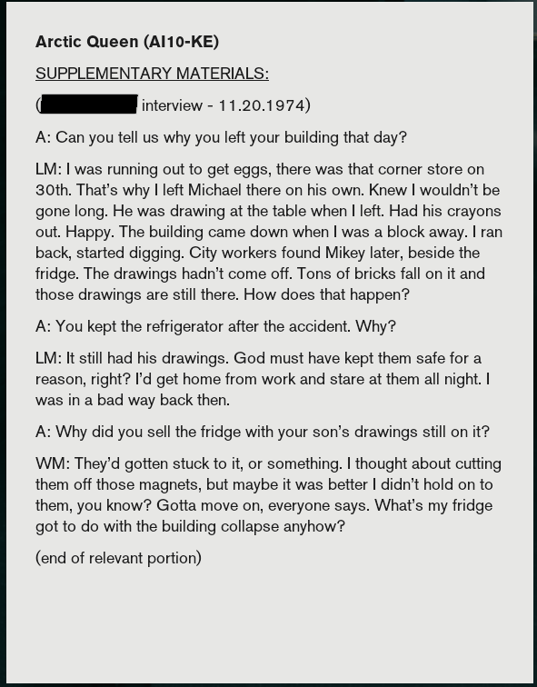 Case files, research papers, and correspondence you come across are set in Linotype’s version of Akzidenz-Grotesk, Basic Commercial (the question mark is the tell tale glyph), a style favored by ‘Swiss’ design which became popular in the 1960s.