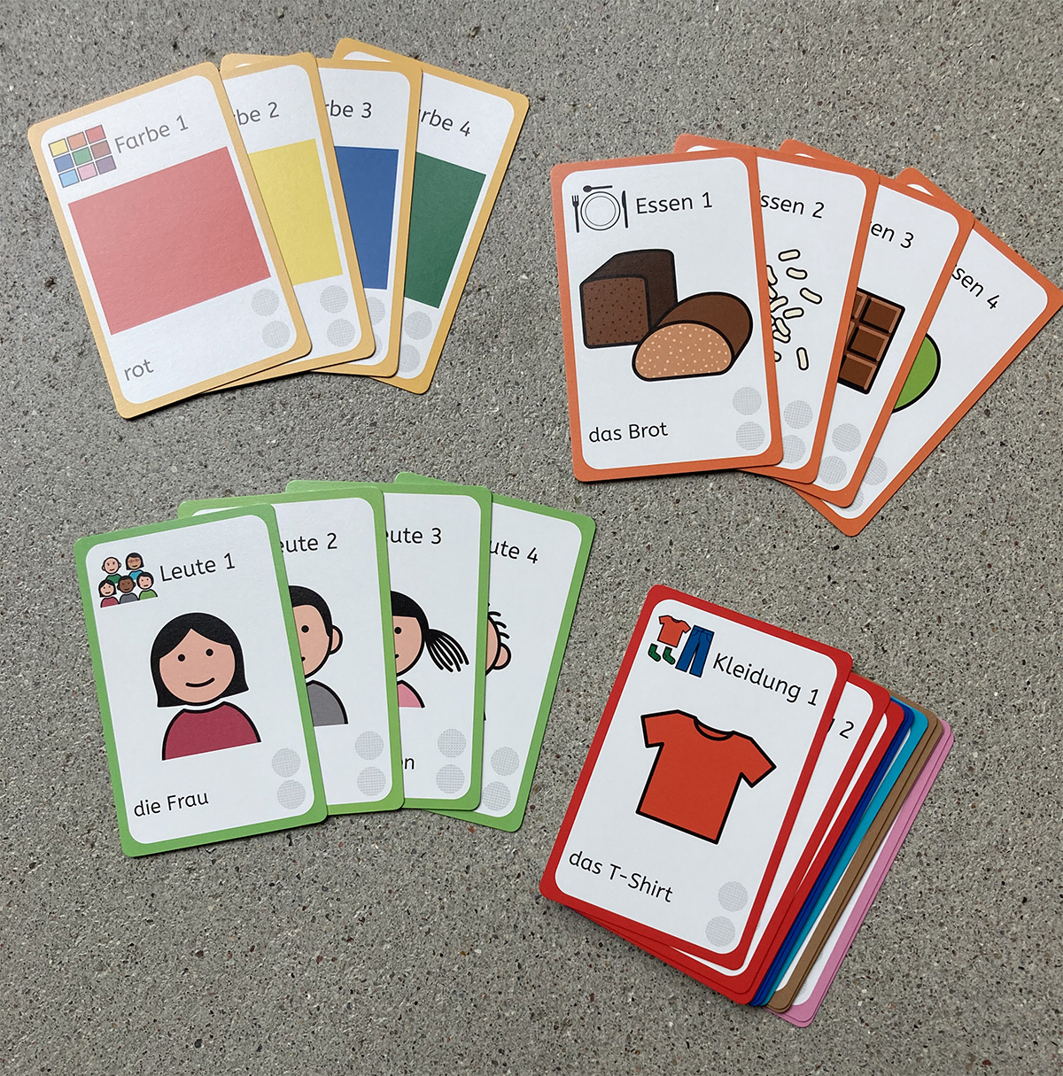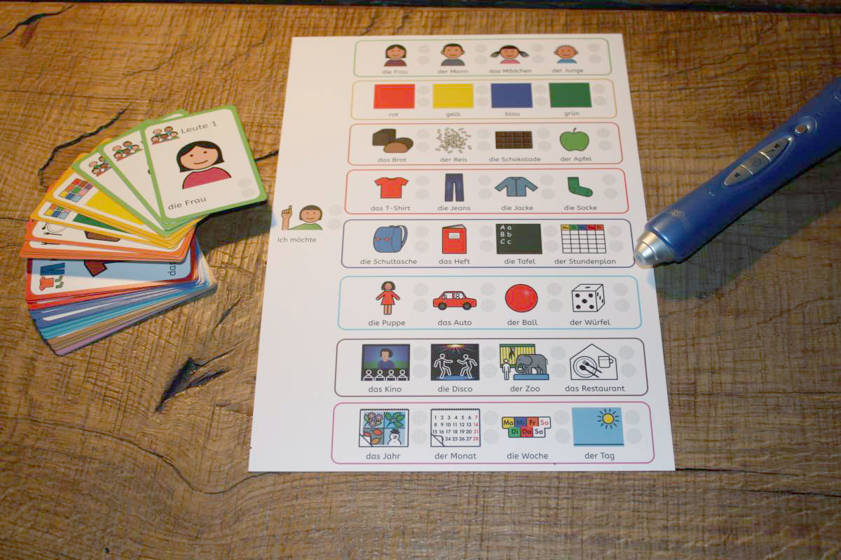 This card game of Autismusverlag (“Autism publishers”) enhances vocabulary and encourages concentration and communication. The cards are illustrated using METACOM symbols accompanied by the ABeZeh Sans typeface. As an additional AAC (Augmentative and Alternative Communication) approach, the cards are provided with an audio code to listen to the words via Anybook Reader. Users can also translate words or put them into context with custom audio content.