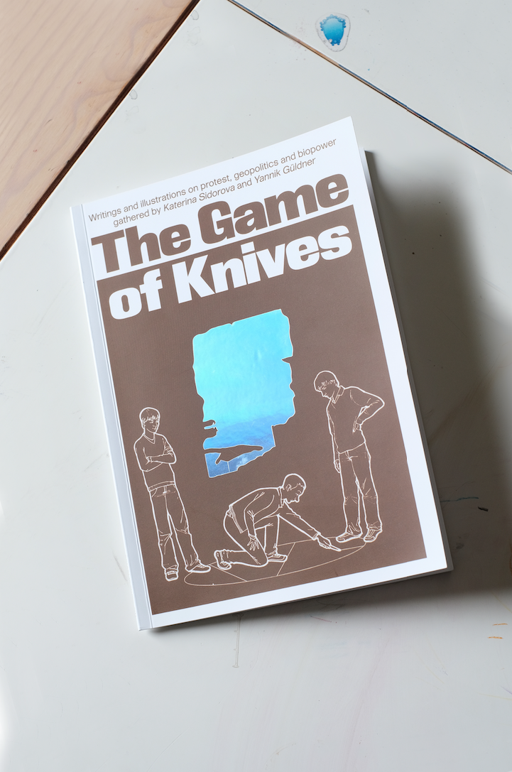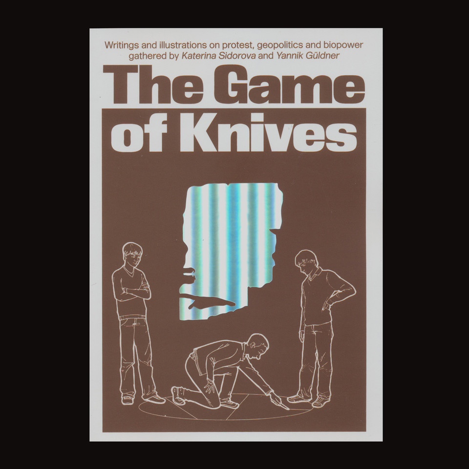 The Game of Knives is a book with “writings and illustrations on protest, geopolitics and biopower, gathered by Katerina Sidorova and Yannik Güldner”. It was designed by Lukas Engelhardt and Justus Gelberg for Katerina’s solo show Bottleneck at West Den Haag. The book title is a reference to a children’s yard game called “Knives” or “Lands”, which is popular in some countries in Eastern Europe, especially in Russia. The players throw a knife into the soil, dividing and conquering land from each other. This act of drawing geometrical shapes / lines as a political gesture is the core of the book.