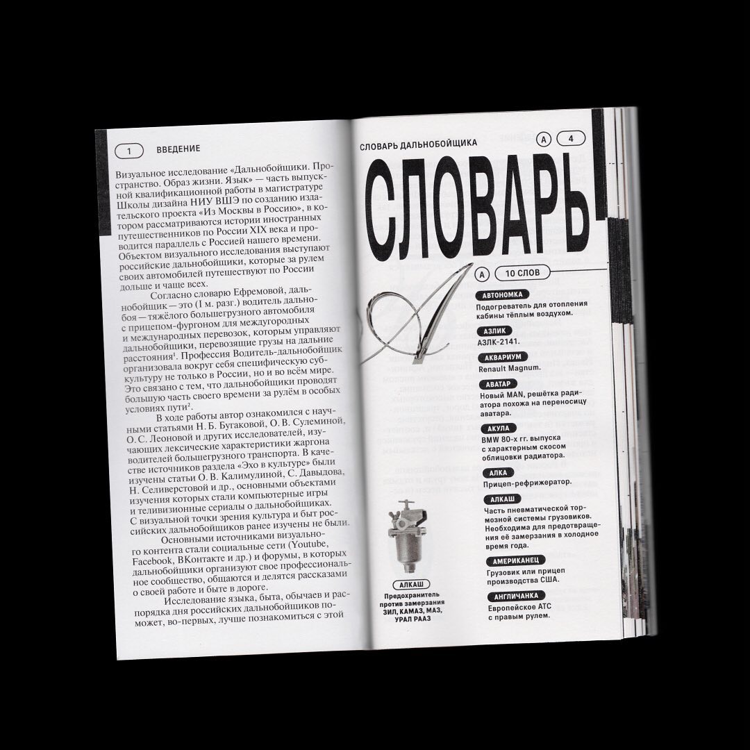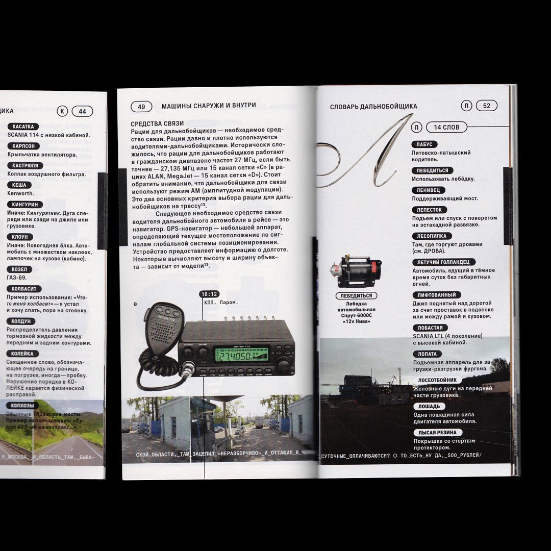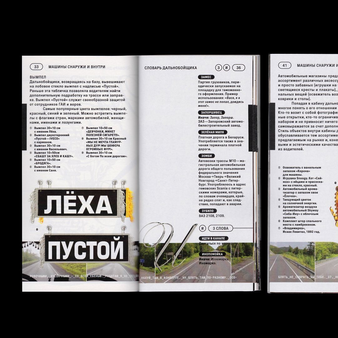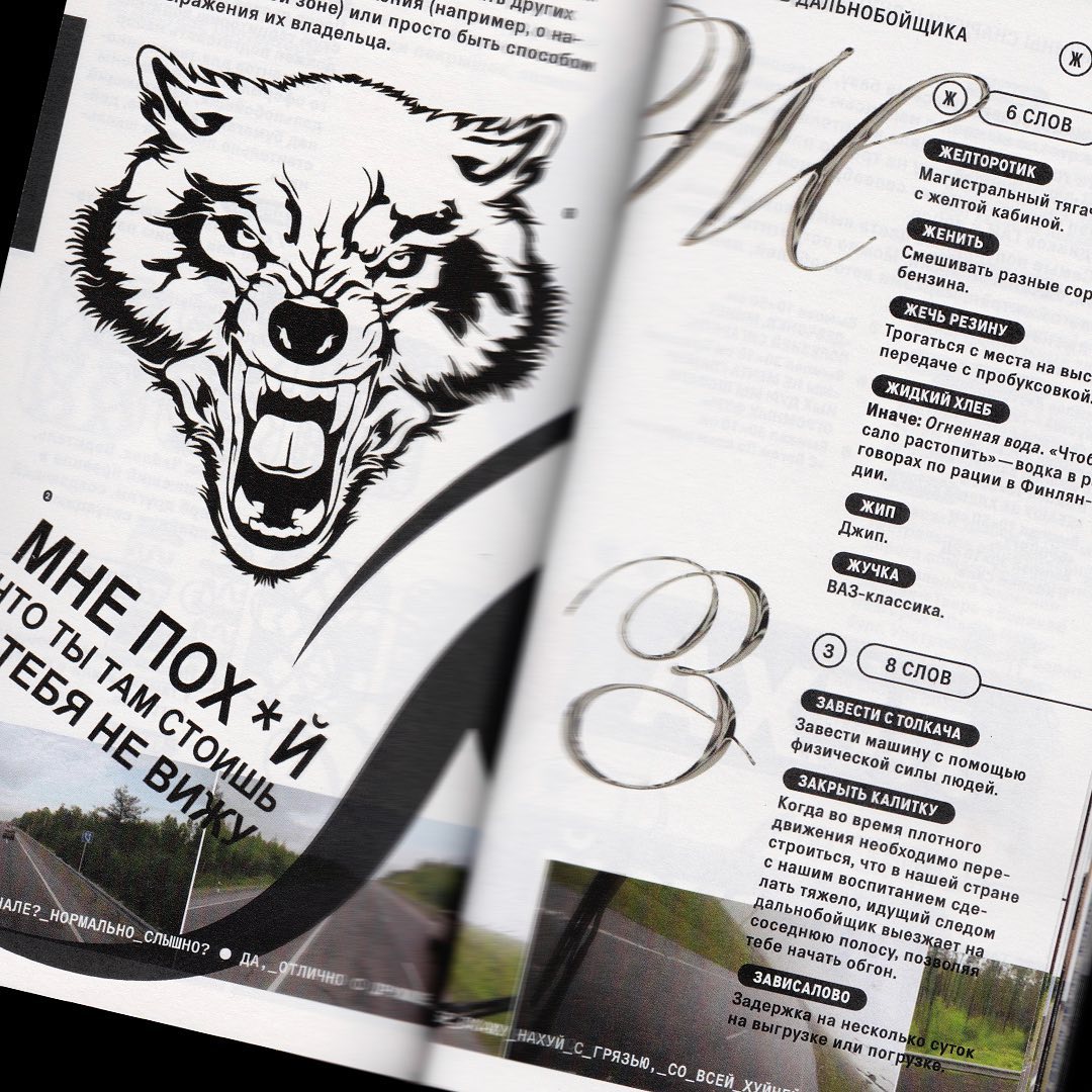 A visual research on what the life of long-haul truckers looks like, what they talk about and what they look at – a student project by Arzamas’ designer Masha Kasatkina. The book consists of four parts: “Trucks, From Outside and Within”, “Road, and on the Road”, “Brotherhood”, “Echo in the Culture”. Signal, based on a typeface from French road signs, reminds of the constant moving, while Archaism resembles wild typography of print ads and naïve design of the roadside restaurants. The serif typeface used for body text is Newton. Shelley Script Cyrillic is used for decoration, drop caps and selected elements.