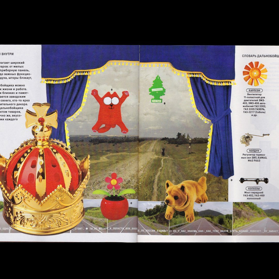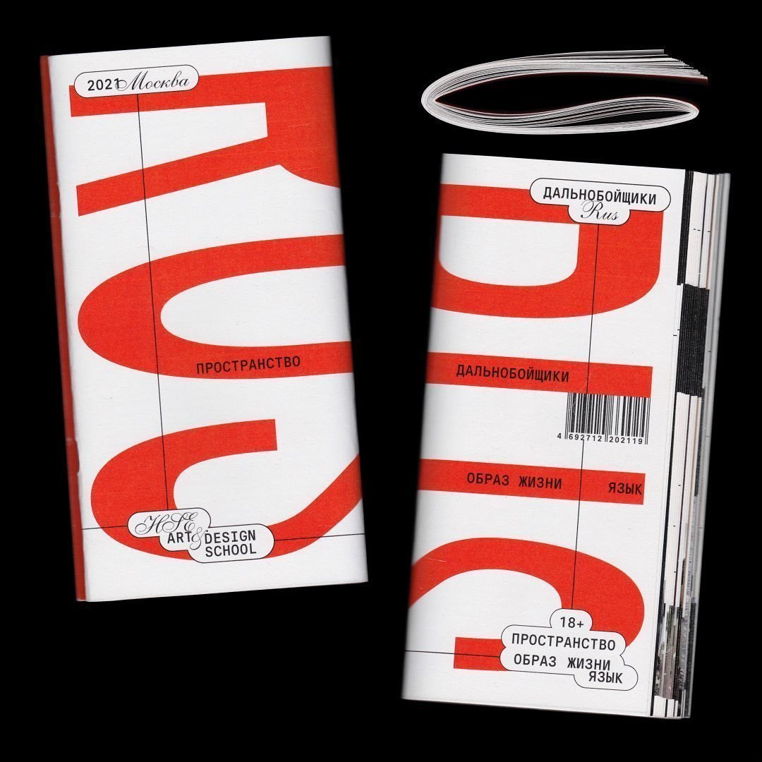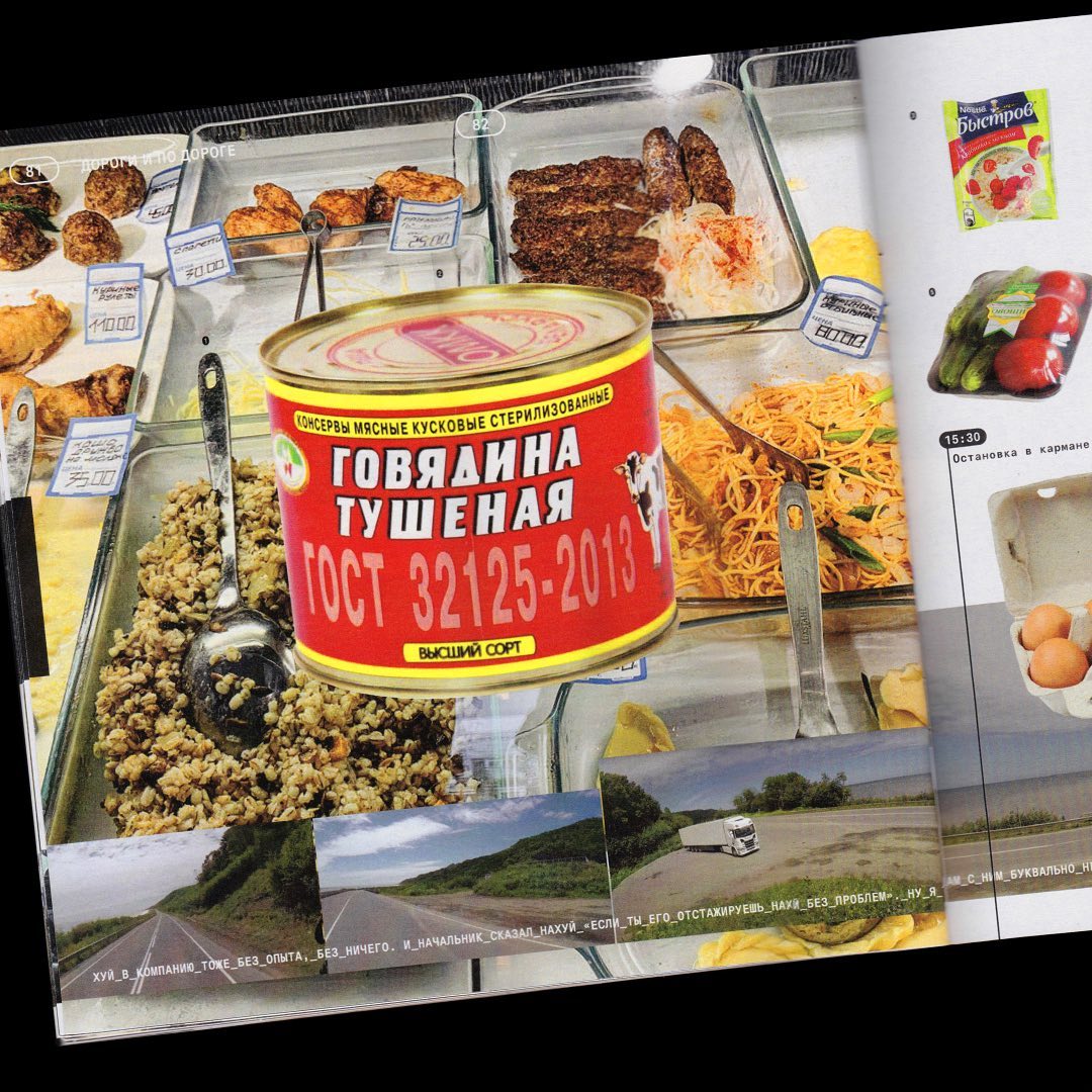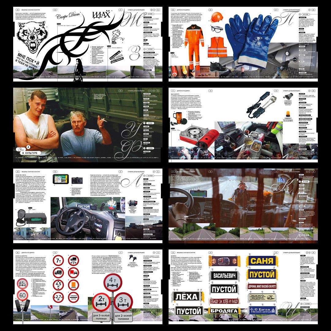 A visual research on what the life of long-haul truckers looks like, what they talk about and what they look at – a student project by Arzamas’ designer Masha Kasatkina. The book consists of four parts: “Trucks, From Outside and Within”, “Road, and on the Road”, “Brotherhood”, “Echo in the Culture”. Signal, based on a typeface from French road signs, reminds of the constant moving, while Archaism resembles wild typography of print ads and naïve design of the roadside restaurants. The serif typeface used for body text is Newton. Shelley Script Cyrillic is used for decoration, drop caps and selected elements.