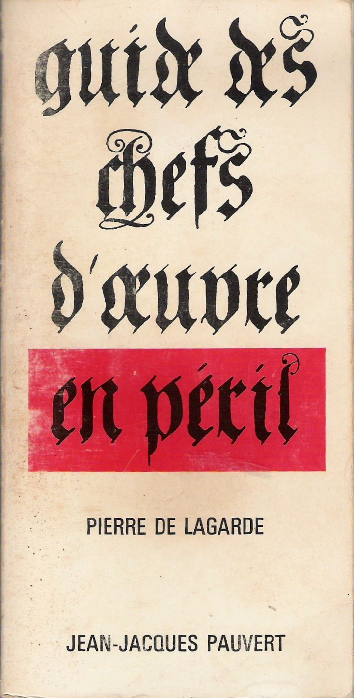 This “guide to masterpieces at risk” accompanied the French TV series of the same title, which dealt with safeguarding endangered cultural heritage sites in France. Chefs d’œuvre en péril was created and presented by Pierre de Lagarde and broadcast from 1962 to 1993.
