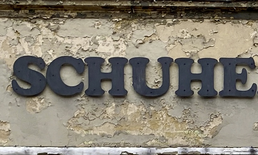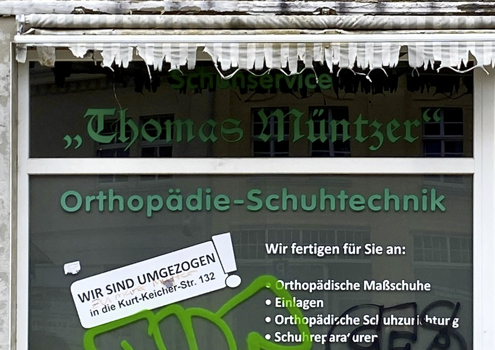 More recently, the building housed Schuhservice „Thomas Müntzer“, a company focusing on orthopedic shoe technology. Their shop window lettering is worth a look, too. The name of the company’s patron, a prominent figure of the German Reformation, is fittingly set in Alte Schwabacher. This typeface, like most blackletter designs, comes with two forms for s; the round one and the long one (ſ). This application shows neither. Chances are the specific font in use offered an ſ as the default glyph. The sign maker didn’t like that, or was aware that this form isn’t meant to be used in final position. Since they couldn’t locate the alternate round form – in pre-OpenType fonts like URW’s, it’s hidden under the number sign (#) code point – they went with a a scaled-down capital form (S).