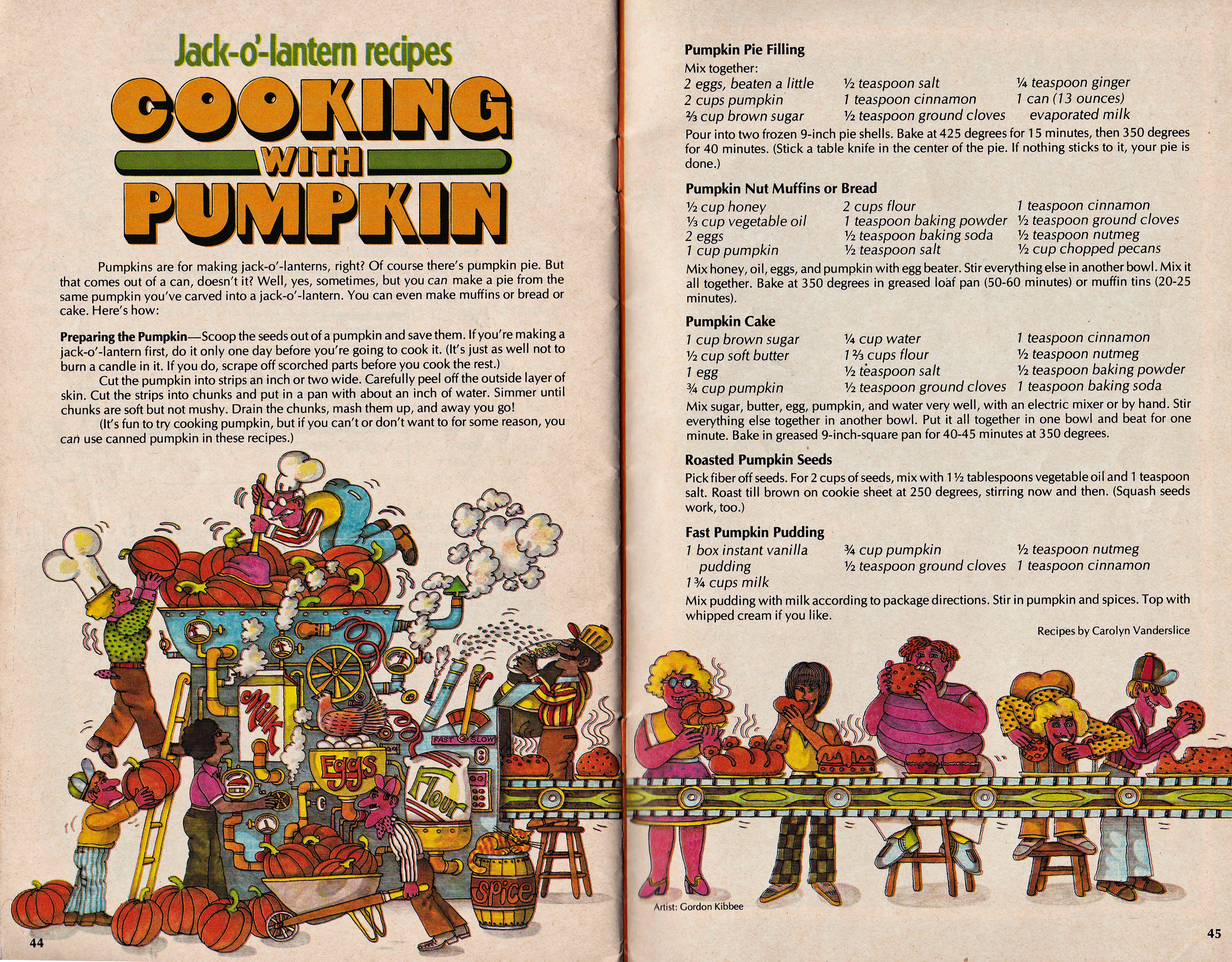 SuperMag was a teen magazine published in the late 1970s and early 1980s. Issue 8 from 1978 included a feature with jack-o’-lantern recipes by Carolyn Vanderslice, with illustrations by Gordon Kibbee. The title is set in bichromatic Fat Albert, with a big round and pumpkin-colored double O, supported by Kabel Condensed.