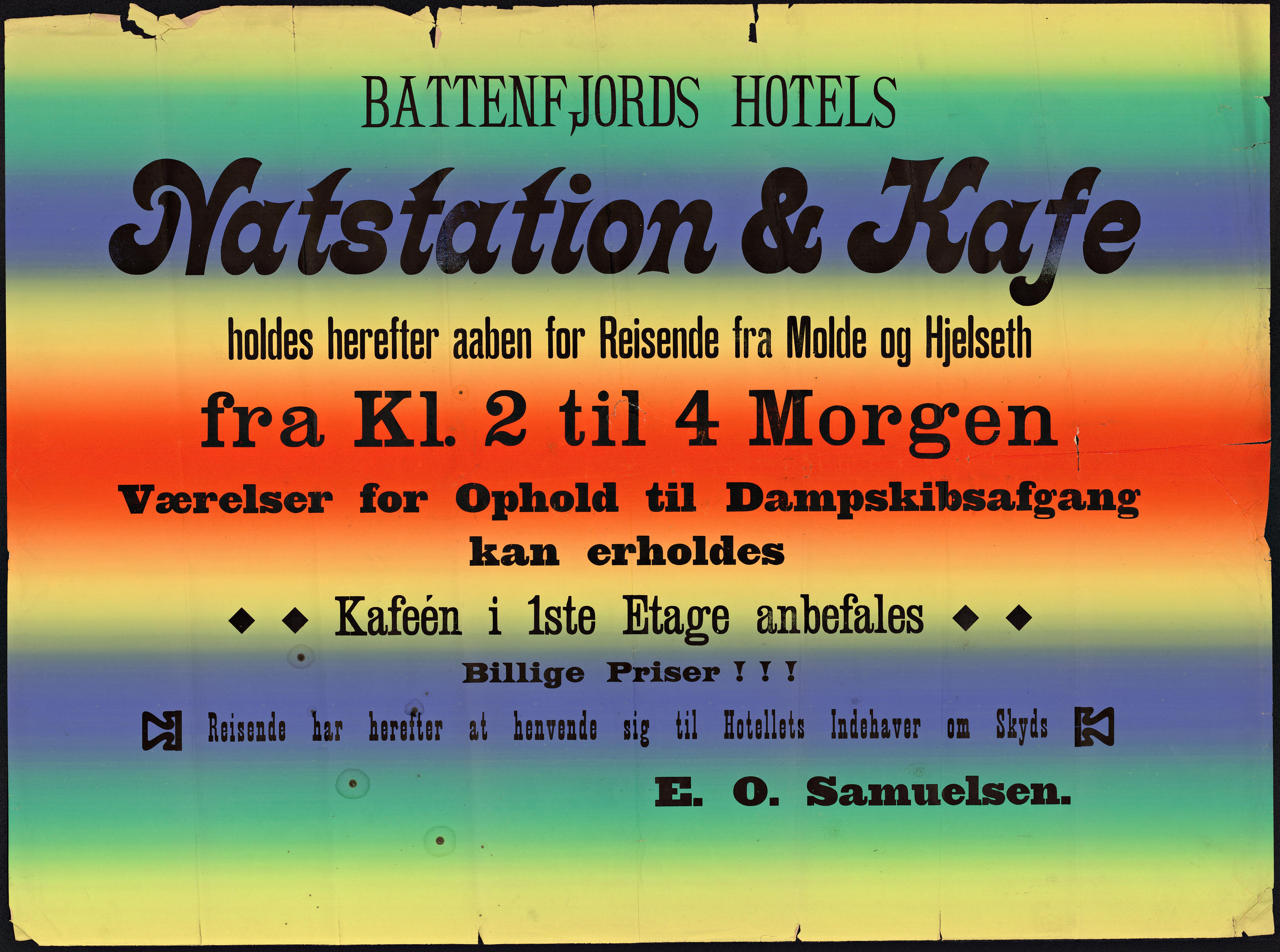 Norwegian poster from the collection of the National Library of Norway promoting early-morning service hours for Battenfjords Hotels Nightstation and Cafe. No date is visible on the poster, but the library dates it to 1909, which seems about right for its typographic style.