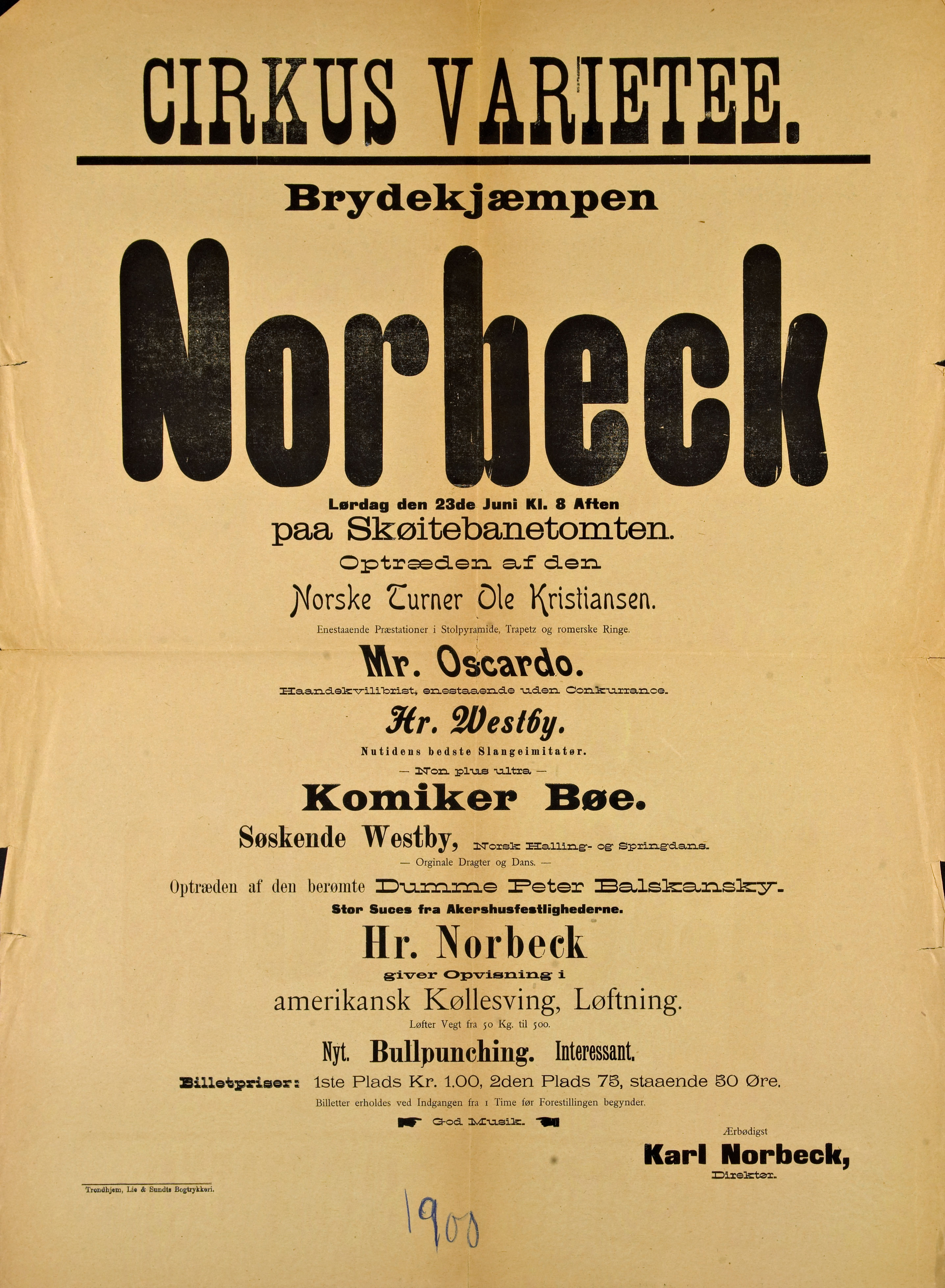 Poster from the collection of the National Library of Norway for an appearance of the circus led by Norwegian wrestler and strongman, Karl Norbeck, with performances that include “Bullpunching”. Someone has written 1900 as a date on the poster, but Norbeck apparently hadn’t purchased his circus until 1904 (the next year with June 23rd falling on a Saturday, as specified on the poster, would have been 1906).