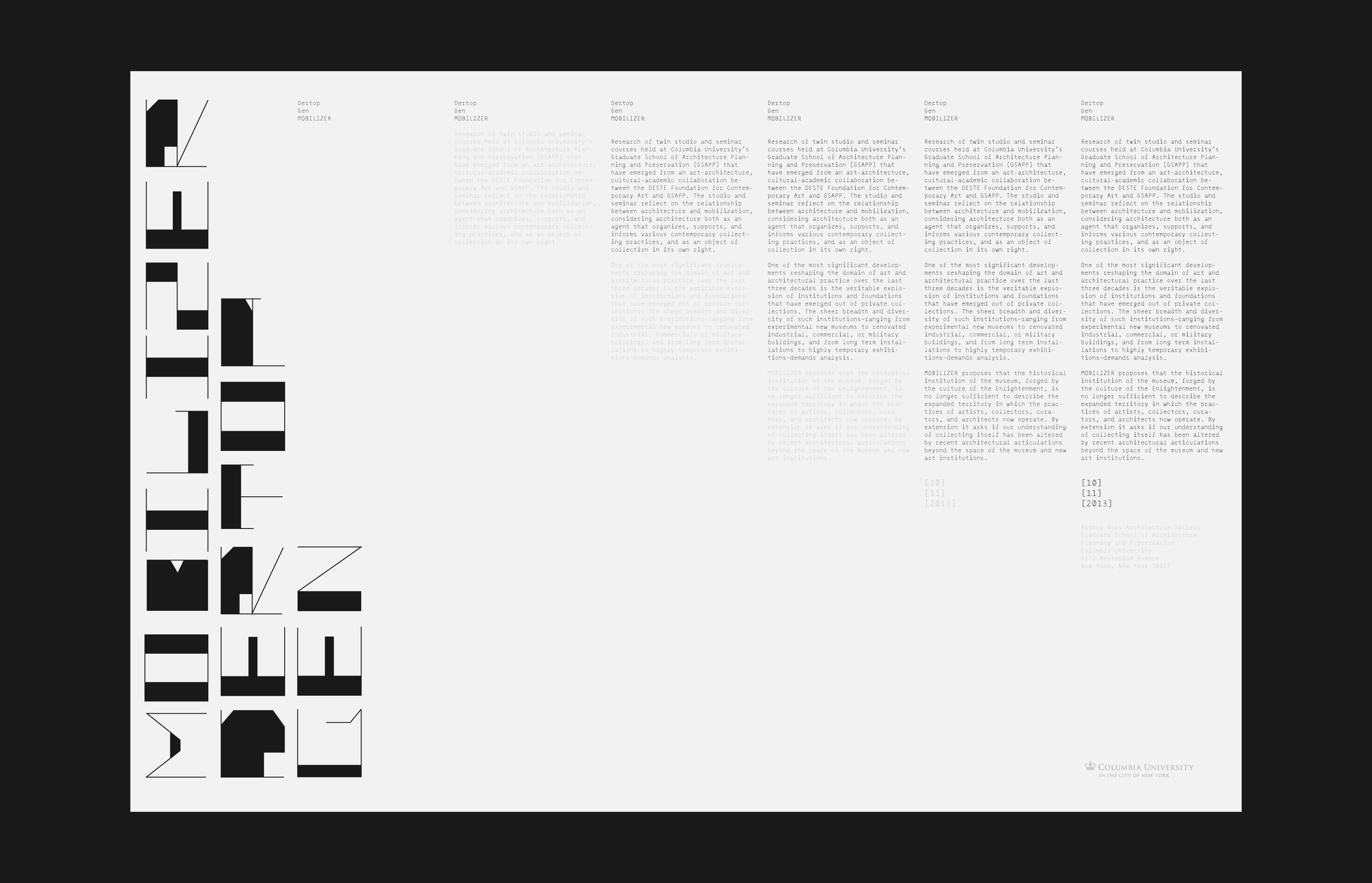 Mobilizer Dertop Gen Poster Contributed by Larry Mayorga on Oct 18th, 2013. Artwork published in 2013. Source: www.meta-matic.com Metamatic. License: All Rights Reserved. Lecture poster with a bespoke typeface for the Columbia University School of Architecture Source: www.meta-matic.com Metamatic. License: All Rights Reserved. Typefaces More about MonoxilGet Monoxil Formats Posters/Flyers (5831) Topics Architecture (1433) Art (4747) Designers/Agencies Metamatic (3) Tagged witharchitecture (526)art exhibitions (880)lectures/talks (149)Columbia University School of Architecture (1)posters (1431)monospaced (1259) Artwork location United States (10001) New York City (2949) In Setschild theme (Alyson Floyd) (4)Card (Amani Wade) (25)bb (Leonardo de la Fuente) (1331) Post a comment Name Email – will not be published Website Your response Submit Comment More in Architecture Chroniques de géo’ virale by Michel Lussault2020Bureau 205Contributed by 205TF Staff Pick Strelka Institute2012OK-RMContributed by Ryan Fernandez Staff Pick La Bocciofila2024Pietro CodaContributed by Michele Galluzzo Sponsor More in Posters/Flyers The Old Man and the Sea (1958) movie posters1958Bill GoldGustav RehbergerContributed by Florian Hardwig Staff Pick Pearl Jam at Hyde Park concert poster2022Pedro CorreaContributed by Erica Jung Staff Pick Hongaarse konstruktivistische kunst, 1920–1977 catalog and poster1978Daphne DuijvelshoffContributed by Stephen Coles Circular Calendar2018Polar, Ltda.Contributed by Polar, Ltda. More Fonts In Use 4 Minnesota Ceramicists poster1976Mark SimonsonContributed by Mark Simonson Staff Pick Adana Twins 16/172016EGYDContributed by EGYD Staff Pick Respect magazine, issue 062023ZooBlanche BlatterQuentin CholleyContributed by Michael Clasen Staff Pick Don Café neon sign2012Contributed by Roland Hörmann Staff Pick This Is (Nicolas Roberti)2011DesignPracticeContributed by Stephen Coles Staff Pick The Bluest Eye by Toni Morrison (Holt, Rinehart and Winston)1970Herb LubalinJay TribichContributed by Florian Hardwig Staff Pick L’artiste et le vivant by Valérie Belmokhtar2022Philippe BrulinContributed by VJ-Type Staff Pick Surbanalisme. Séquences photographiques de Bernard Plossu1972Jacques MaillotContributed by Stephen Coles Staff Pick