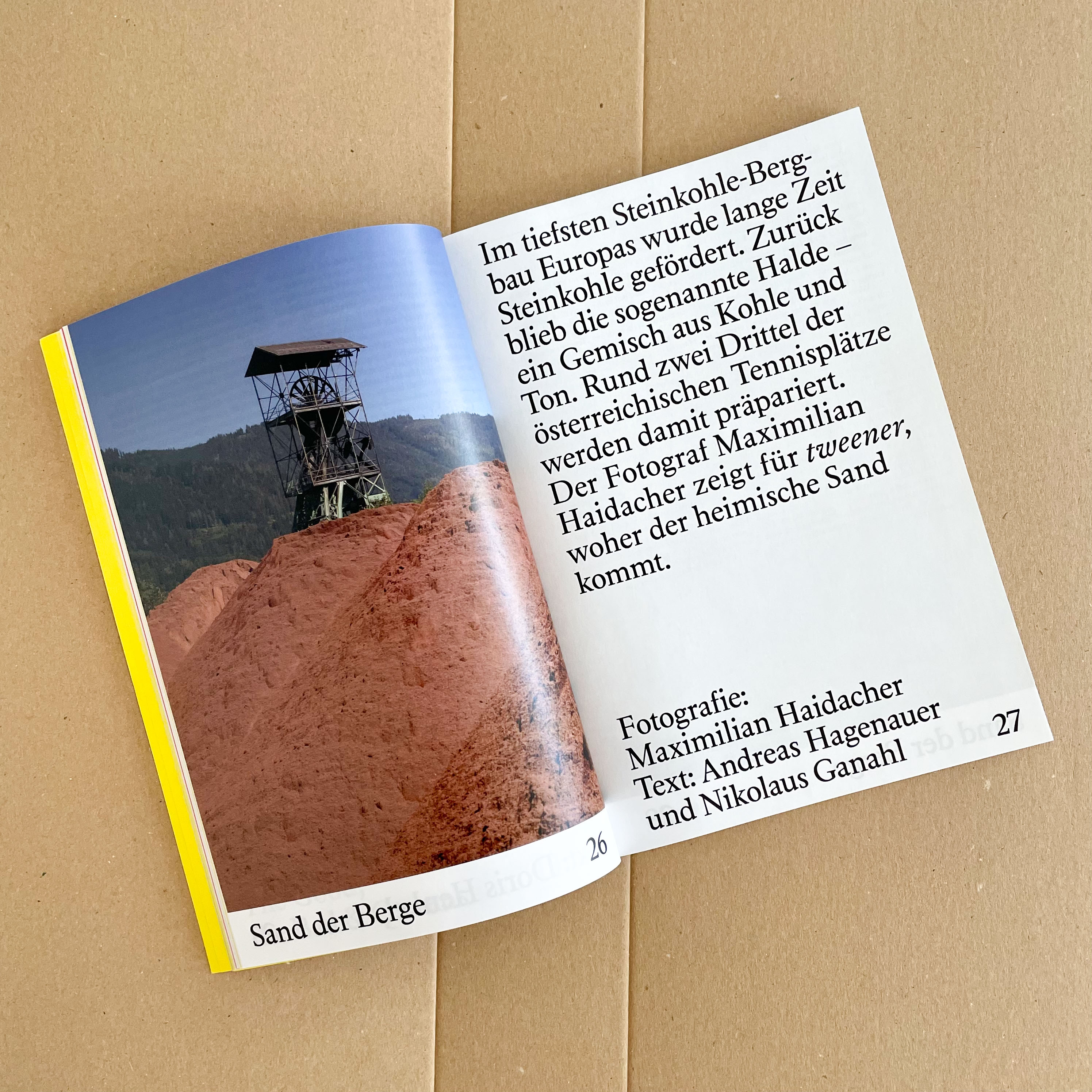 tweener will be quite different from other sports magazines. The internet is a quicker and more direct source for daily reports about events in this top-class sport. Paper may be patient, but tennis fans certainly aren’t. tweener offers stories and perspectives that will still have something to say years later. For example: a report about the wicked concrete courts in Vienna’s Donaupark; a series of photos (taken by Maximilian Haidacher) about a Styrian quarry that provides a large part of the sand used for tennis in Austria; a witty reckoning with sports clubs by Christoph Grissemann; a self-observation about failing in tennis as a hobby player by Tobias Pötzelsberger; a look into the bag of Nico Langmann, who is a professional tennis player in a wheelchair; a nutrition recommendation by Lukas Mraz, one of the best cooks in the country. This is the first service of tweener magazine. Welcome!