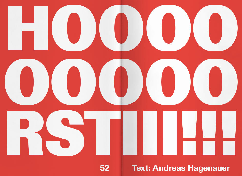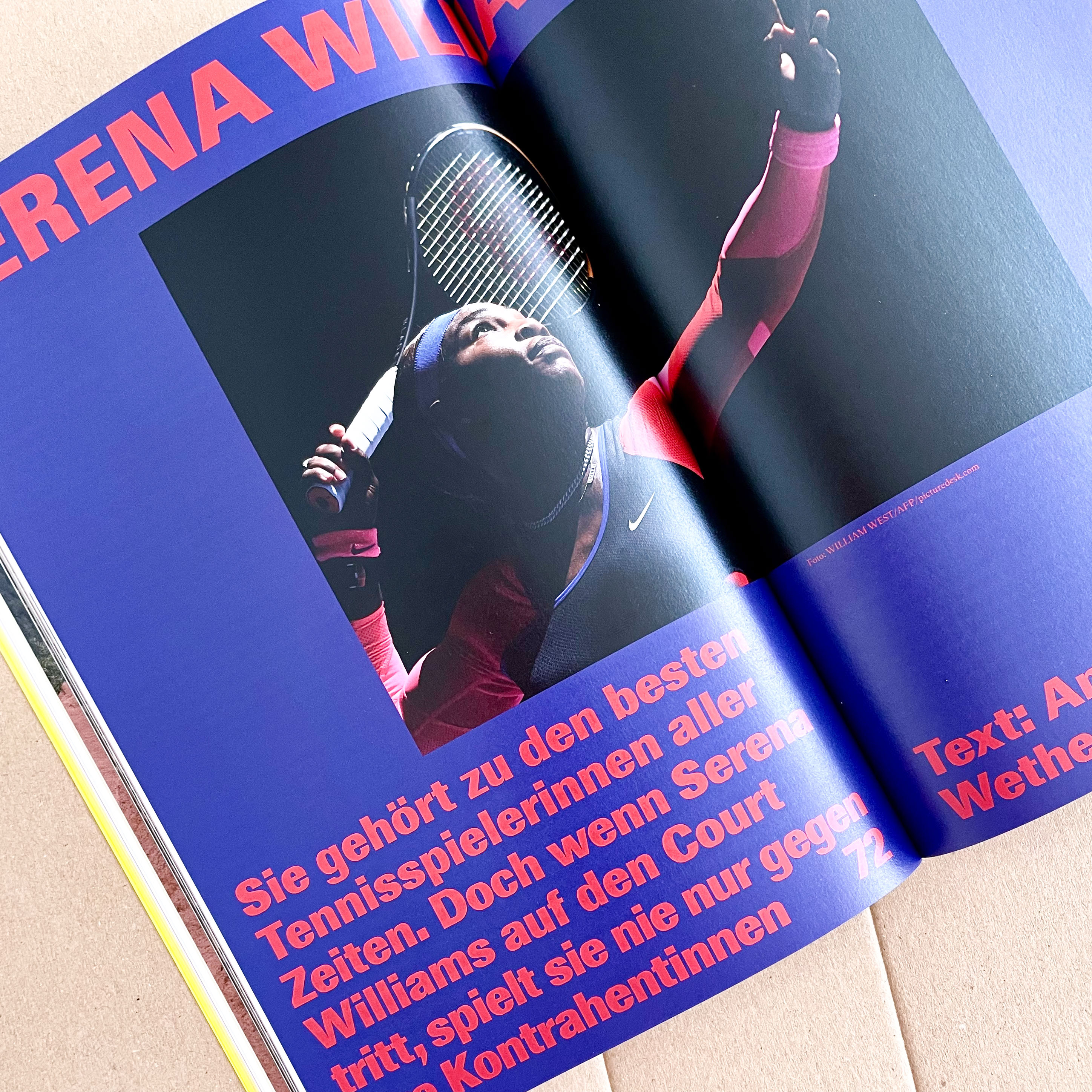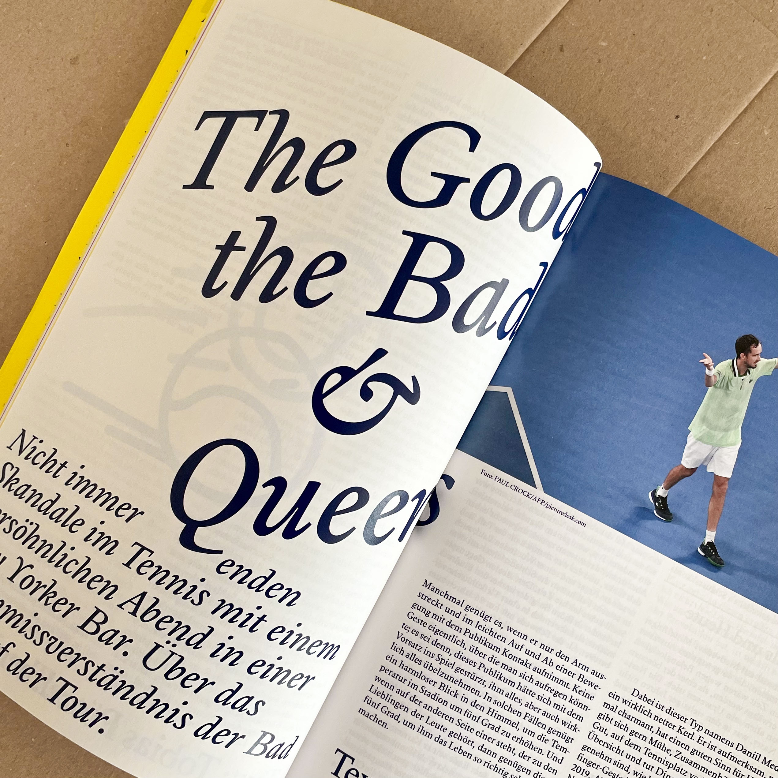 The format and paper of the magazine are very handy, which invites for long reading, whether on the subway or on the sofa. Elaphus was used mainly for the running text, Flatspot for the large lead texts. The heavy type weights allow you to cheer between the classic layouts, just as you give free rein to your emotions between rallies on the tennis court.