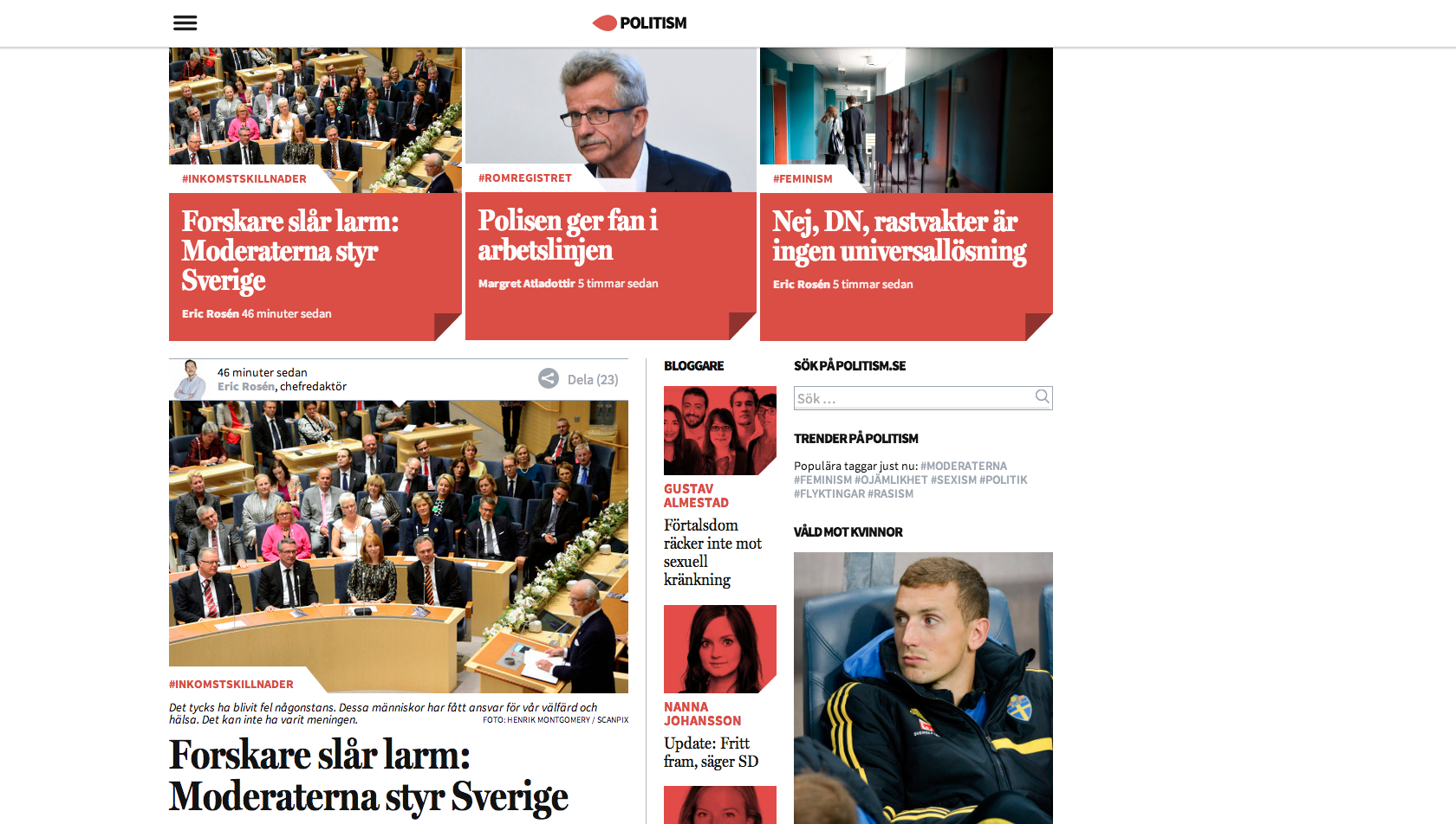 Politism.se Contributed by Patch Hofweber on Nov 5th, 2013. Artwork published in 2013. Source: politism.se © Aftonbladet AB. License: All Rights Reserved. Politism is a leftist news site run by the political editorial staff at Aftonbladet. Typefaces More about MillerGet MillerMore about Source SansGet Source Sans Formats Web (5513) Topics News (550) Politics (840) Designers/Agencies Fredrik Wärnsberg (1) Christoffer Larsson (1) Tagged withresponsive (165)politics (25)webfonts (449)Swedish (language) (162) Artwork location Sweden (434) In SetsWebtype (Webtype) (241) Post a comment Name Email – will not be published Website Your response Submit Comment More Miller in use Imagine Democratic Regeneration2024Theresa HattingerContributed by Theresa Hattinger An Unbelievable Story of Rape2015David SleightRobert WeychertAndy RossbackContributed by Stephen Coles Staff Pick St. Katharine Docks, London quarterly newsletterClarke CribbContributed by Clarke Cribb Sponsor More in News Radio Free Europe/Radio Liberty website2021unknownContributed by Eben Sorkin Linkiesta paper2020Paper PaperGiovanni CavalleriContributed by Giovanni Cavalleri The New Review2015Shazia ChaudhryContributed by Shiva Nallaperumal Ich lese dich websitec. 2014MOTOR KommunikationContributed by Webtype More in Web Isaac Fayemi – Group 256 portfolio website2022Studio NullContributed by Isaac Fayemi Matteo Sacchi portfolio2018Matteo SacchiContributed by Matteo Sacchi Frizbowl website2024FrizbowlContributed by Darden Studio CellarSpace2022Swear WordsContributed by NaN Staff Pick More Fonts In Use Memphis River Parks Partnership2018The Original Champions of DesignJennifer KinonTalia CottonContributed by Ciarán Staff Pick King Curtis – The New Scene of King Curtis album art1960Esmond EdwardsPhoto(s) by Bart Solenthaler on Flickr. Staff Pick “Black is Beautiful.” ad for Vince Cullers Advertising1968Vince Cullers AdvertisingEmmett McBainContributed by Stephen Coles Staff Pick Fleurop Germanyc. 2015unknownContributed by Florian Hardwig Staff Pick