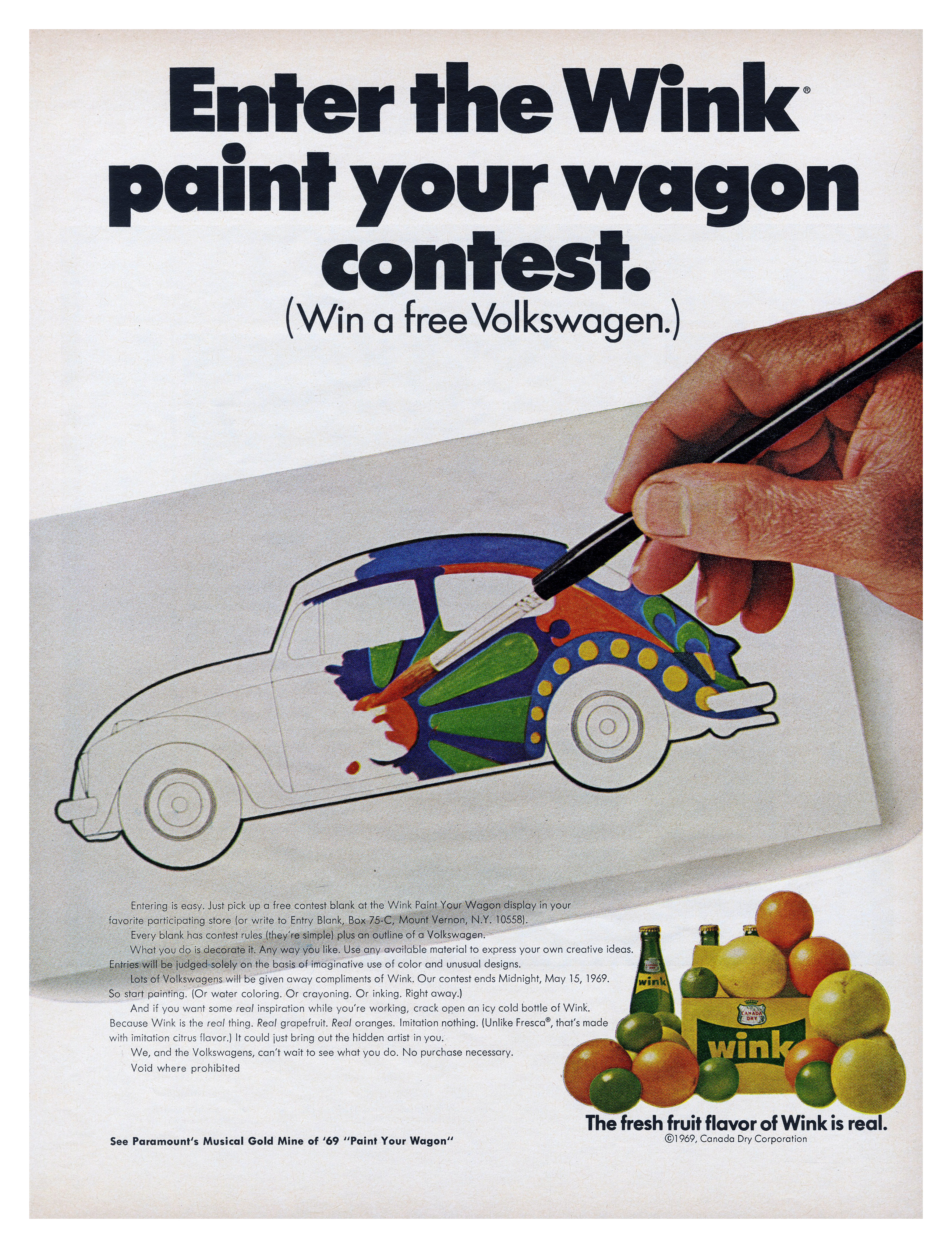 Entering is easy. Just pick up a free contest blank at the Wink Paint Your Wagon display in your favorite participating store (or write to Entry Blank, Box 75-C, Mount Vernon, N.Y. 10558). Every blank has contest rules (they’re simple) plus an outline of a Volkswagen. What you do is decorate it. Any way you like. Use any available material to express your own creative ideas. Entries will be judged solely on the basis imaginative use of color and unusual designs. Lots of Volkswagens will be given away compliments of Wink. Our contest ends Midnight, May 15, 1969. So start painting. (Or water coloring. Or crayoning. Or inking. Right away.) And if you want some real inspiration while you’re working, crack open an icy cold bottle of Wink. Because Wink is the real thing. Real grapefruit. Real oranges. Imitation nothing. (Unlike Fresca®, that’s made with imitation citrus flavor.) It could just bring out the hidden artist in you. We, and the Volkswagens, can’t wait to see what you do. No purchase necessary. Void where prohibited