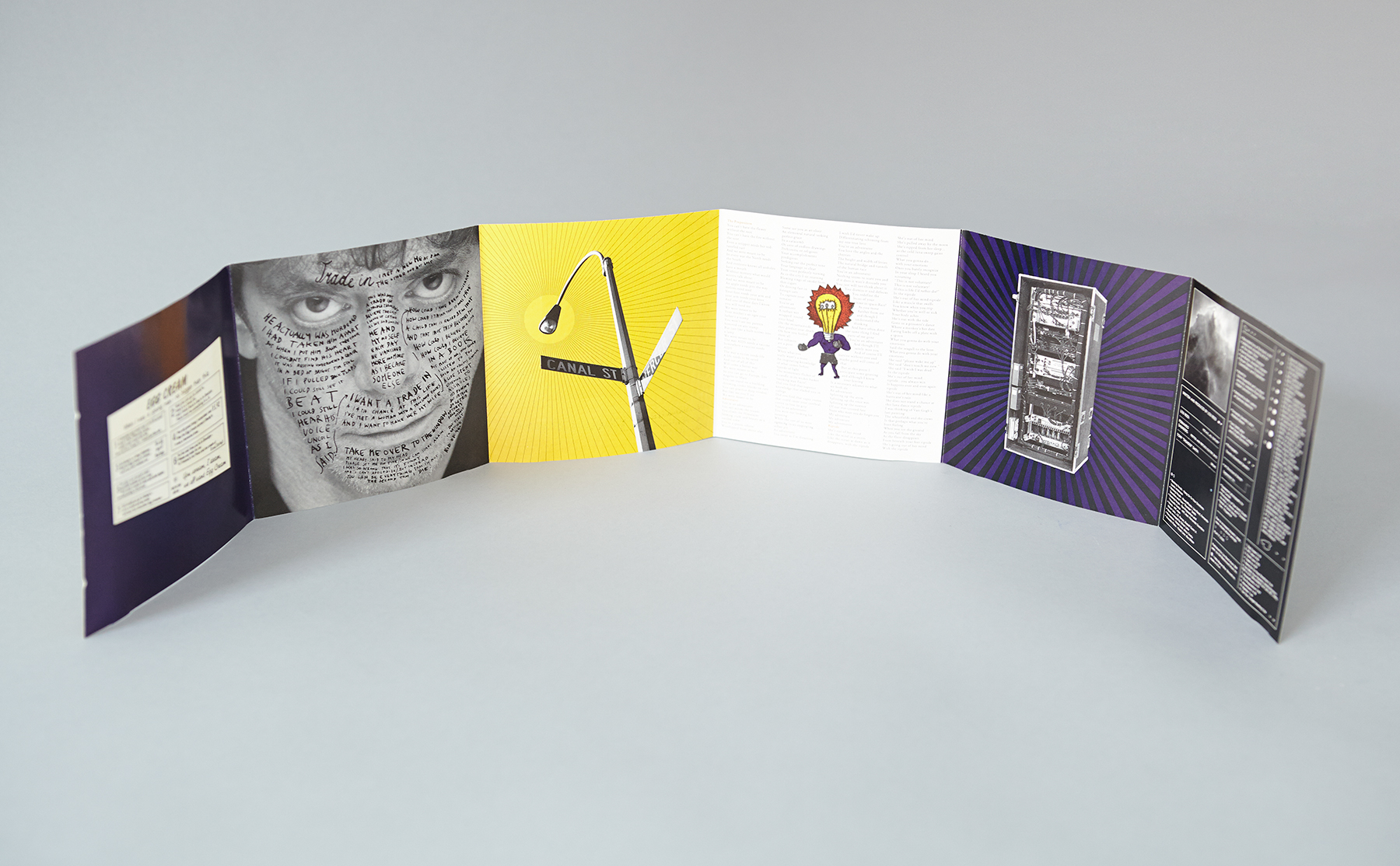 This CD design by Sagmeister Inc. is not as famous as the hand lettered poster that promoted the album, but it’s striking in its own right. It came in a transparent blue jewel case containing a contrasting yellow booklet cover. I enjoy the irreverant back side of the booklet with its celestial symbology (including Astroids!) and playful copy, like…