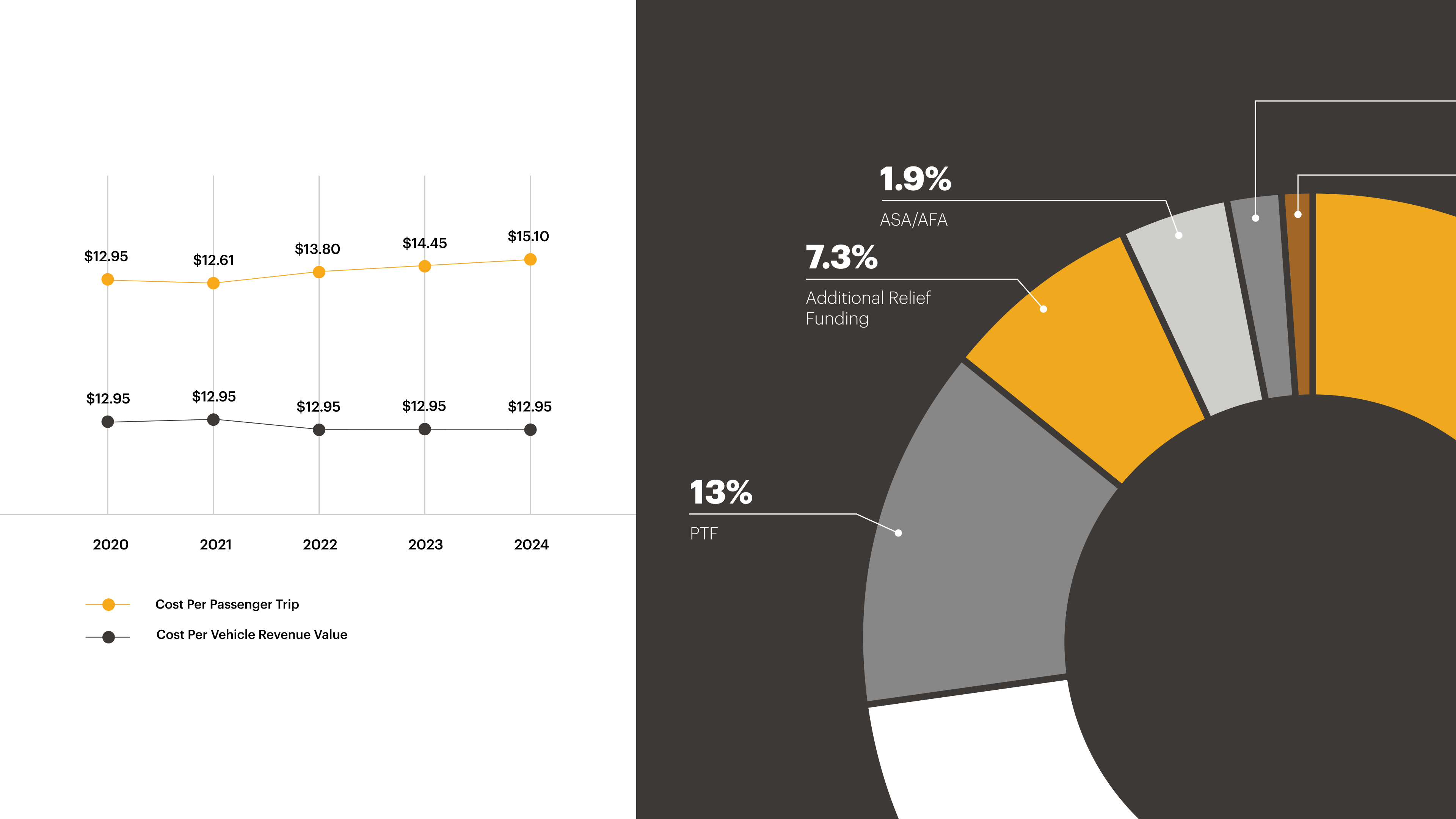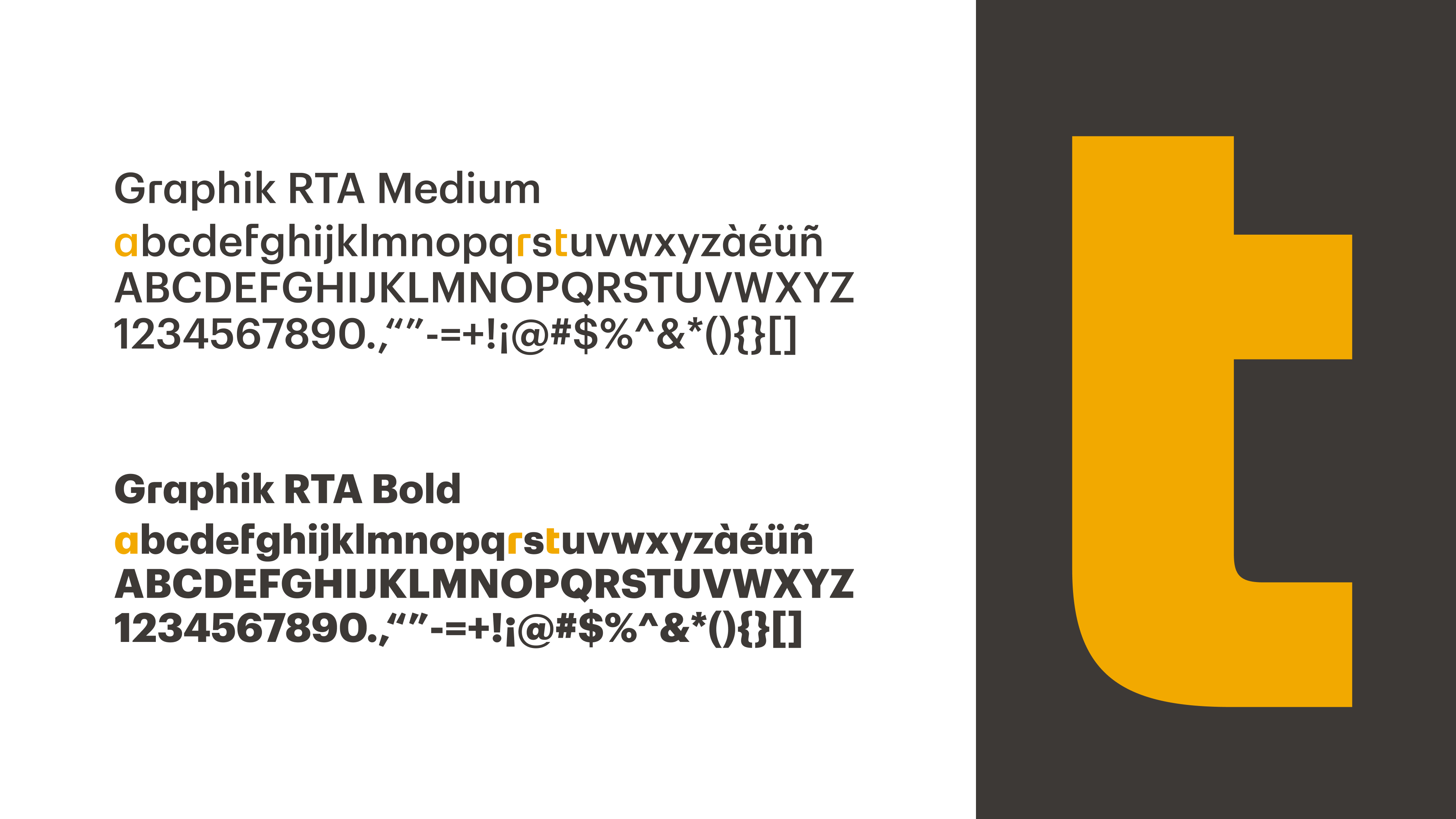 The logo is a solid monogram reflecting speed and strength with an ”overline” running through the characters like a train or bus pulling into the station. The typography is a customized version of Graphik by Commercial Type, a hard-working sans serif typeface selected for maximum recognition, with modified r, t, and a characters, to better align with the visual language of the logo itself. The color palette is focused, using combinations that are ADA-compliant up to level AA+. Illustrative transit paths as well as an icon suite add additional visual expressions to represent all aspects of life around transit.