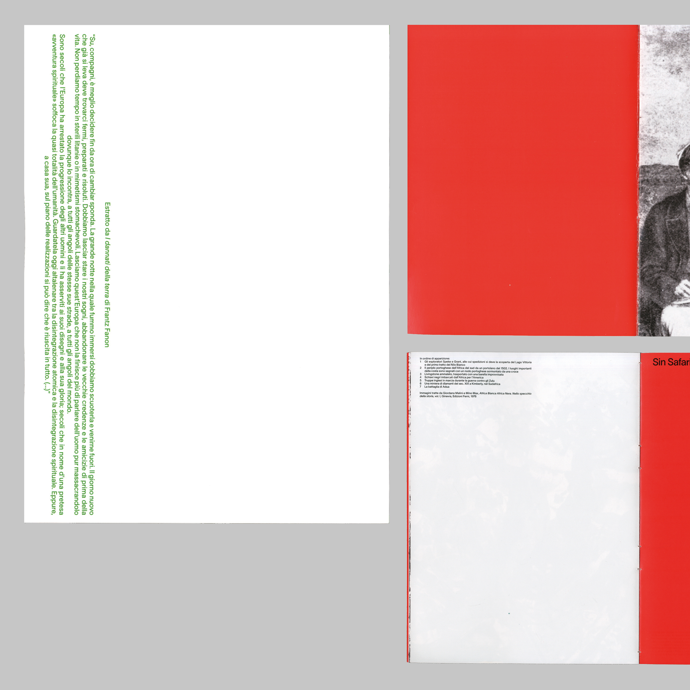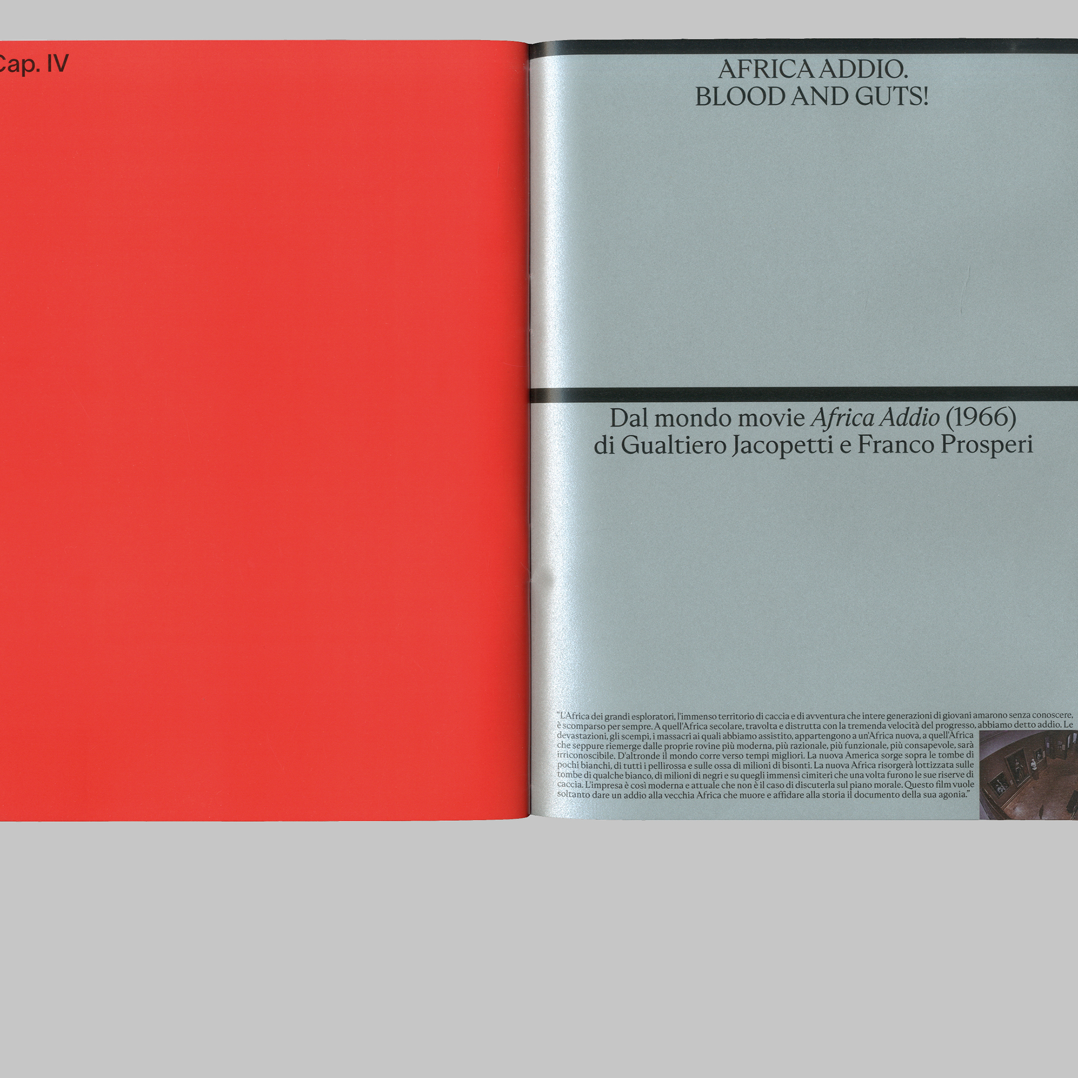 Sin Safari Rides is a book that brings together essay extracts and authentic visual material on the subject of colonialism and post-colonialism, focusing specifically on the African experience. Here, the digital postcard collection Kolonialismus und Afrikanische Diaspora auf Bildpostkarten attempts to open a dialogue with the photographic re-editing of the Mondo Movie Africa Addio, one of the rarest surviving testimonies of what were the darkest years of post-colonial Africa.