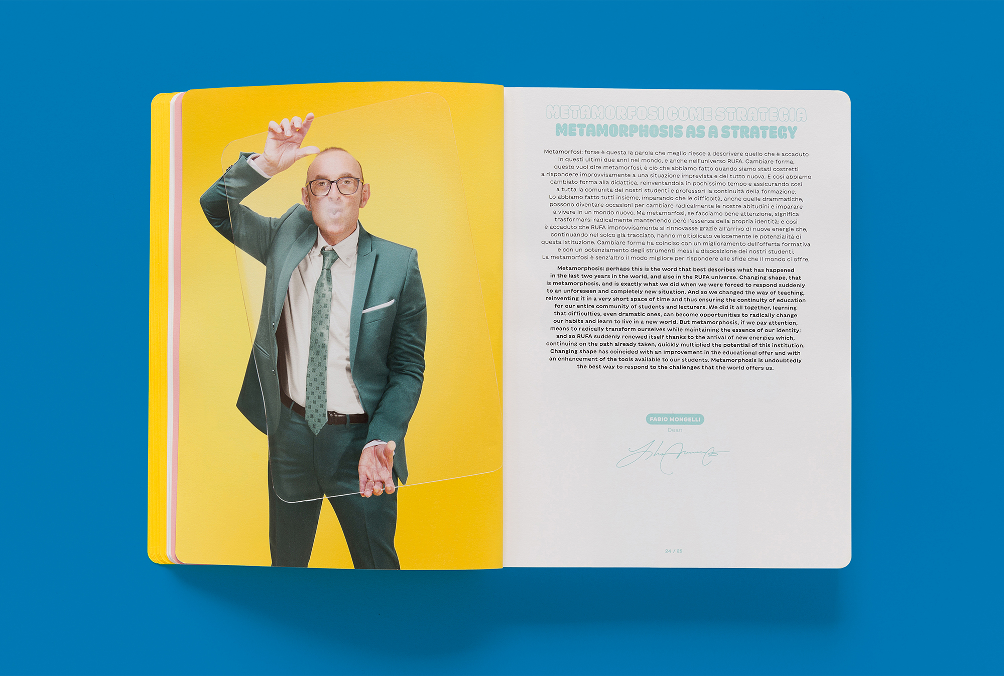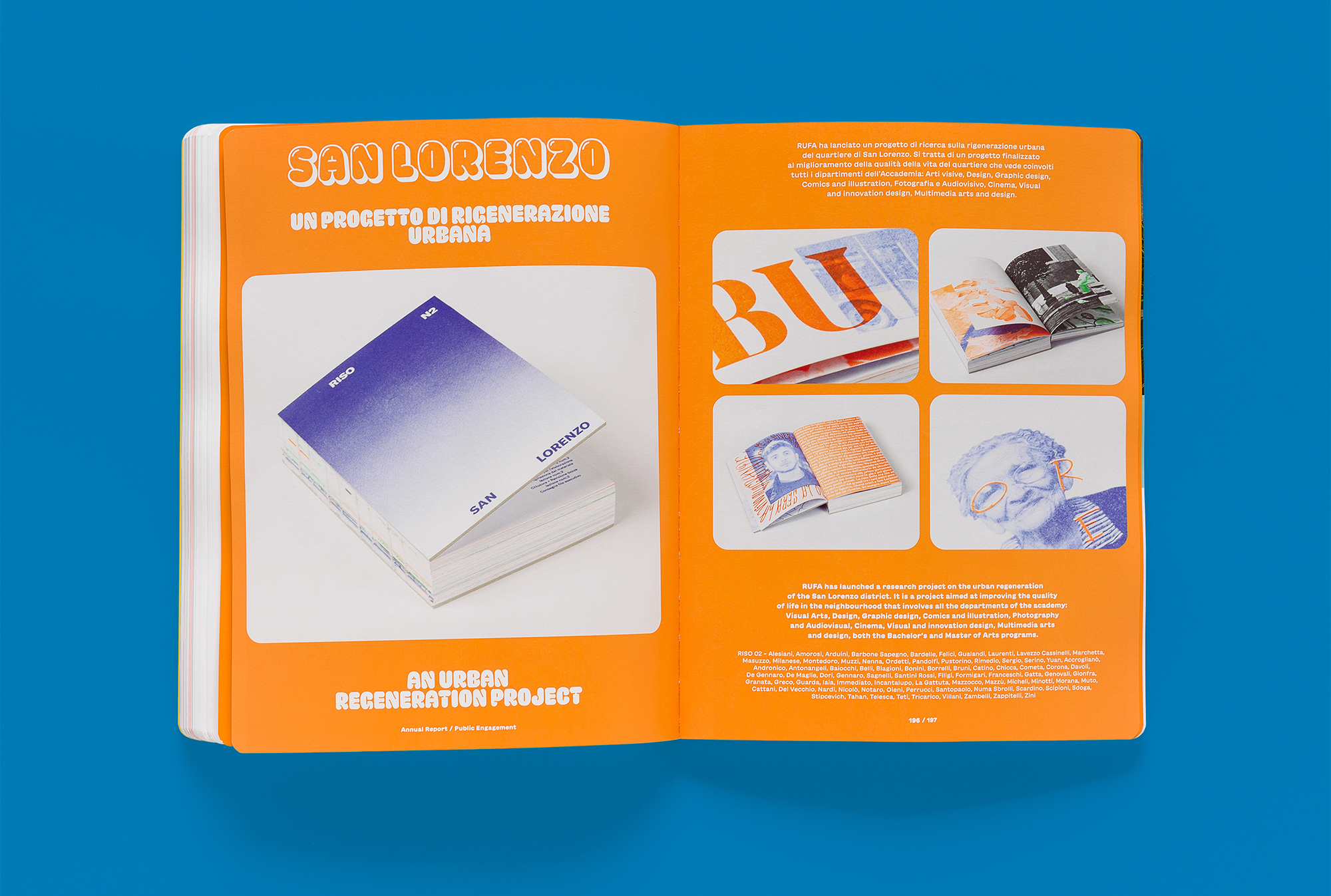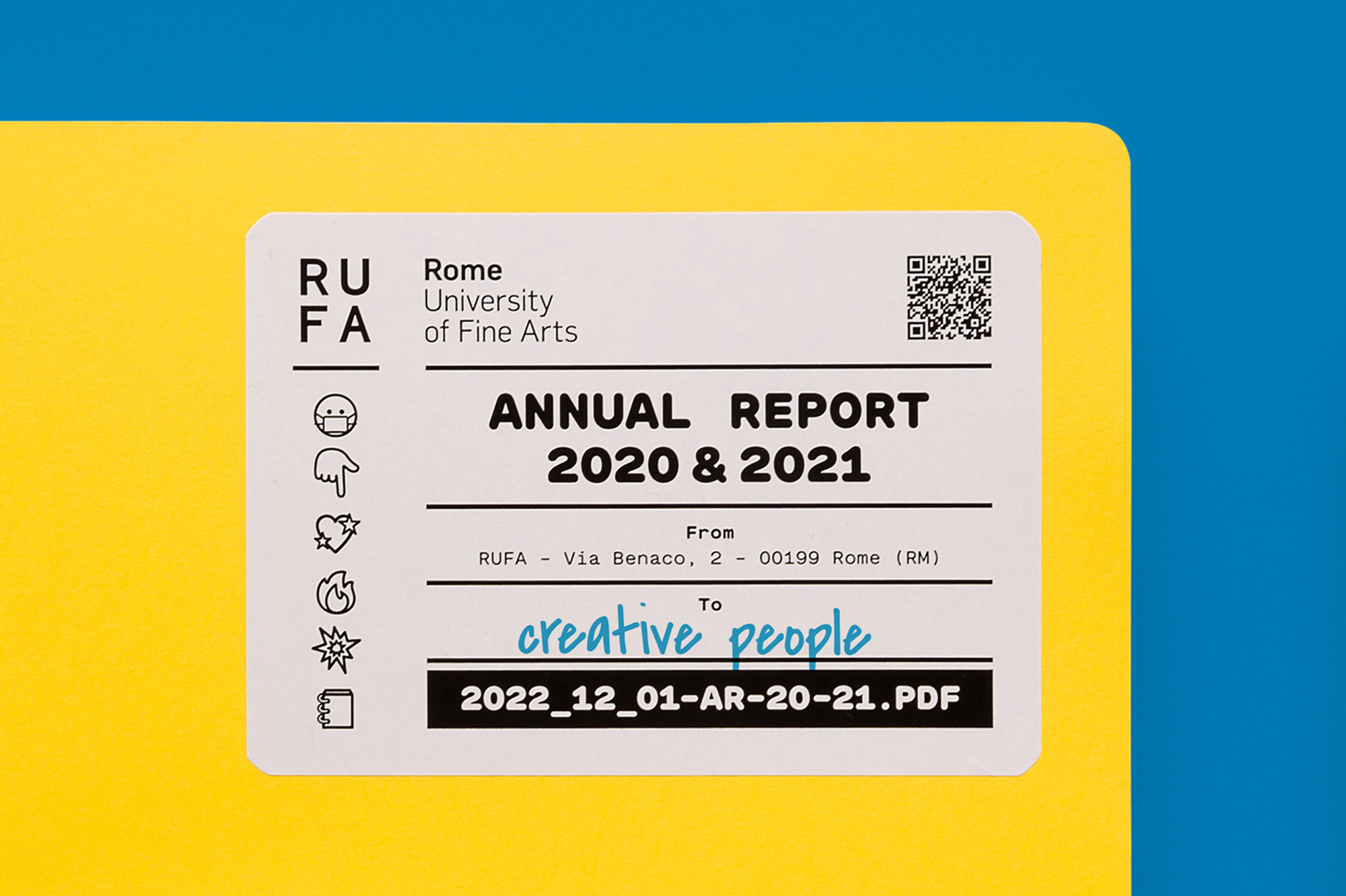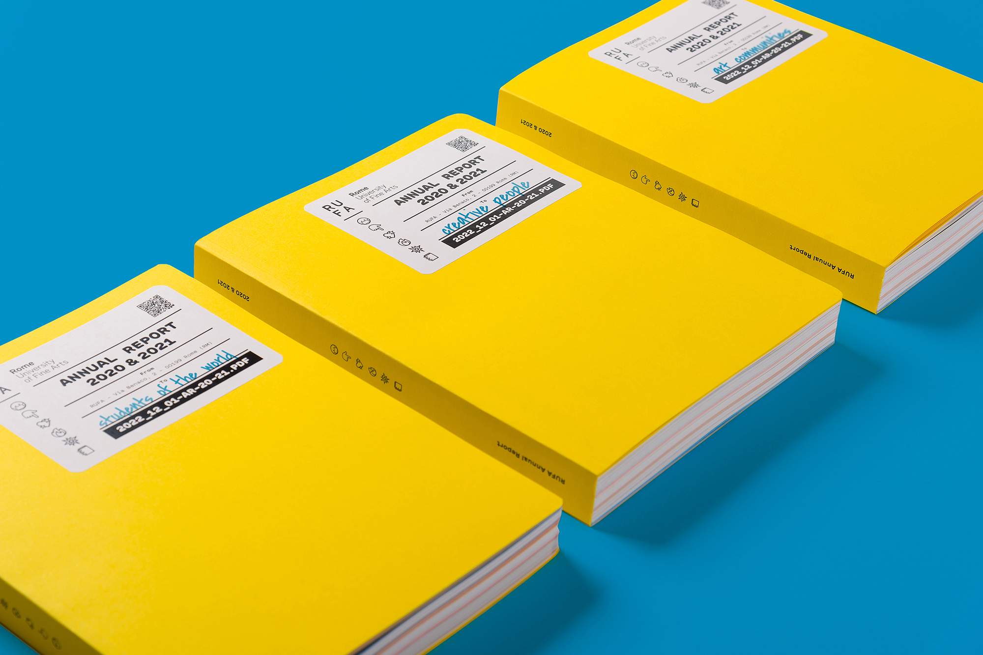 The sixth RUFA annual report, designed by Intorno Design (Guido Lombardo, Roberta De Cristofaro, Fabrizio Crollari), presents the two-year period 2020–2021 as a single temporal unit, the time of COVID-19, the narrative of a year made up of 24 months and 320 pages, the most voluminous academic report to date. The graphic, photographic, and illustrative choices respond to the horror vacui generated by the pandemic and recall the artifices, physical or digital filters, that society has chosen to adopt as tools to stem the contagion. The variety and saturation of the chromatic tones serve as a sort of artistic compensation: having lost the warmth (human, relational, vital), we return it and compensate it in the form of color.