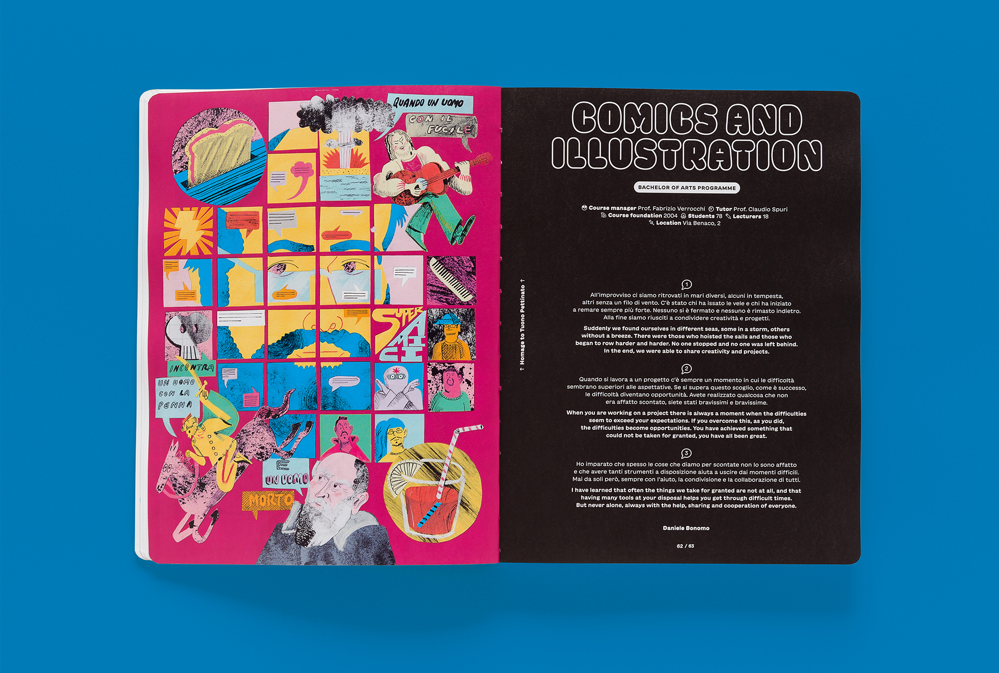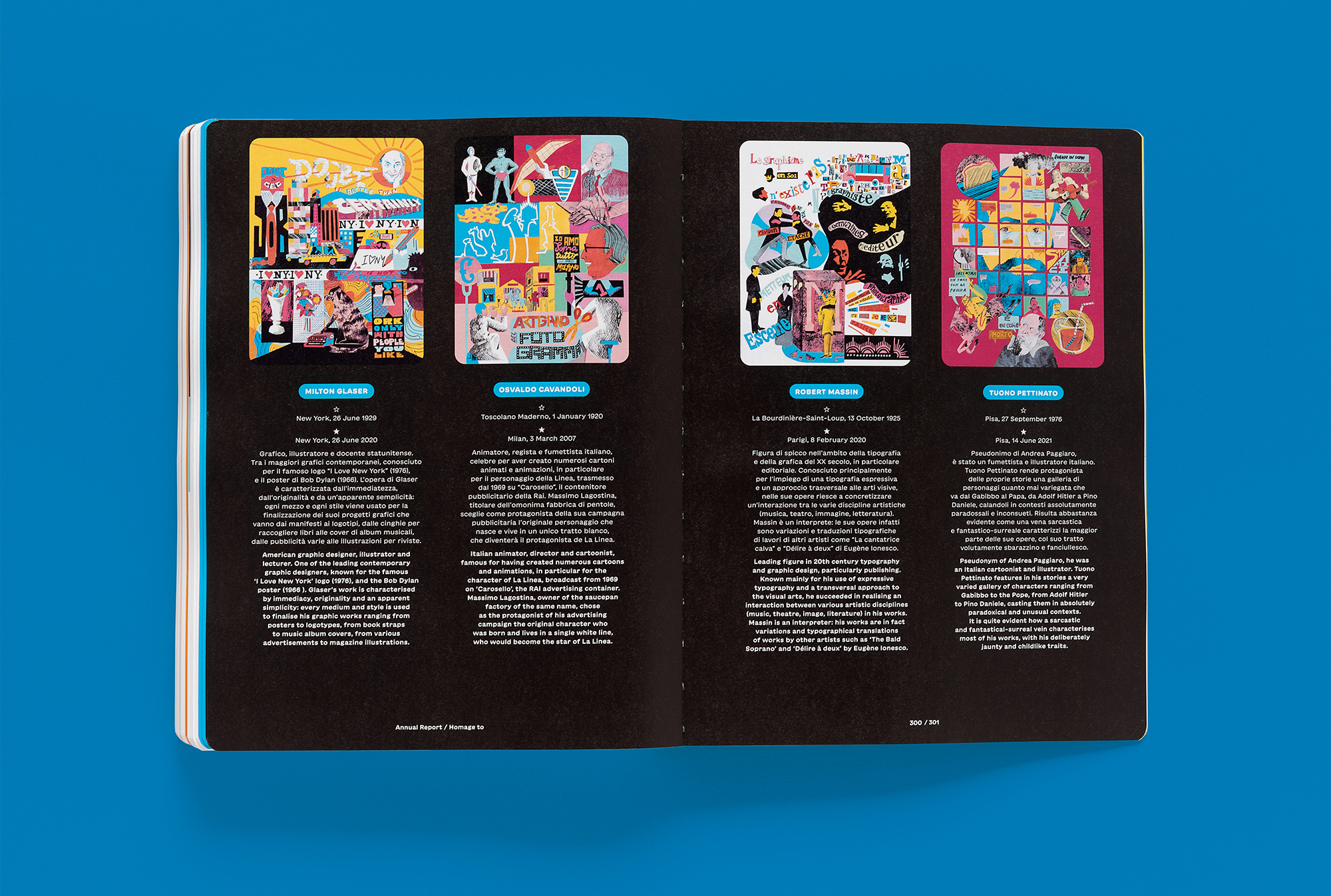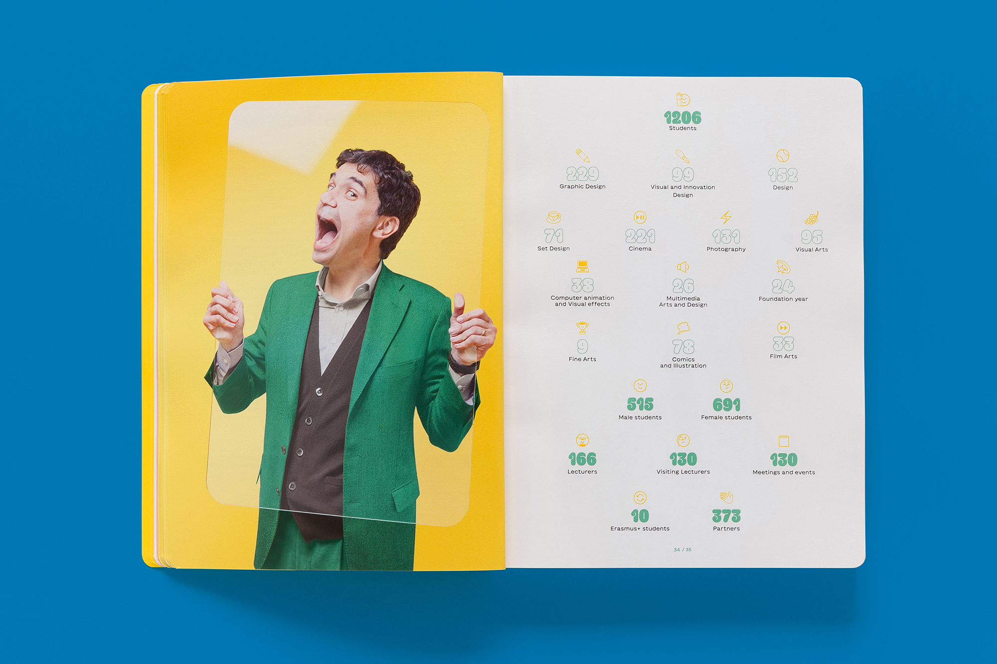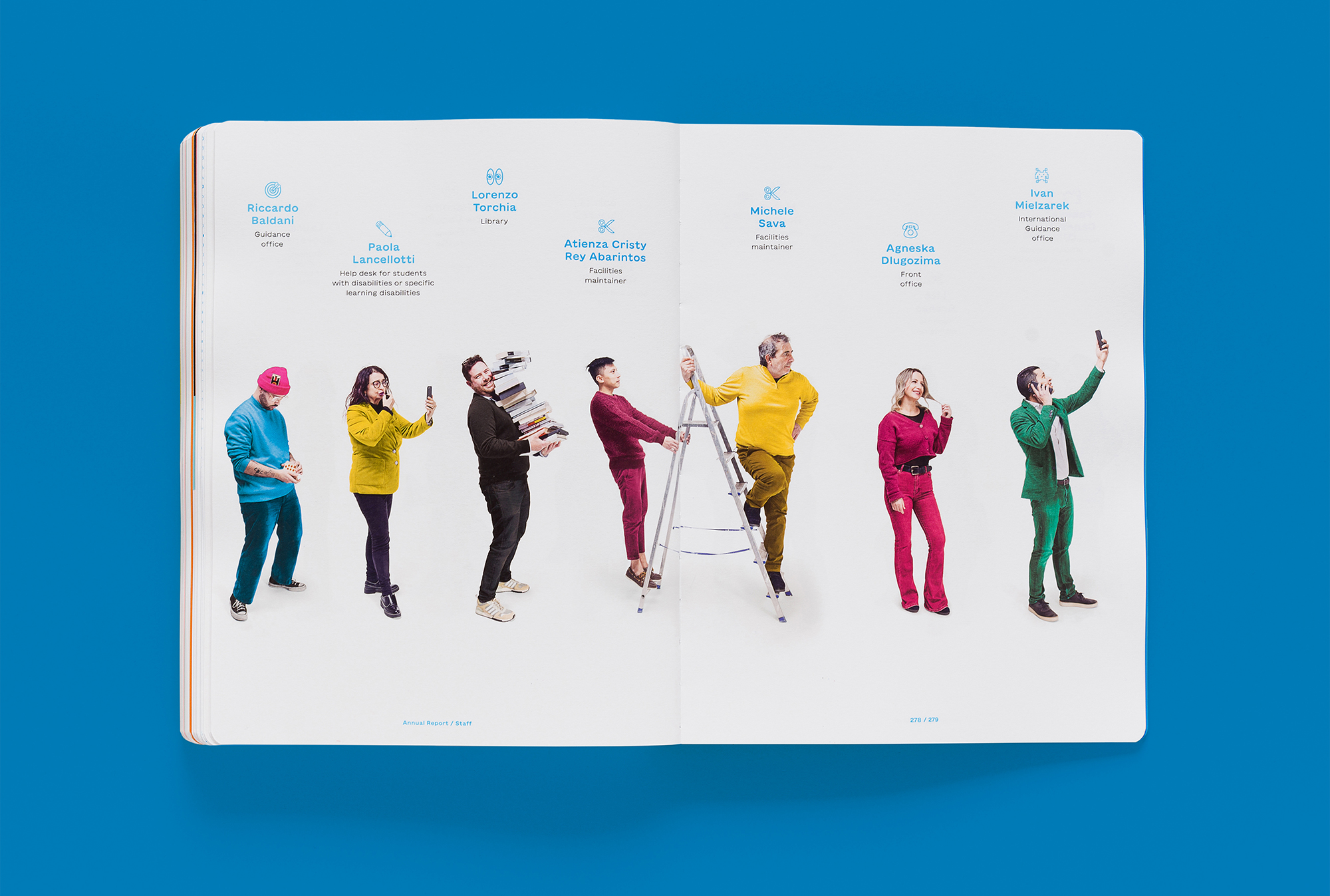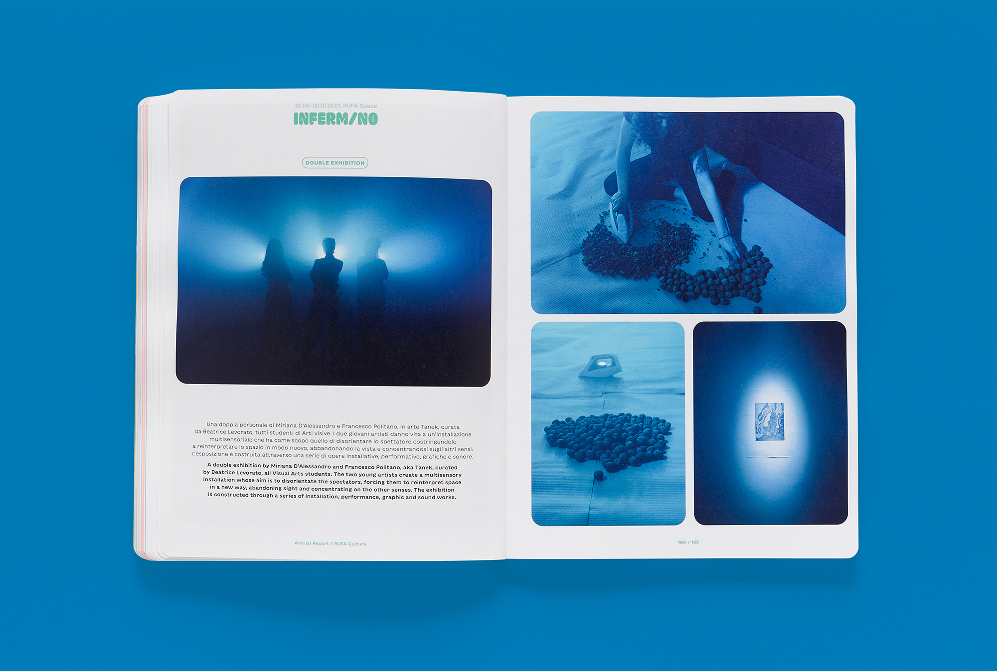 The sixth RUFA annual report, designed by Intorno Design (Guido Lombardo, Roberta De Cristofaro, Fabrizio Crollari), presents the two-year period 2020–2021 as a single temporal unit, the time of COVID-19, the narrative of a year made up of 24 months and 320 pages, the most voluminous academic report to date. The graphic, photographic, and illustrative choices respond to the horror vacui generated by the pandemic and recall the artifices, physical or digital filters, that society has chosen to adopt as tools to stem the contagion. The variety and saturation of the chromatic tones serve as a sort of artistic compensation: having lost the warmth (human, relational, vital), we return it and compensate it in the form of color.