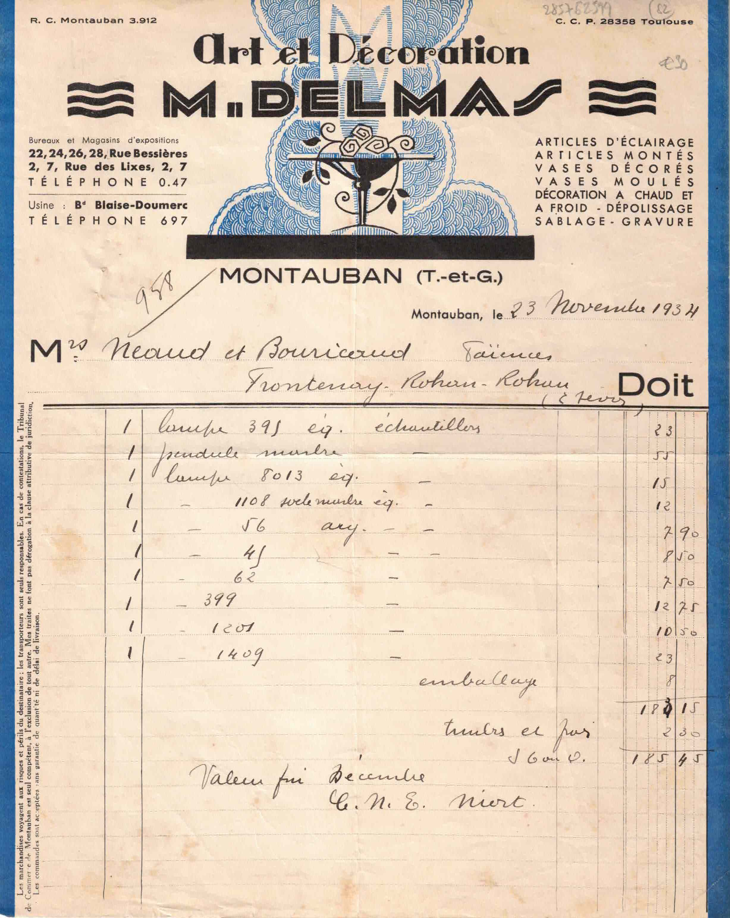 A beautiful invoice used in 1934 by Art et Décoration M. Delmas, a manufacturer and retailer of lighting, vases, and other decorative articles, located in Montauban, southern France.