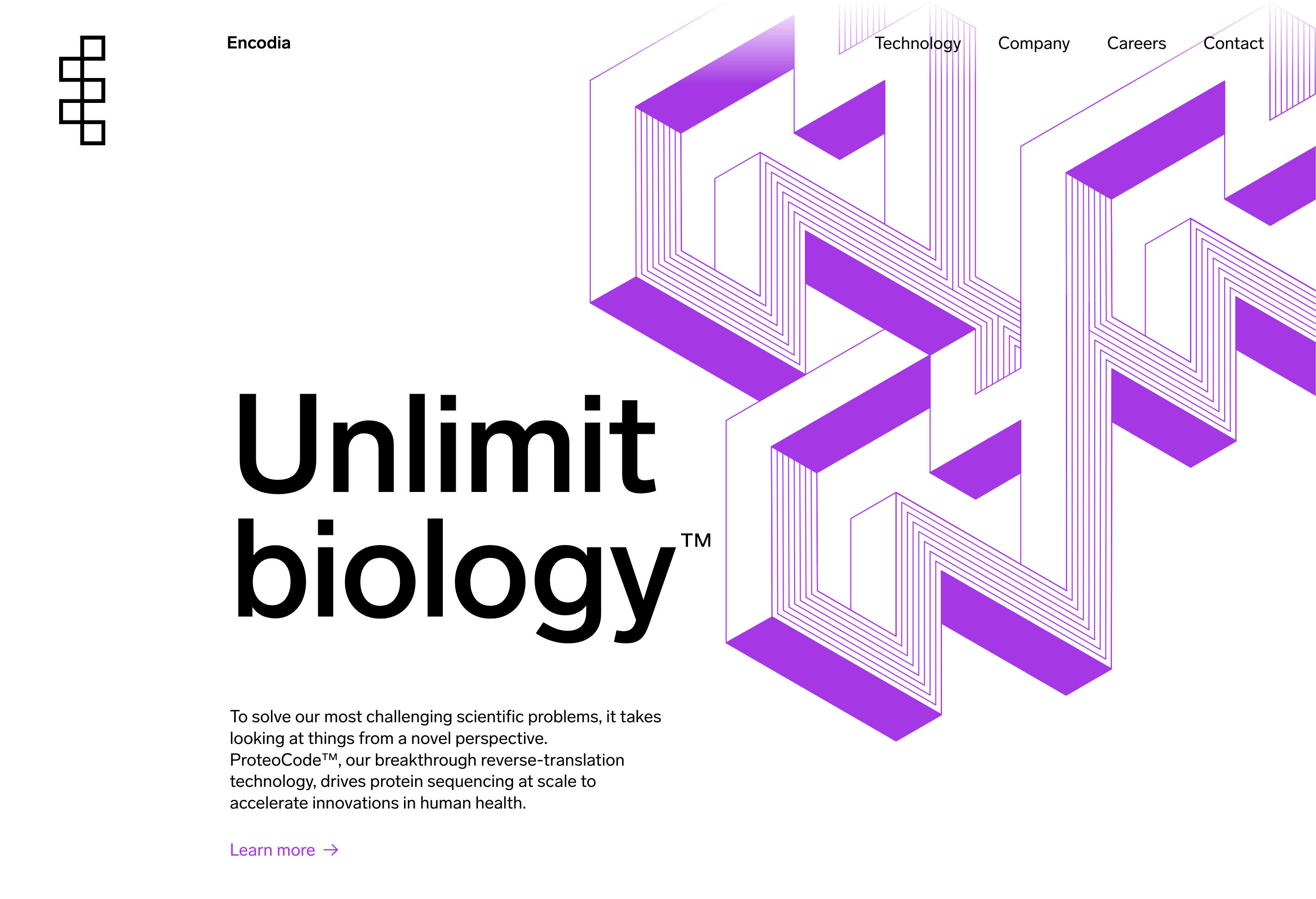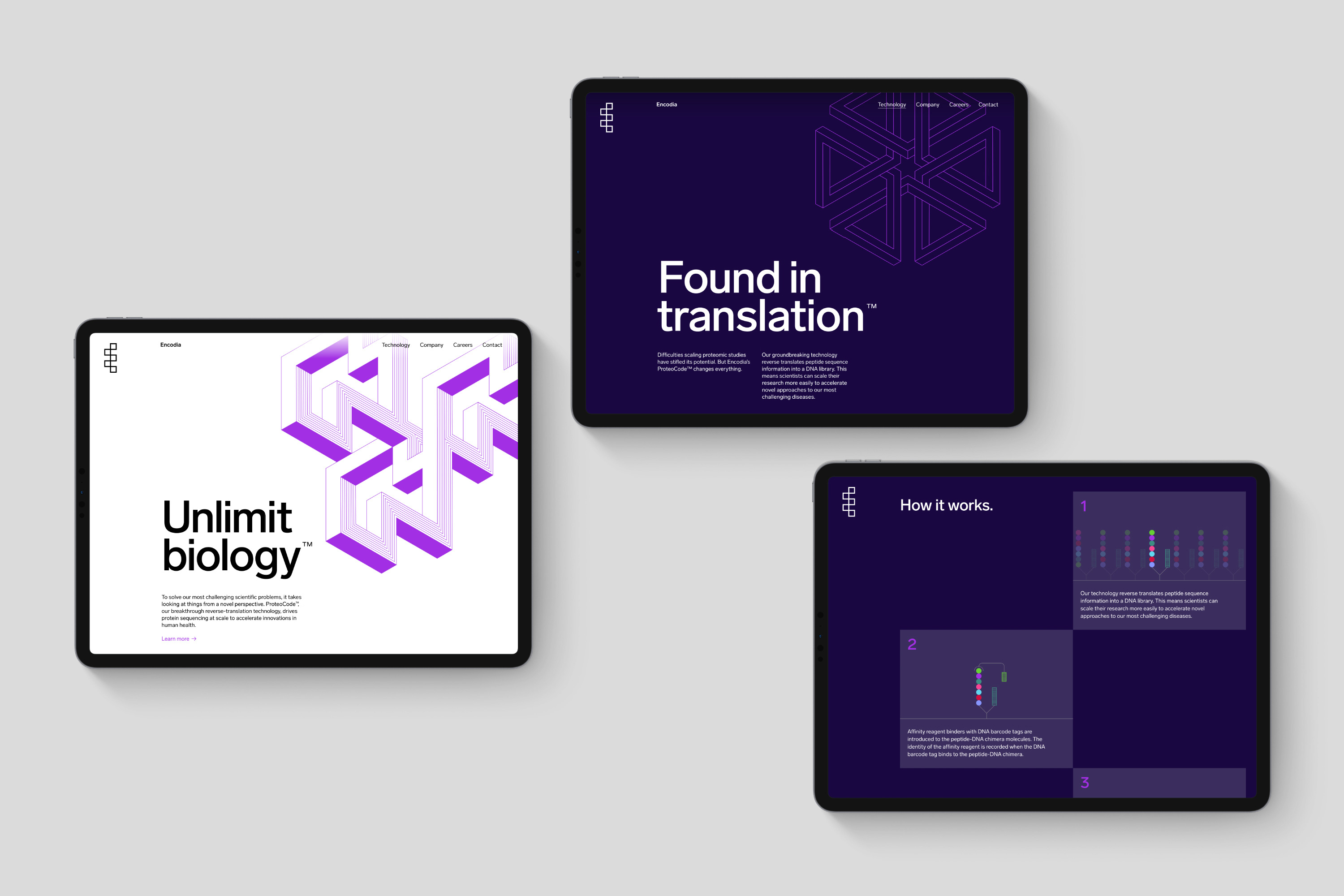 We created a new logo for Encodia that combines the graphic structure of a DNA strand and the letter E, reminiscent of a puzzle. A supporting graphic language was developed inspired by M.C. Escher’s graphic drawings of impossible puzzles and scenarios. Copy and messaging supports this idea of solving problems to unlock endless possibilities in the medical world – Unlimit Biology and Found in Translation.