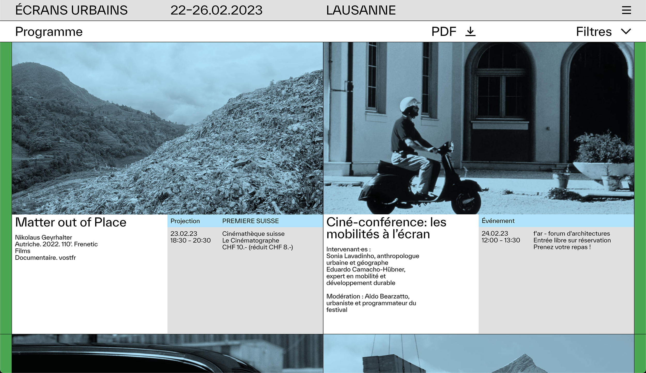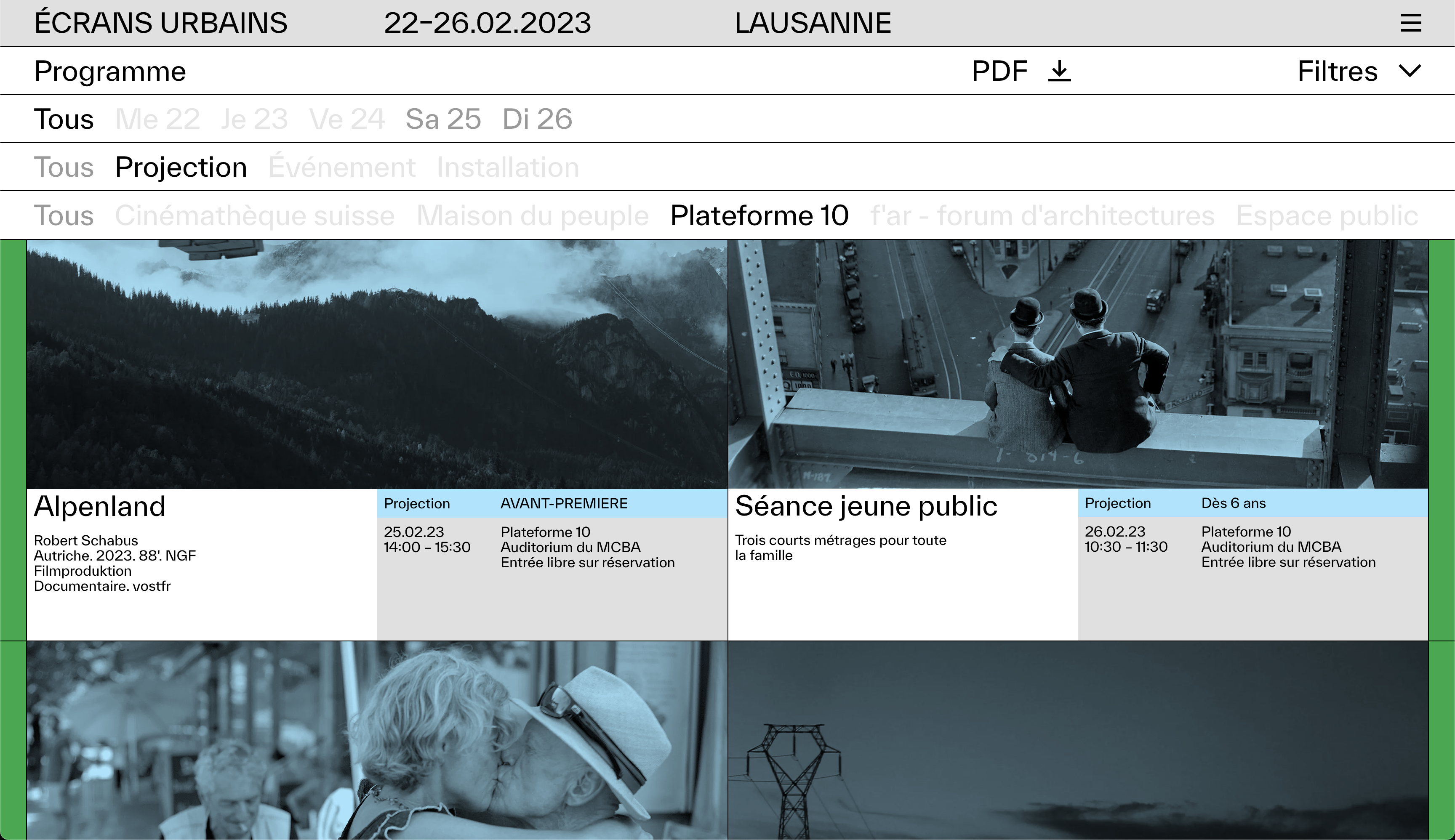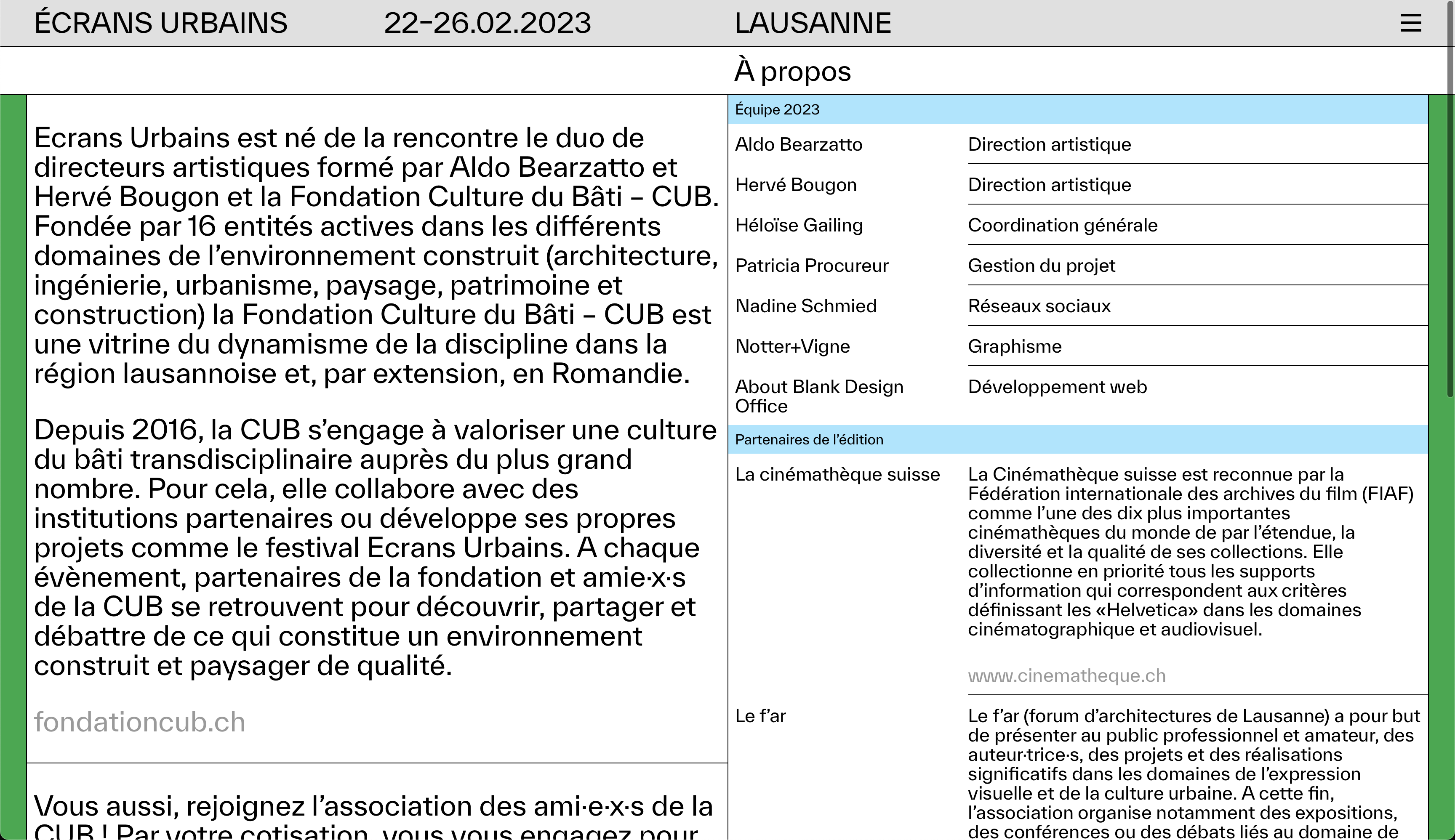 Ecrans Urbains was born from the meeting of the artistic directors Aldo Bearzatto and Hervé Bougon and the Fondation Culture du Bâti – CUB. Founded by 16 entities active in the various fields of the built environment (architecture, engineering, urban planning, landscape, heritage and construction), the Fondation Culture du Bâti – CUB is a showcase for the dynamism of the discipline in the Lausanne region and, by extension, in Romandie.