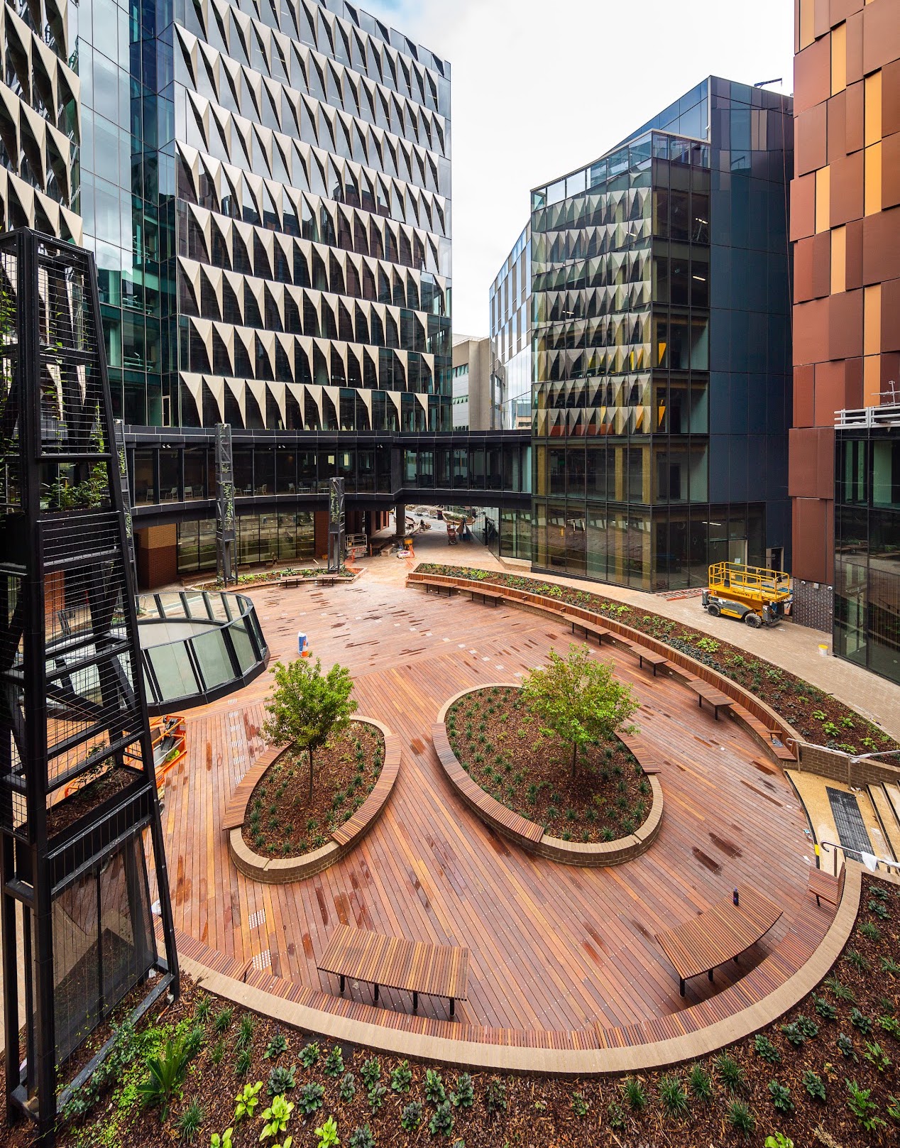 Melbourne Connect is a mixed-use innovation precinct for researchers, industry, government, students, and artists. The complex, designed by architecture studio Woods Bagot, is constructed of interconnected buildings encompassing an open air oculus. In collaboration with the Wurundjeri Woi Wurrung Cultural Heritage Aboriginal Corporation and Wurundjeri Elders, the central courtyard was named Womin-Djerring, meaning “come together”.