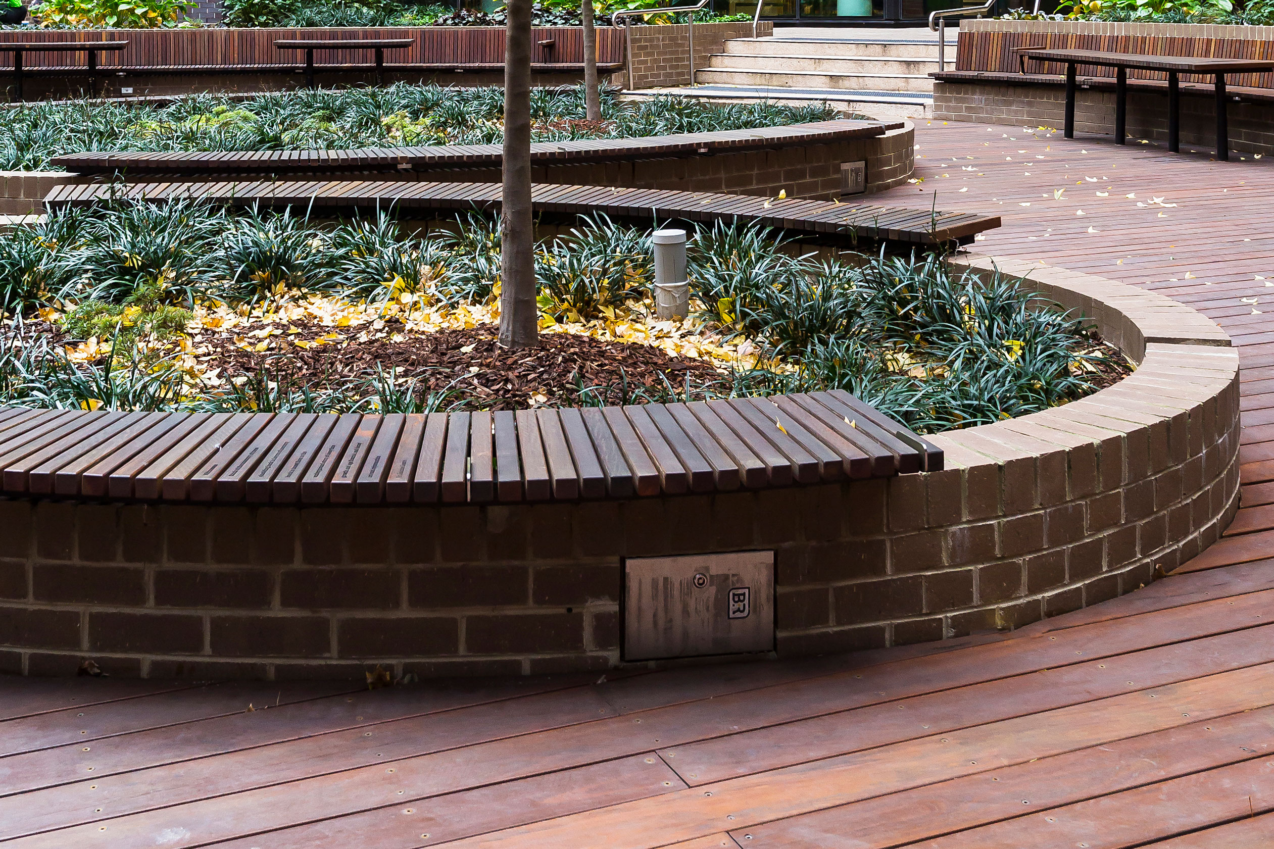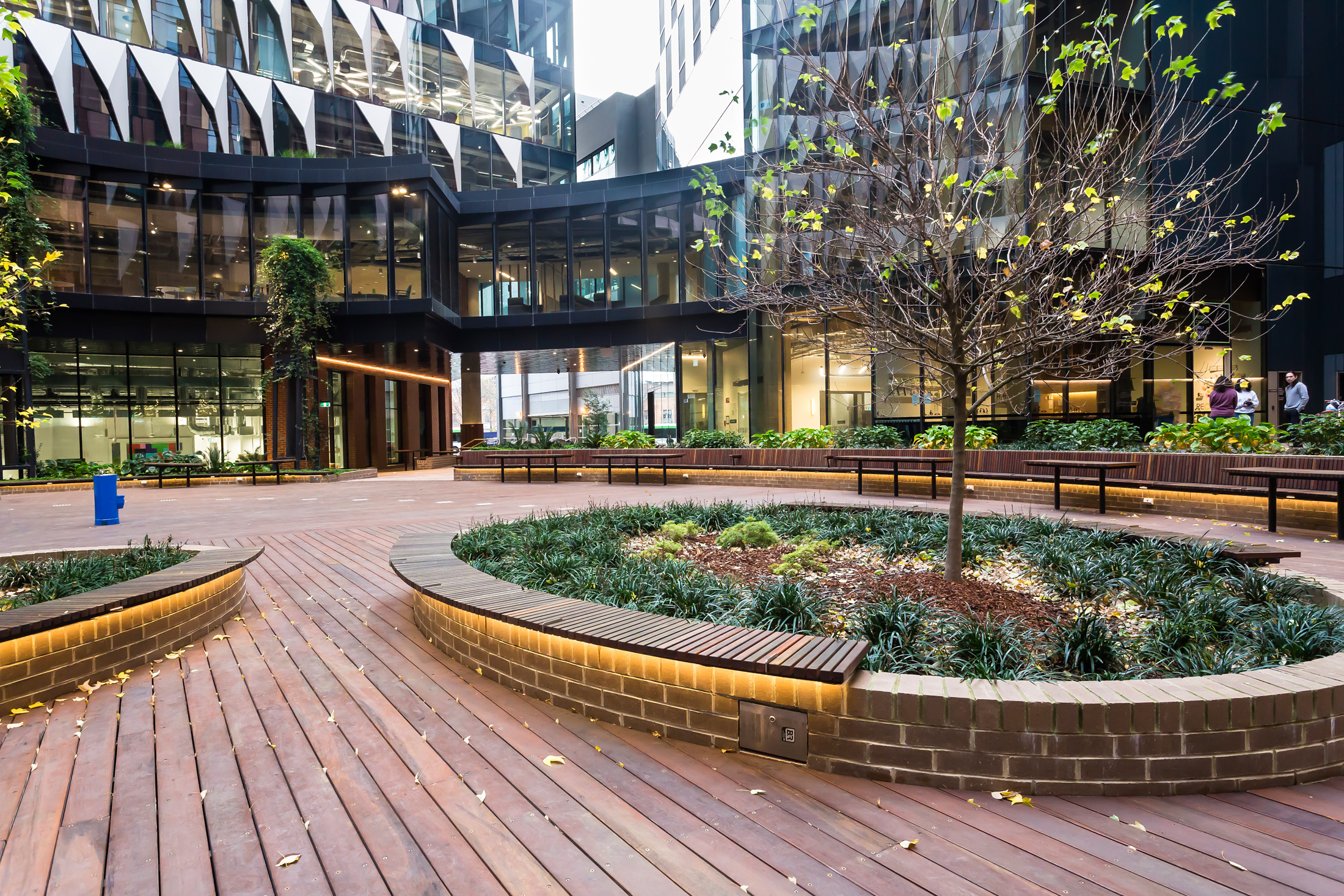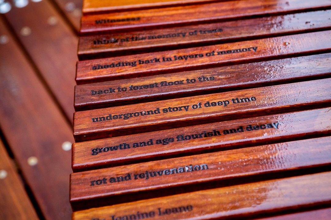 ASPECT Studios designed the public spaces and green areas, with landscaping by Ace Contractors and public space furniture manufacturing by SPARK. A key feature of Womin-Djerring are the Memory Trees accompanied with wooden slat benches. The benches prompt reflection with moments of engraved poetry, set in Aglet Slab.