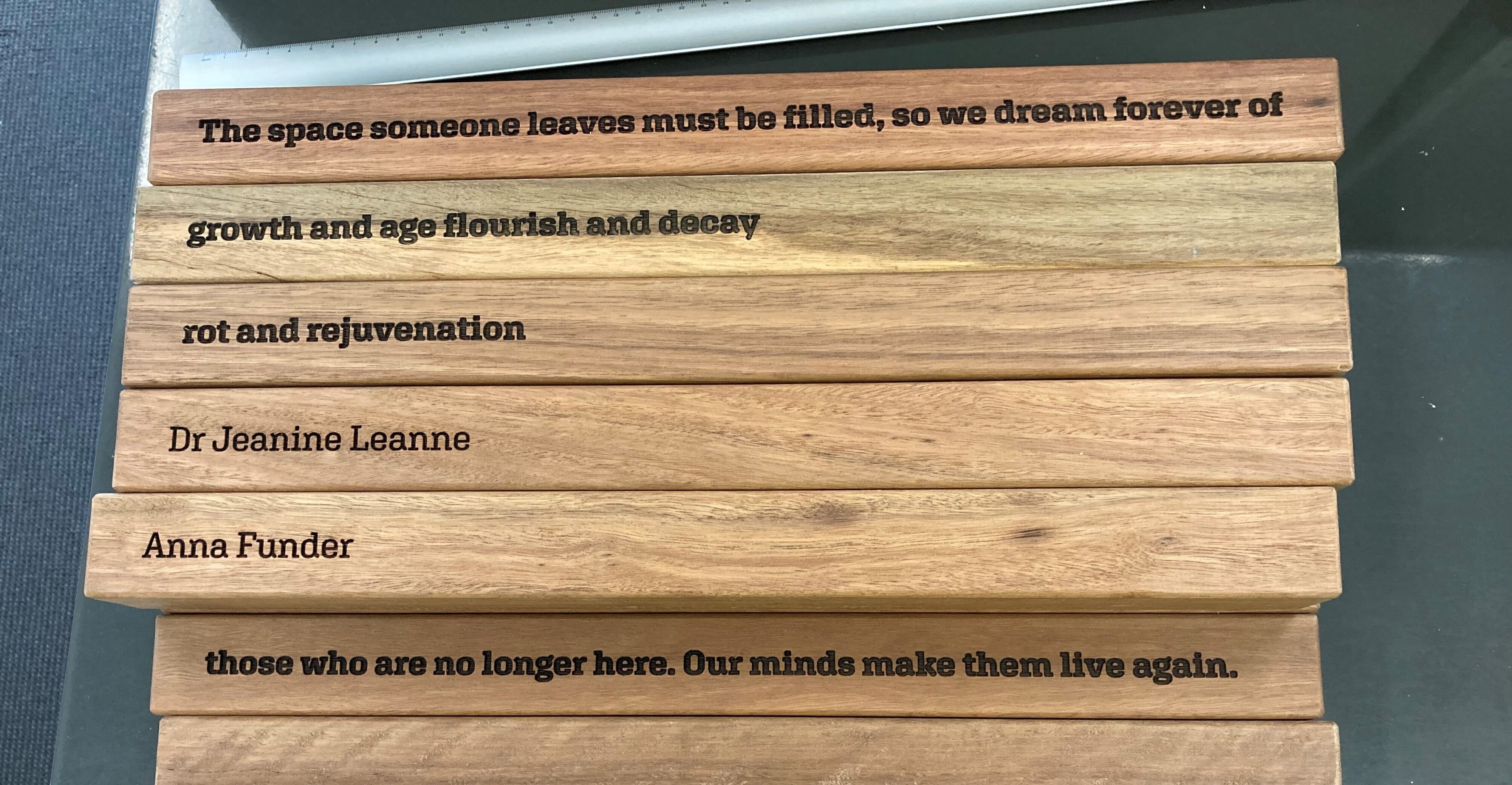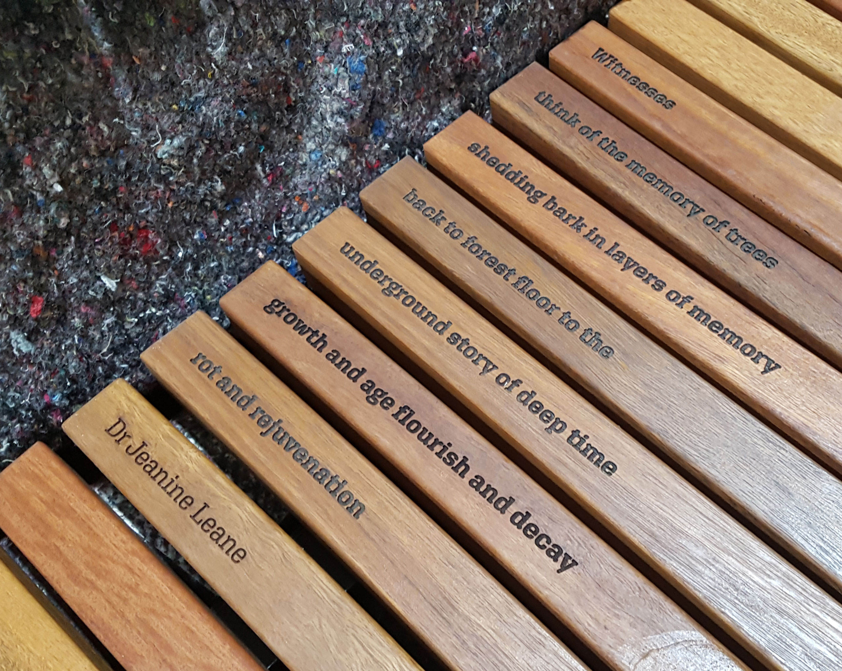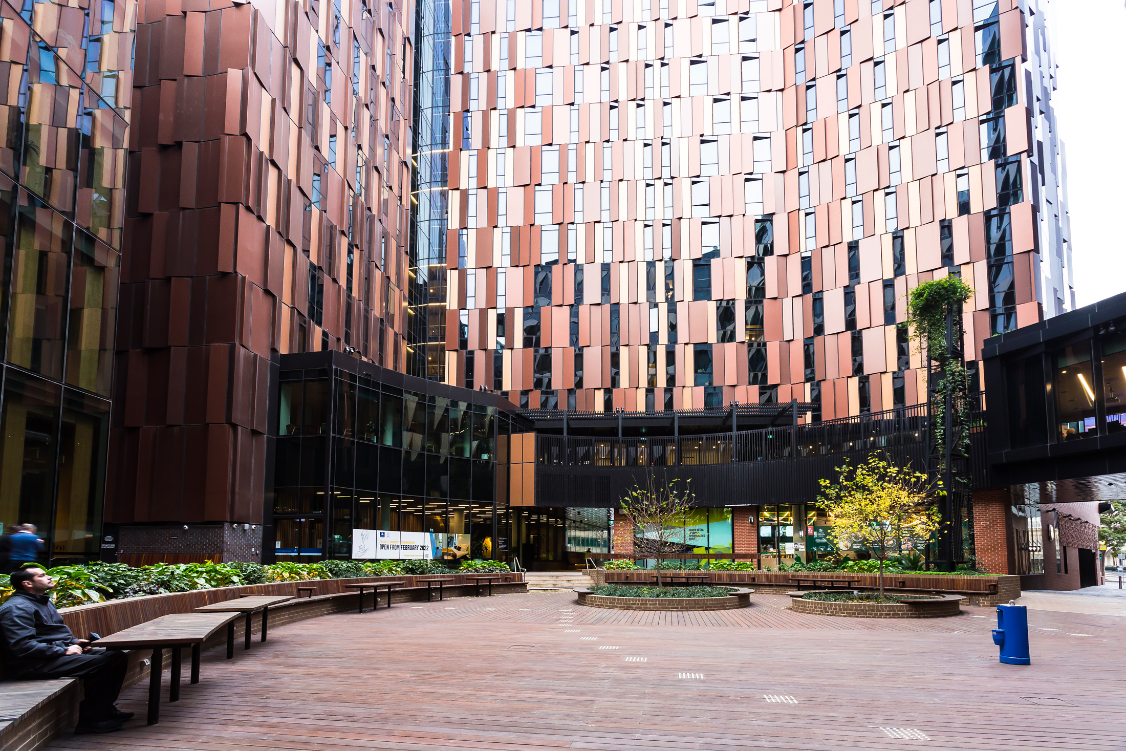 ASPECT Studios designed the public spaces and green areas, with landscaping by Ace Contractors and public space furniture manufacturing by SPARK. A key feature of Womin-Djerring are the Memory Trees accompanied with wooden slat benches. The benches prompt reflection with moments of engraved poetry, set in Aglet Slab.