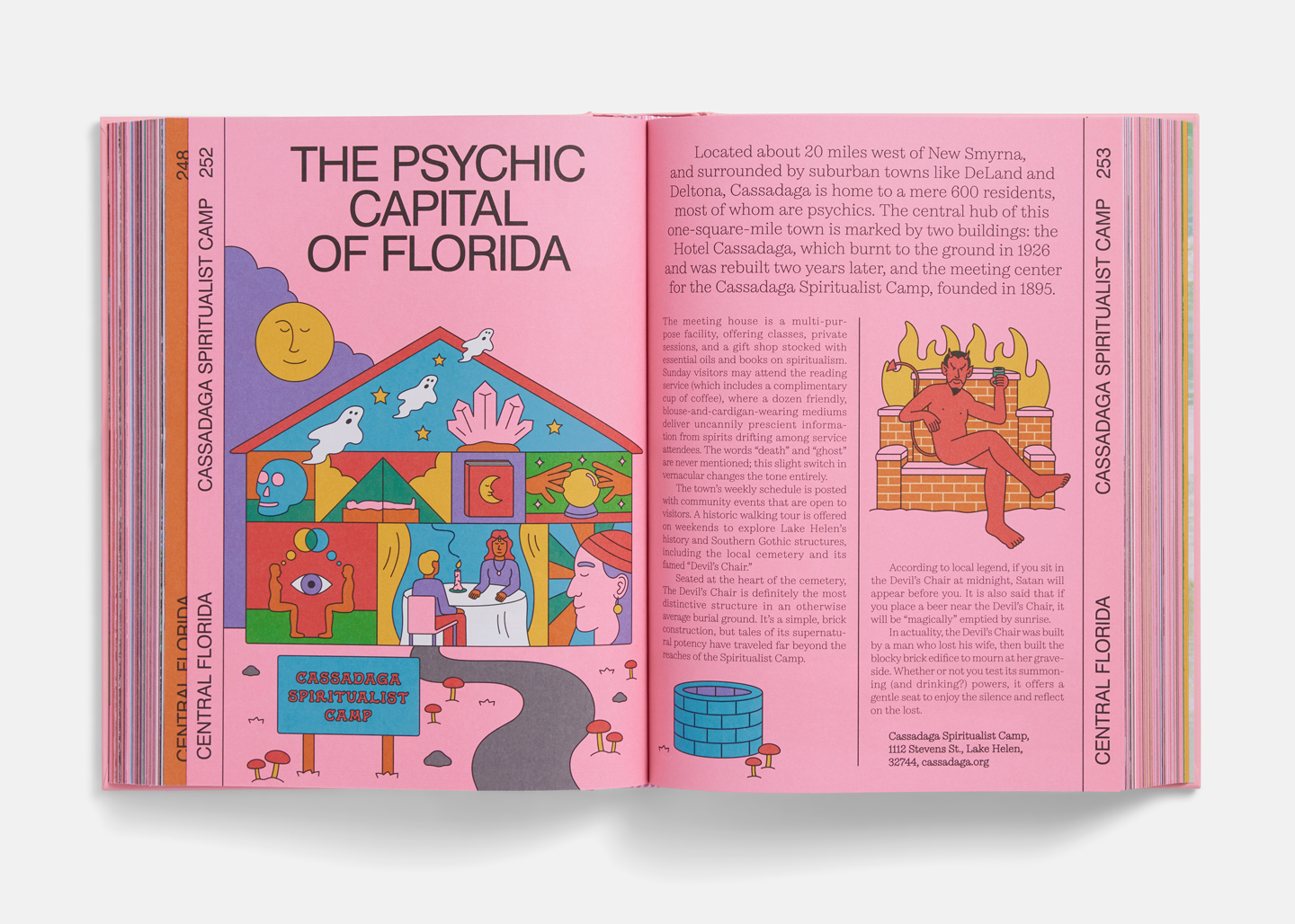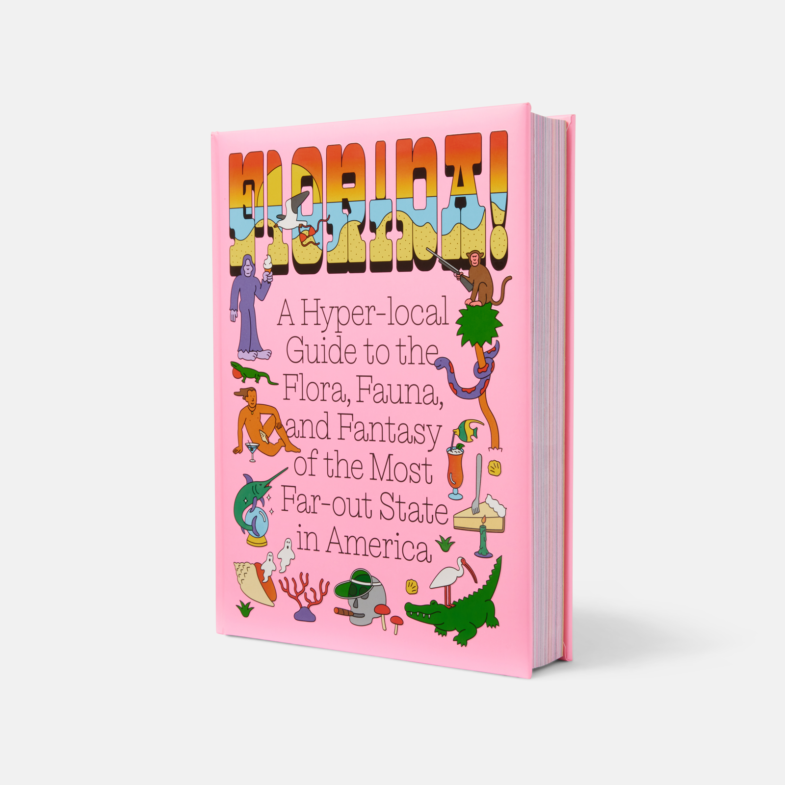 The colour palette revolves around a “Florida Pink” swatch, a shade of pink that was pulled from the wildlife and architecture of the state. Each chapter of the book corresponds to a different geographical part of the state and begins with a fold-out illustrated map of the locations and landmarks in that chapter. Folios on the side of each page provide strong wayfinding and a sense of location throughout the book.