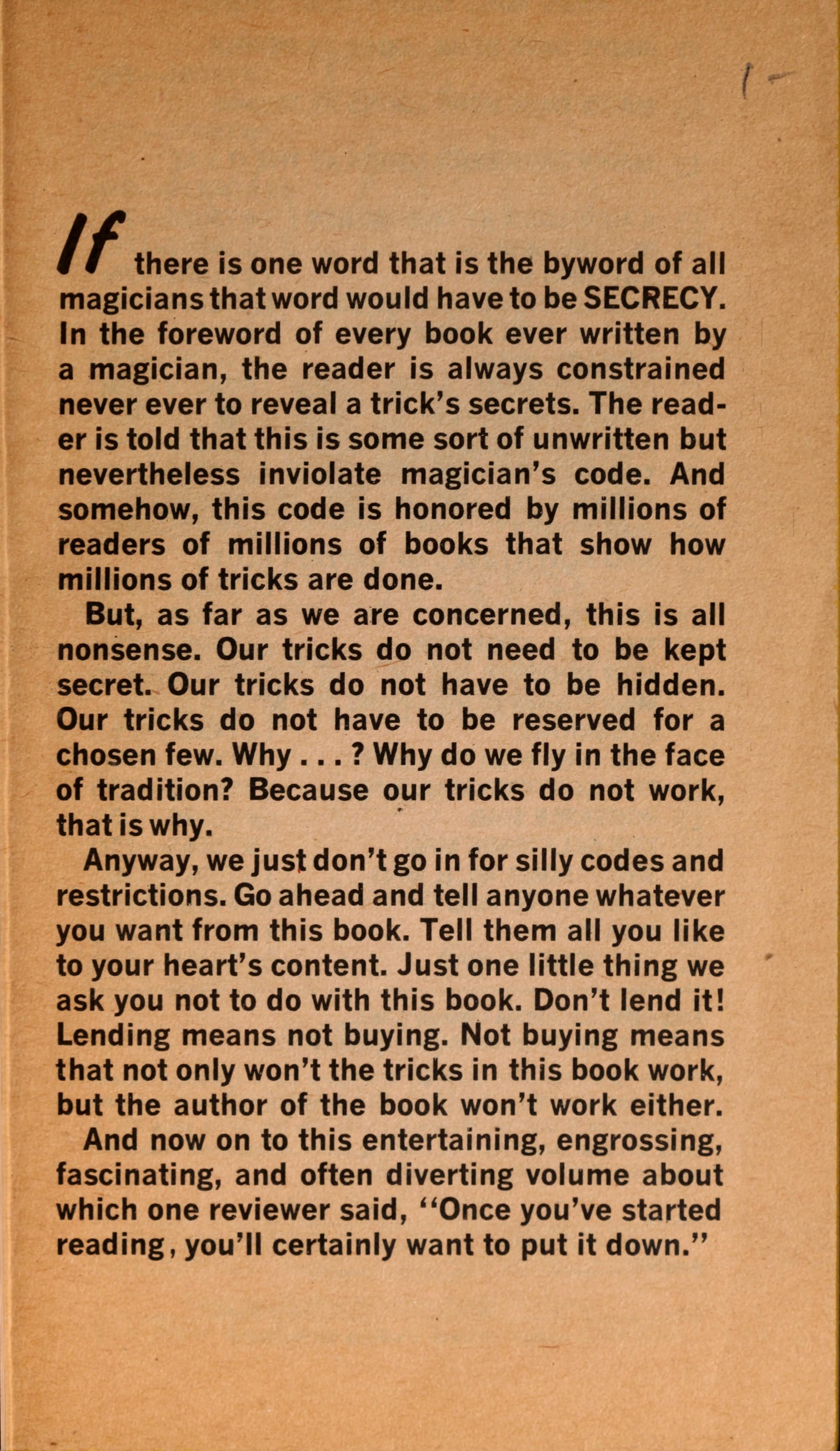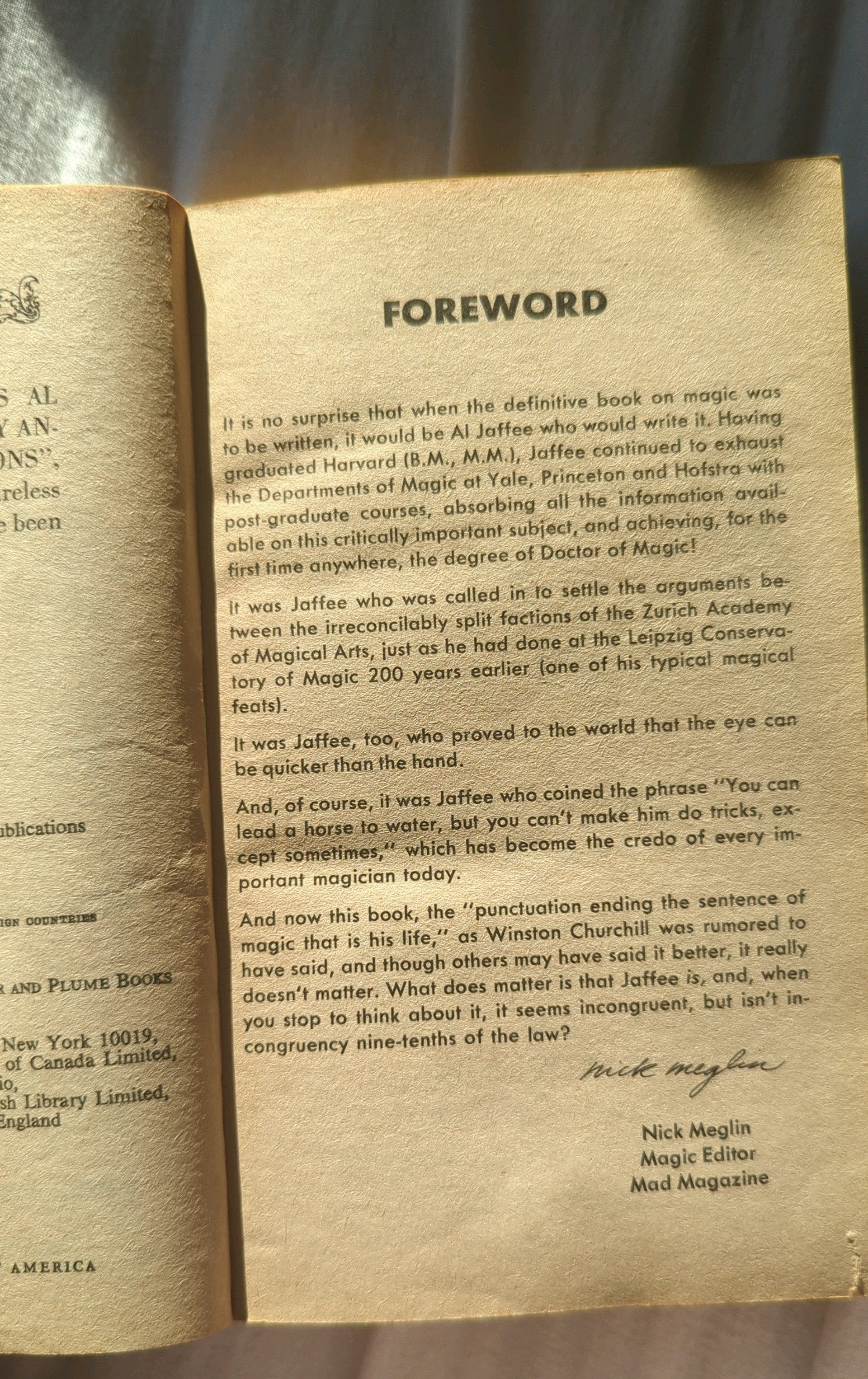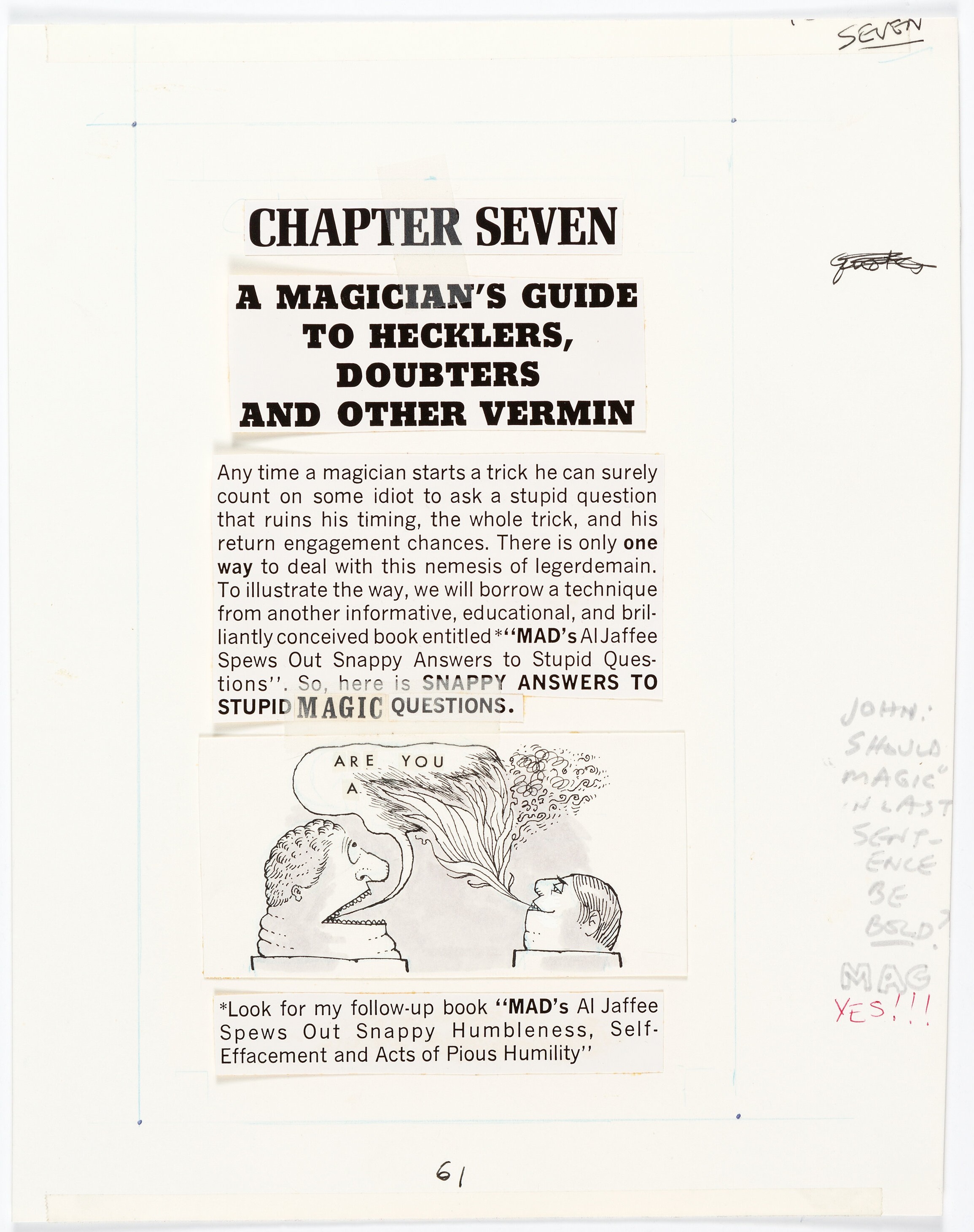 Master cartoonist Al Jaffee (1921–2023) of Mad magazine, who is best known for his Mad Fold-Ins and Snappy Answers to Stupid Questions series, created this classic book of wild and psychotic magic tricks. Edited together with Jerry De Fuccio and published by Signet in 1970, it became a hit through North America and Europe, becoming a household item for many growing up in the 1970s.