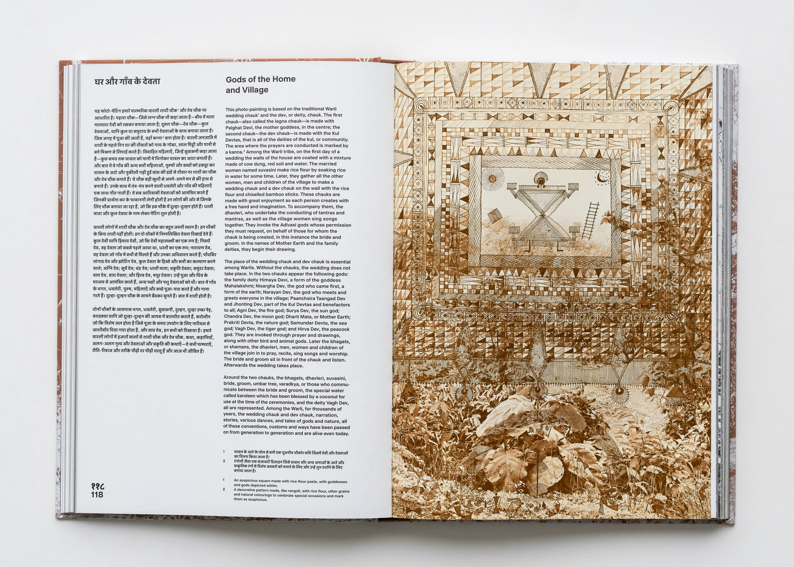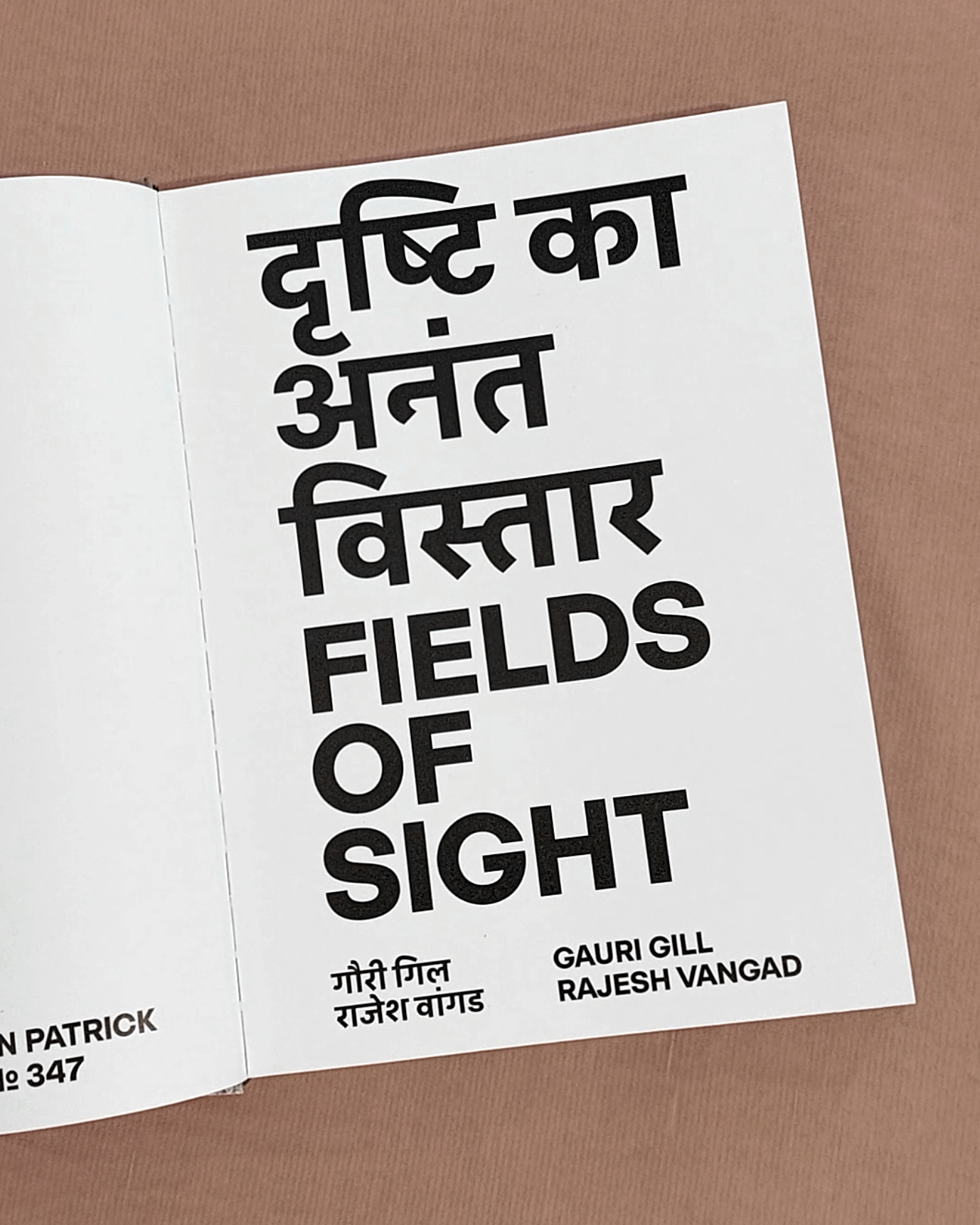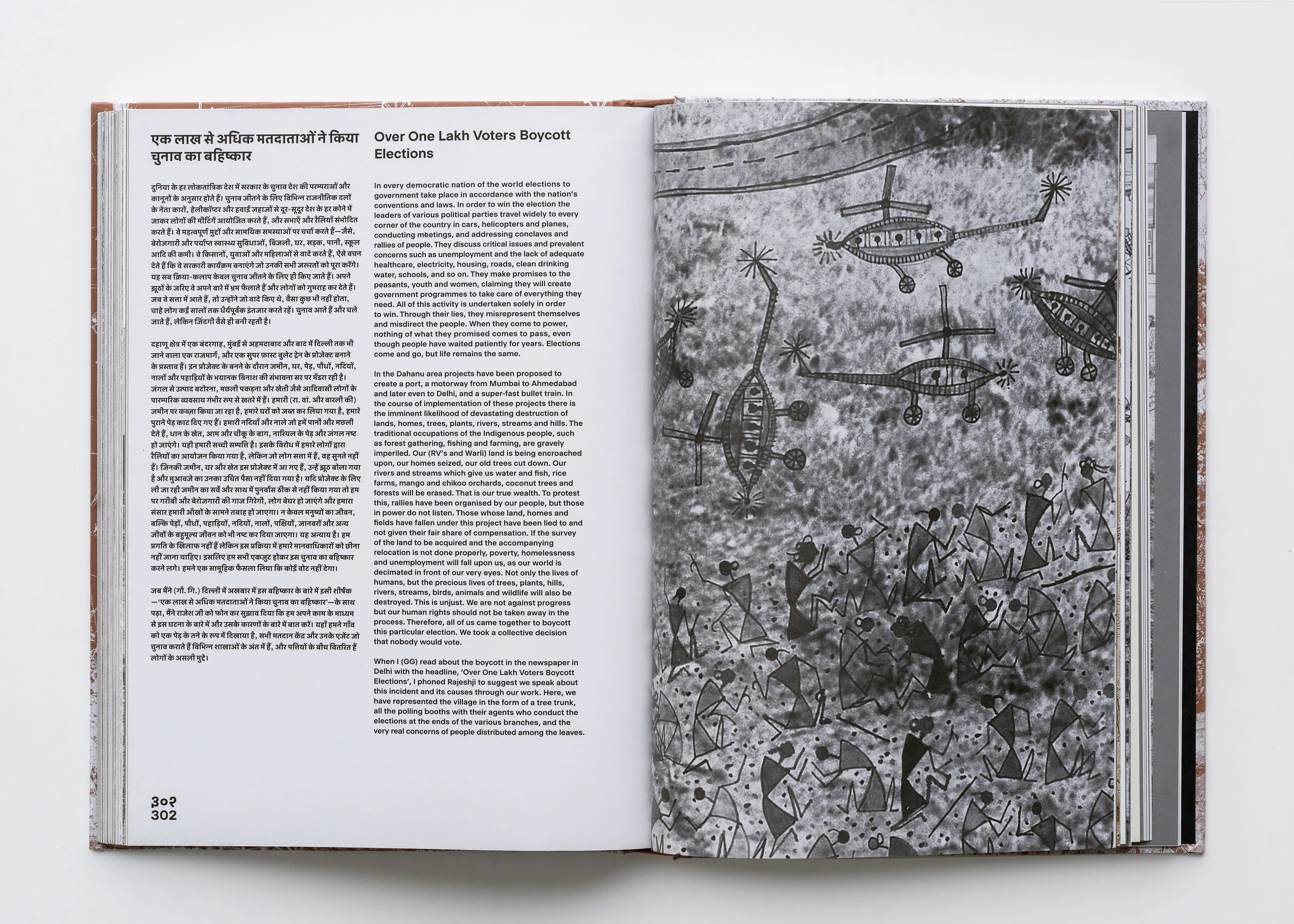 Devanagari typeset in Akkurat, and English in Selecta. The cover is screen printed twice with white ink on brown paper.