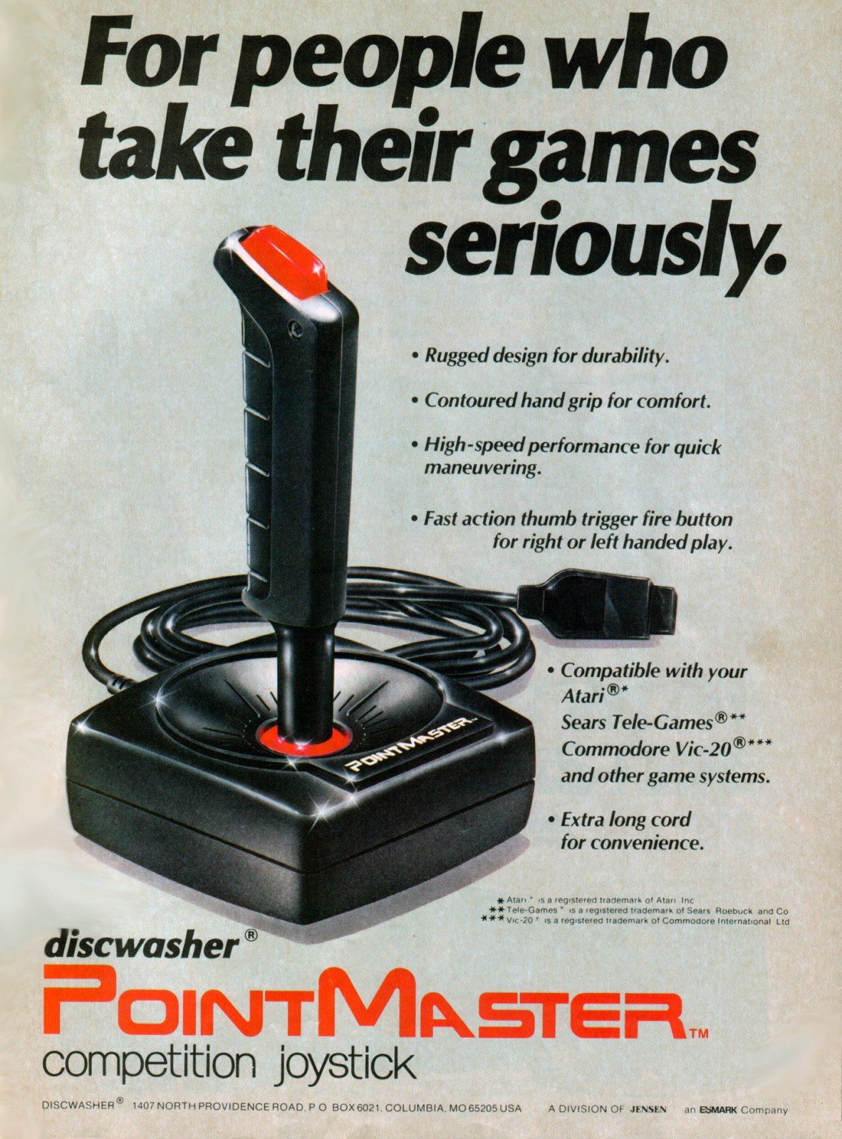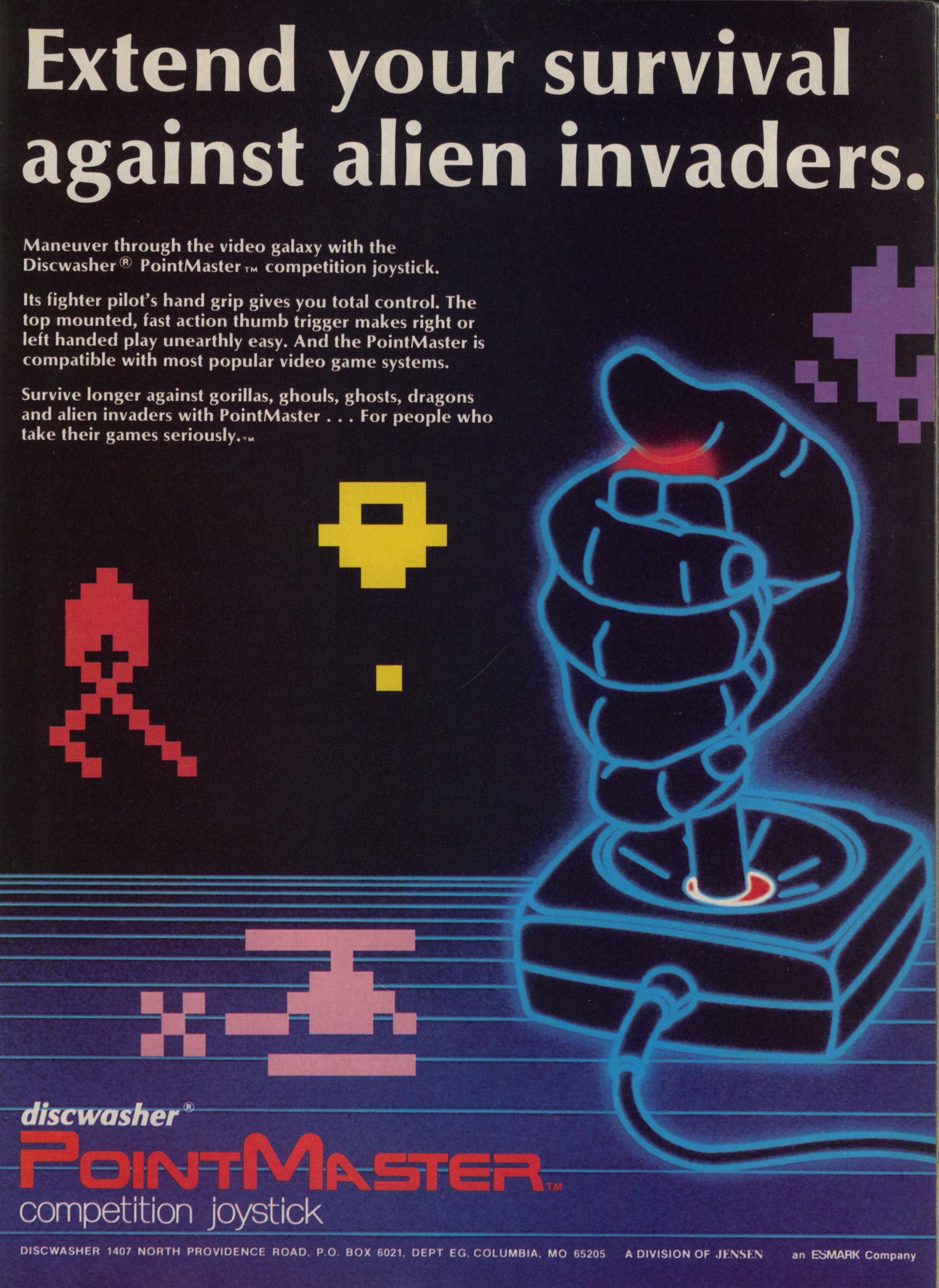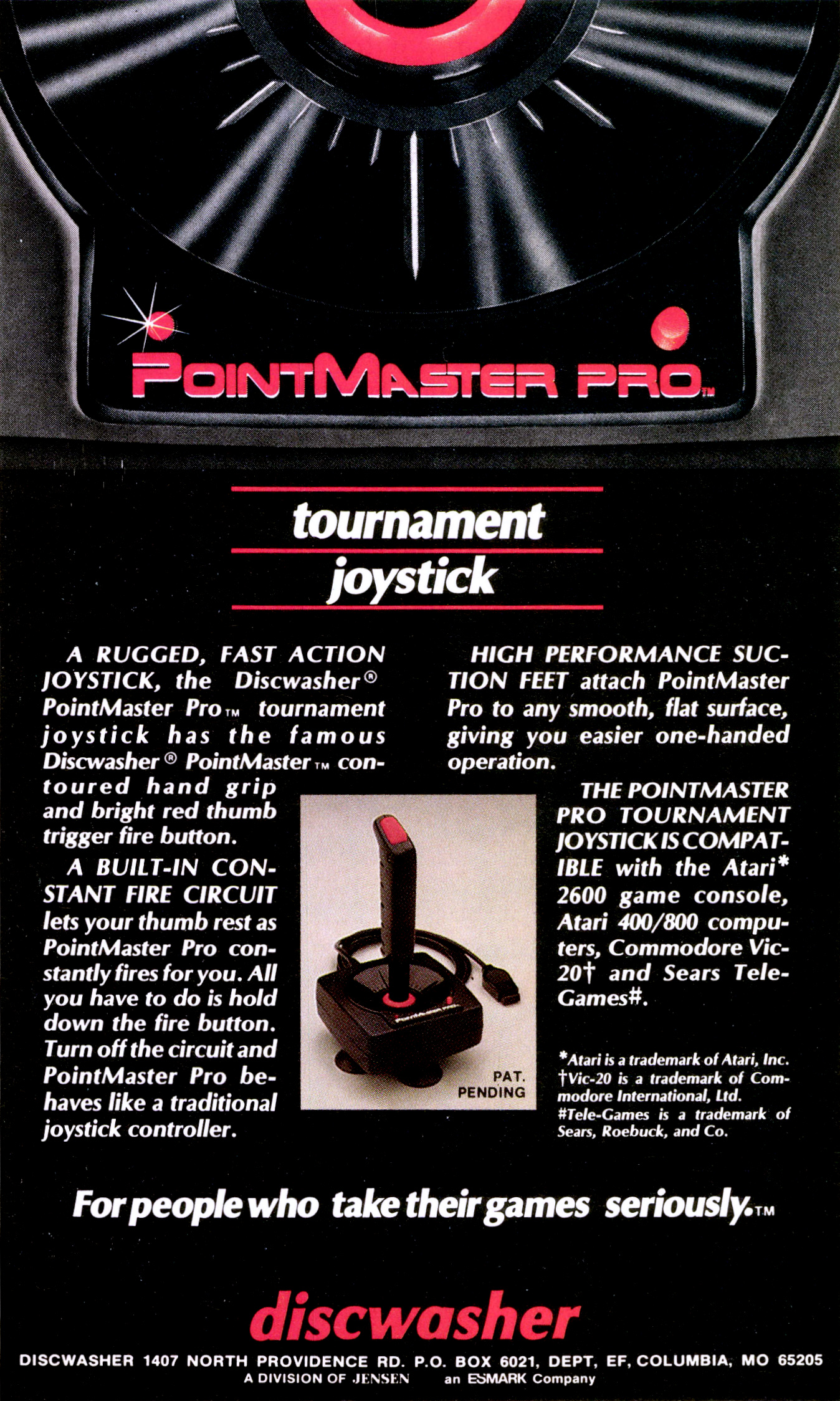 Print ads for the PointMaster Competition Joystick from Discwasher, as seen in 1983 issues of Electronic Games magazine. PointMaster Pro Tournament Joystick print ad is cropped from a 1983 issue of Electronic Fun with Computers & Games magazine.