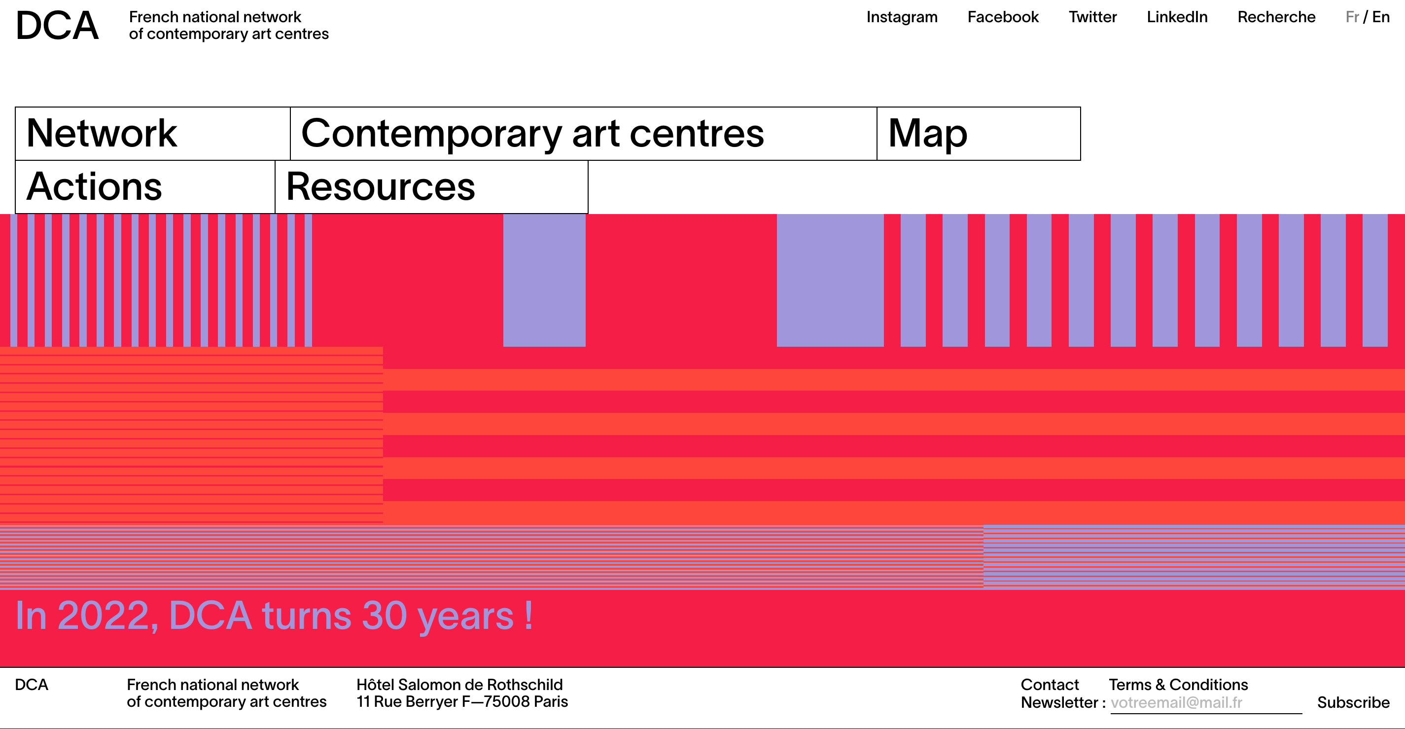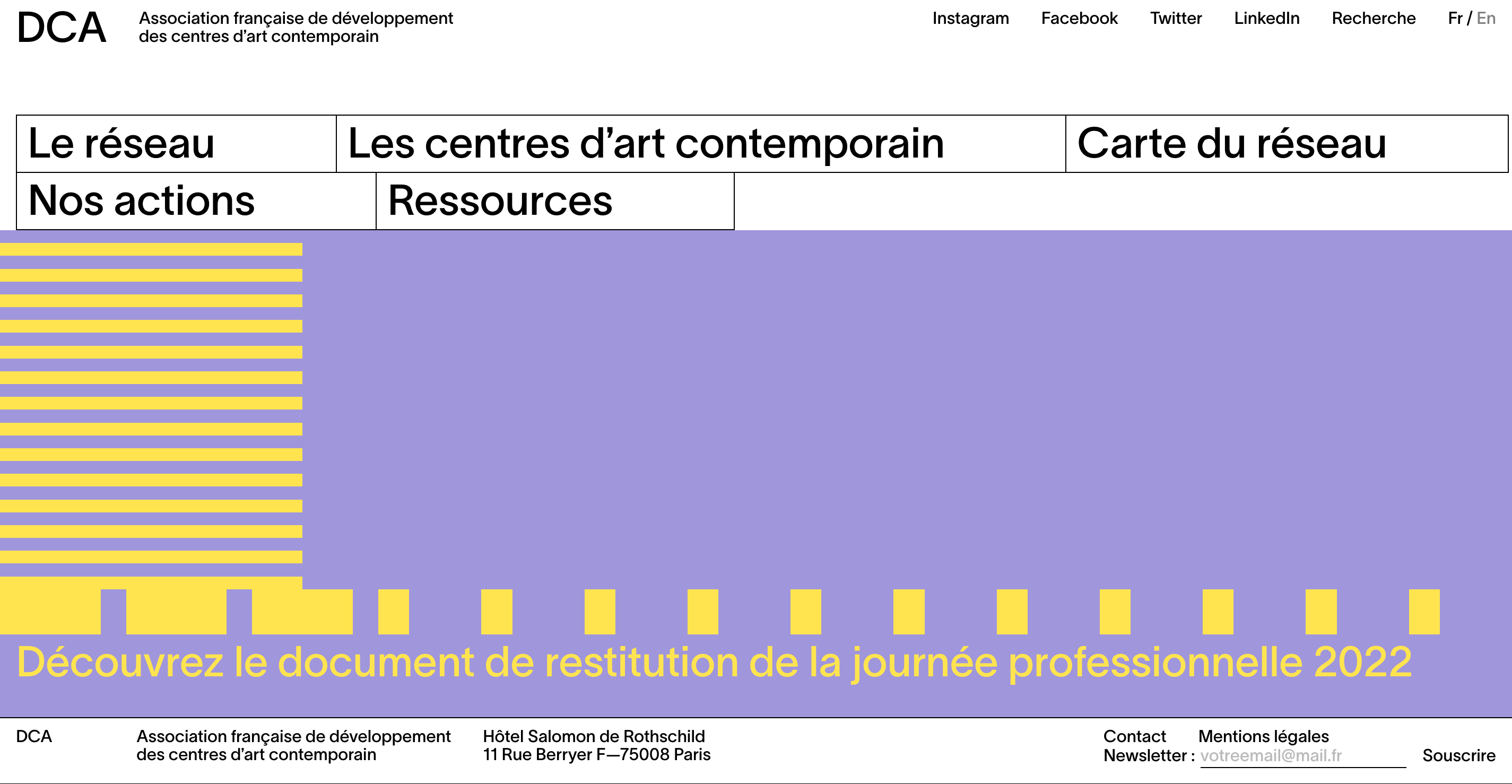 DCA Contributed by WELTKERN® Typefaces on May 31st, 2023. Artwork published in November 2022. Source: www.instagram.com DCA. License: All Rights Reserved. New identity for DCA, the French national network of contemporary art centres, designed by Atelier Pierre Pierre using Lausanne (designed by Nizar Kazan) Source: www.instagram.com DCA. License: All Rights Reserved. Source: www.instagram.com DCA. License: All Rights Reserved. Source: www.instagram.com DCA. License: All Rights Reserved. Source: www.instagram.com DCA. License: All Rights Reserved. Source: www.instagram.com DCA. License: All Rights Reserved. Source: dca-art.com DCA. License: All Rights Reserved. Homepage (English) Source: dca-art.com DCA. License: All Rights Reserved. Homepage (French) Typefaces More about TWK LausanneGet TWK Lausanne Formats Web (5517) Branding/Identity (8287) Posters/Flyers (5644) Booklets/Pamphlets (2359) Topics Institutional (1375) Art (4575) Designers/Agencies Atelier Pierre Pierre (6) Tagged withnetworks (24)associations (73)art spaces (109)contemporary art (502)France (50)identities (2289)colorful/multicolored (1127)stripes (276)initialisms/monograms (461)type size gradients (48)logos (4890)all caps (7405)stationery (798)business cards (1506)posters (1387)flyers (338)binders/folders (38)newsprint (155)style guides / brand manuals (357)color variants (183)press kits (14)websites (3471)multilingual (2550)French (language) (2472)English (language) (2367)one typeface (1741)color blocking (33) Artwork location France (2772) Paris (1292) Post a comment Name Email – will not be published Website Your response Submit Comment More TWK Lausanne in use Babu’s Bakery & Coffeehouse2022unknownContributed by WELTKERN® Typefaces Suisse Quotidienne — Code Civil Suisse (CCS)2017Nizar Kazan + CoContributed by WELTKERN® Typefaces Red On – Phantom Easy album art2024Philipp DittmarSabrina ZeltnerContributed by Philipp Dittmar Sponsor More in Institutional Zealand Academy2019e-TypesContributed by Playtype Foundry Danno.chc. 2016Alfio MazzeiContributed by A M Moravská filharmonie Olomouc2019Studio MarvilVojtěch VavřínOlga BenešováContributed by Production Type Staff Pick Ehitamata (Unbuilt)2015Margus TammContributed by Margus Tamm More in Web Studio Forma 962018Uniforma StudioContributed by Swiss Typefaces Qualcomm Toq Smartwatch2013Contributed by Stephen Coles Staff Pick Pyurec. 2024Leon MilovanovContributed by Michael Clasen Oscar Health Insurance website2013Design and AcquisitionContributed by Nick Sherman More Fonts In Use Klaus Schulze – Irrlicht1972Klaus SchulzeContributed by Matthijs Sluiter Staff Pick Retour de Cueillette2024Odd Forms StudioContributed by Victor Mantel Staff Pick Shattered Records neon signc. 1980Contributed by Nick Sherman Staff Pick NMTK zine, issue B, “Das/The/El K/Complot/t”2022Carolina GiovagnoliContributed by Huerta Tipográfica Staff Pick