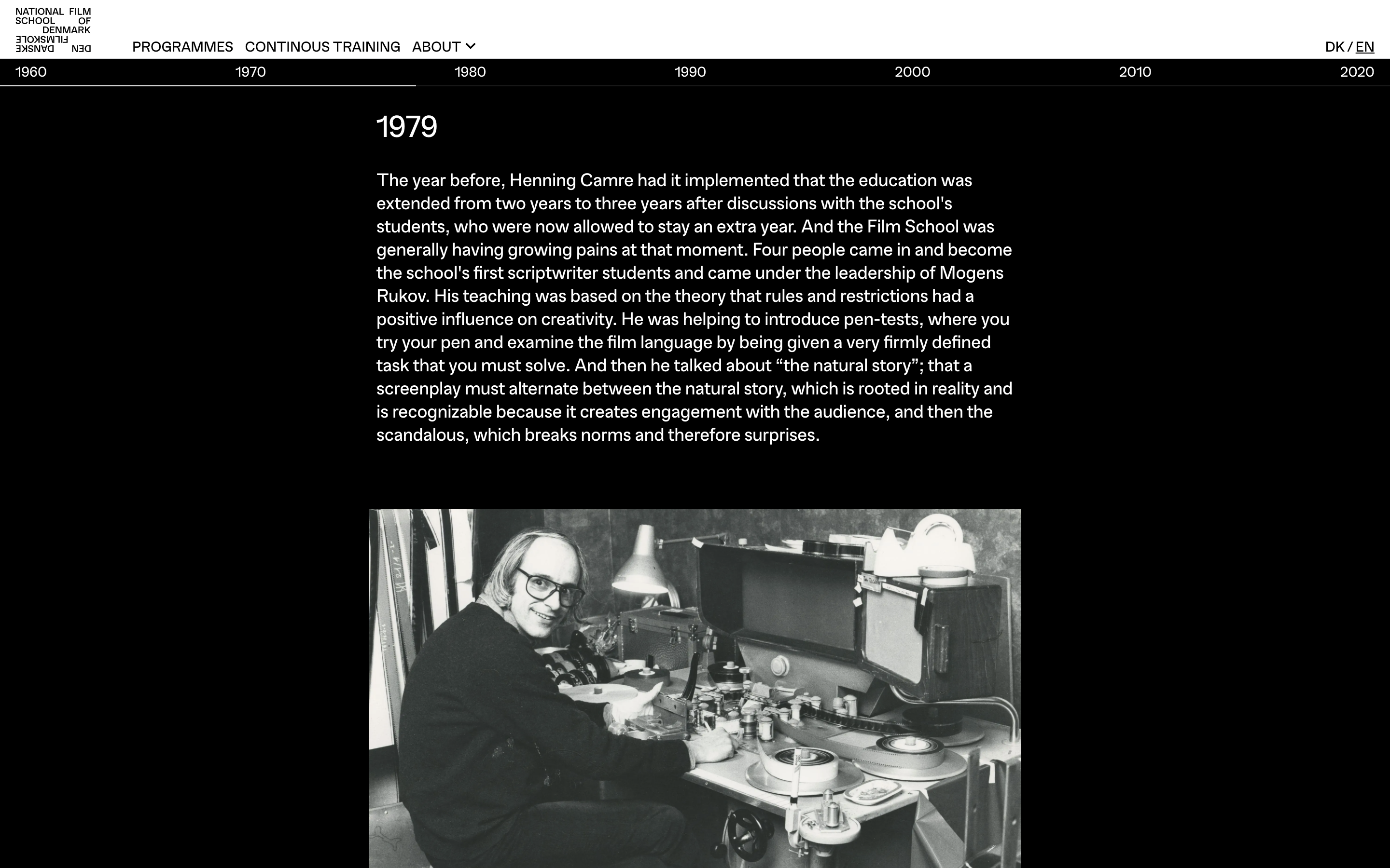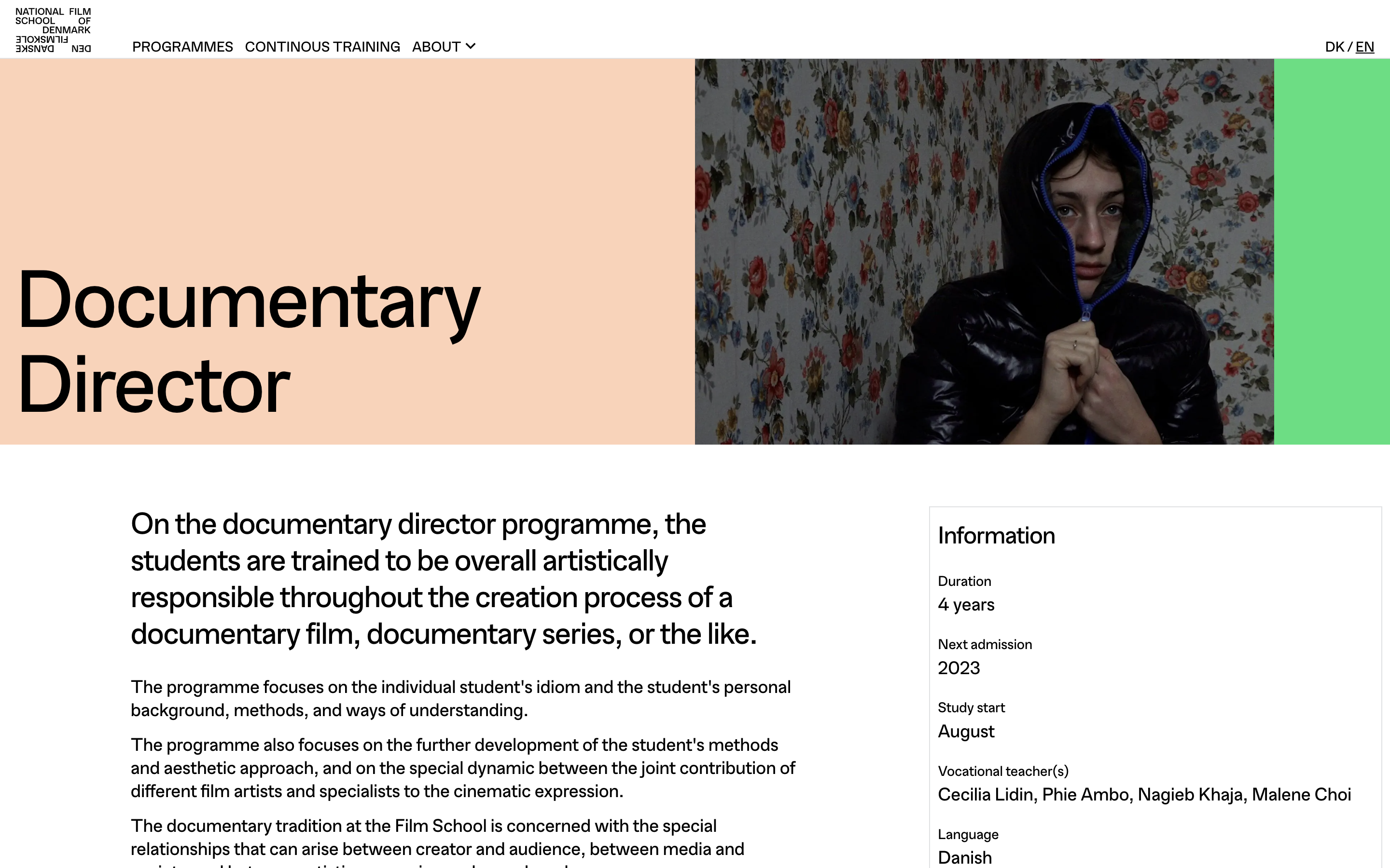 The National Film School of Denmark is a state school located in Copenhagen. It has eight programs: documentary director, fiction director, animation director, producer, scriptwriter, cinematographer, sound editor, film editor, game developer. Lars von Trier and Susanne Bier are among the famous graduates.