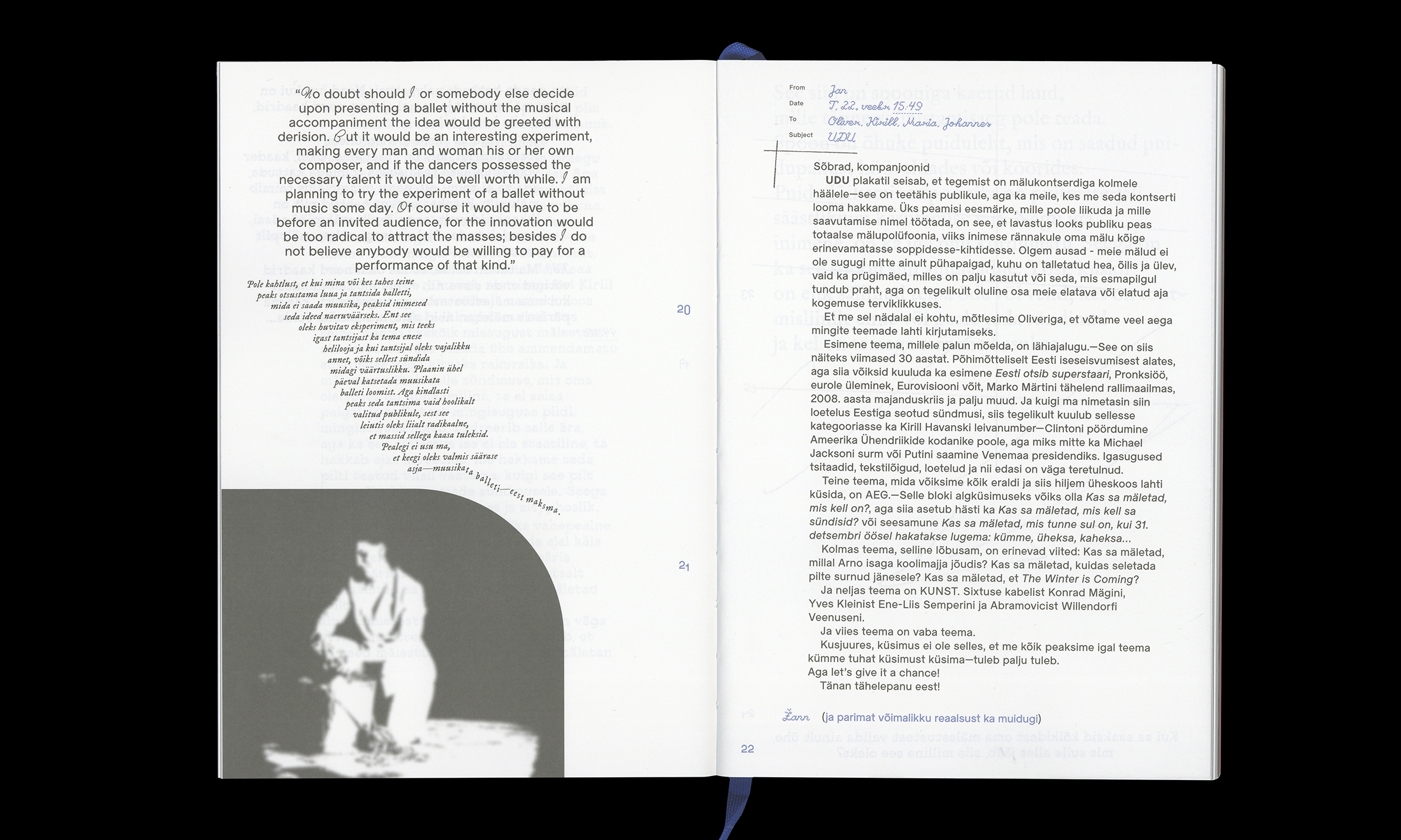 Paide Teater’s 2021/2022 season book brings together the productions “Paide Sümfoonia” (Paide Symphony), “Lahinguväli” (Battlefield), “Teine asi” (The Second Thing), “Udu” (The Fog), “Esimene tants. Viimast korda.” (The First Dance. For the Last Time.) and “Ja kes mind siis lõpuks mäletab?” (And who will remember me in the end?) and their metatextual structures, thematic stratifications and realizations clarified in the processes. The memory book brings together the results of one year’s creative work of a theatre and allows the elements discovered during different productions to react with each other.