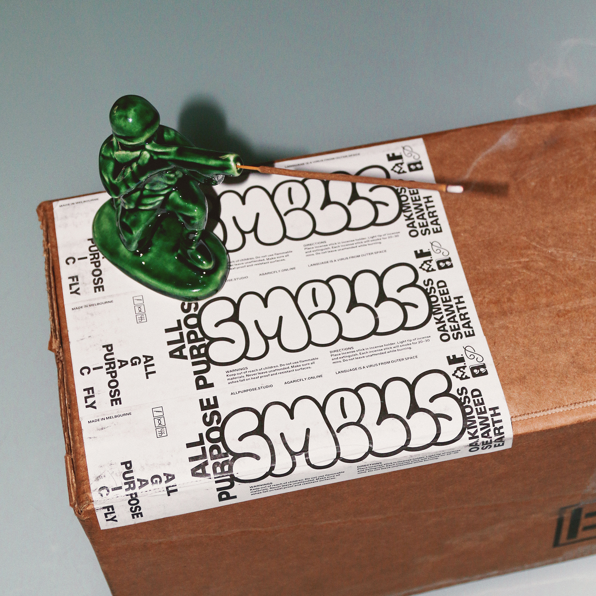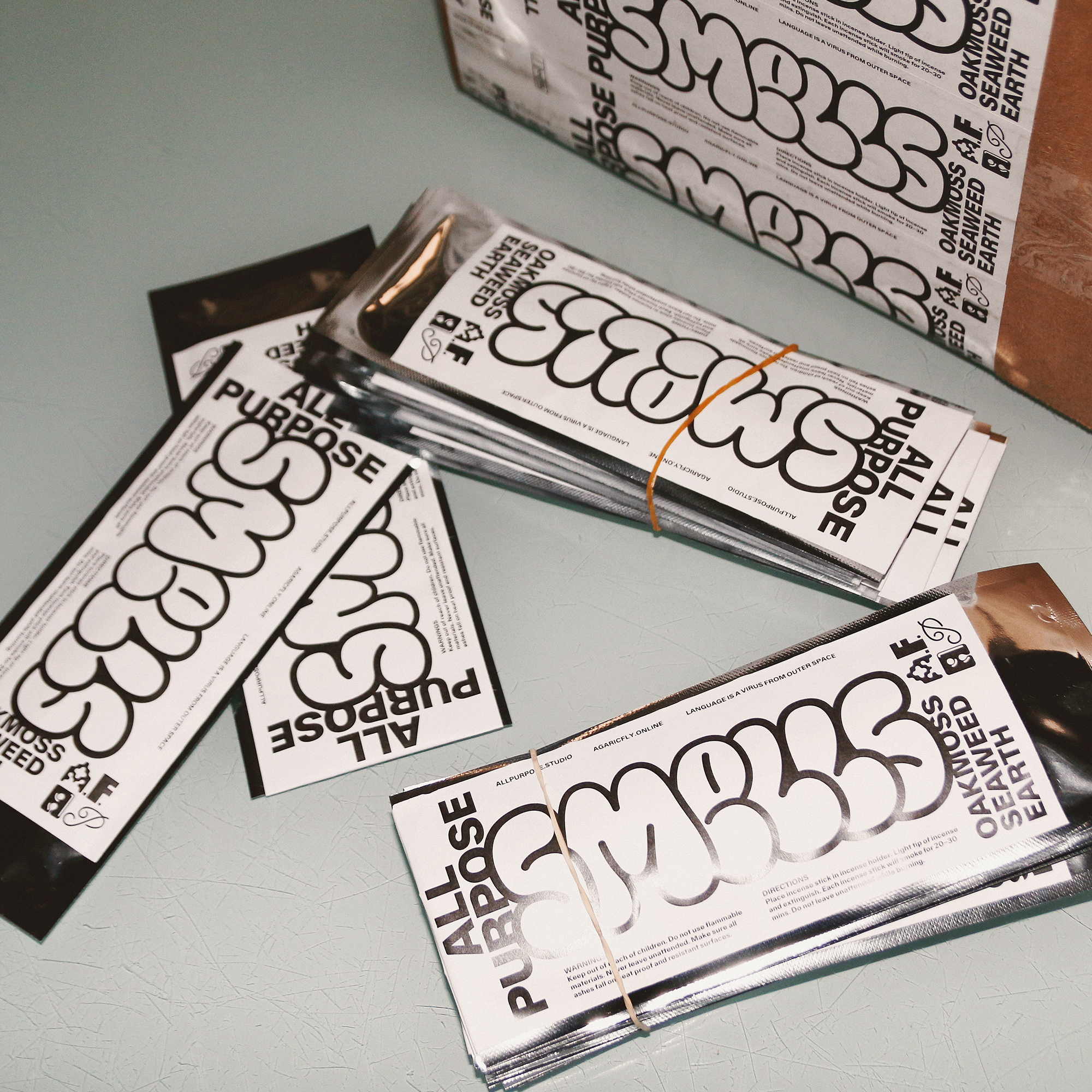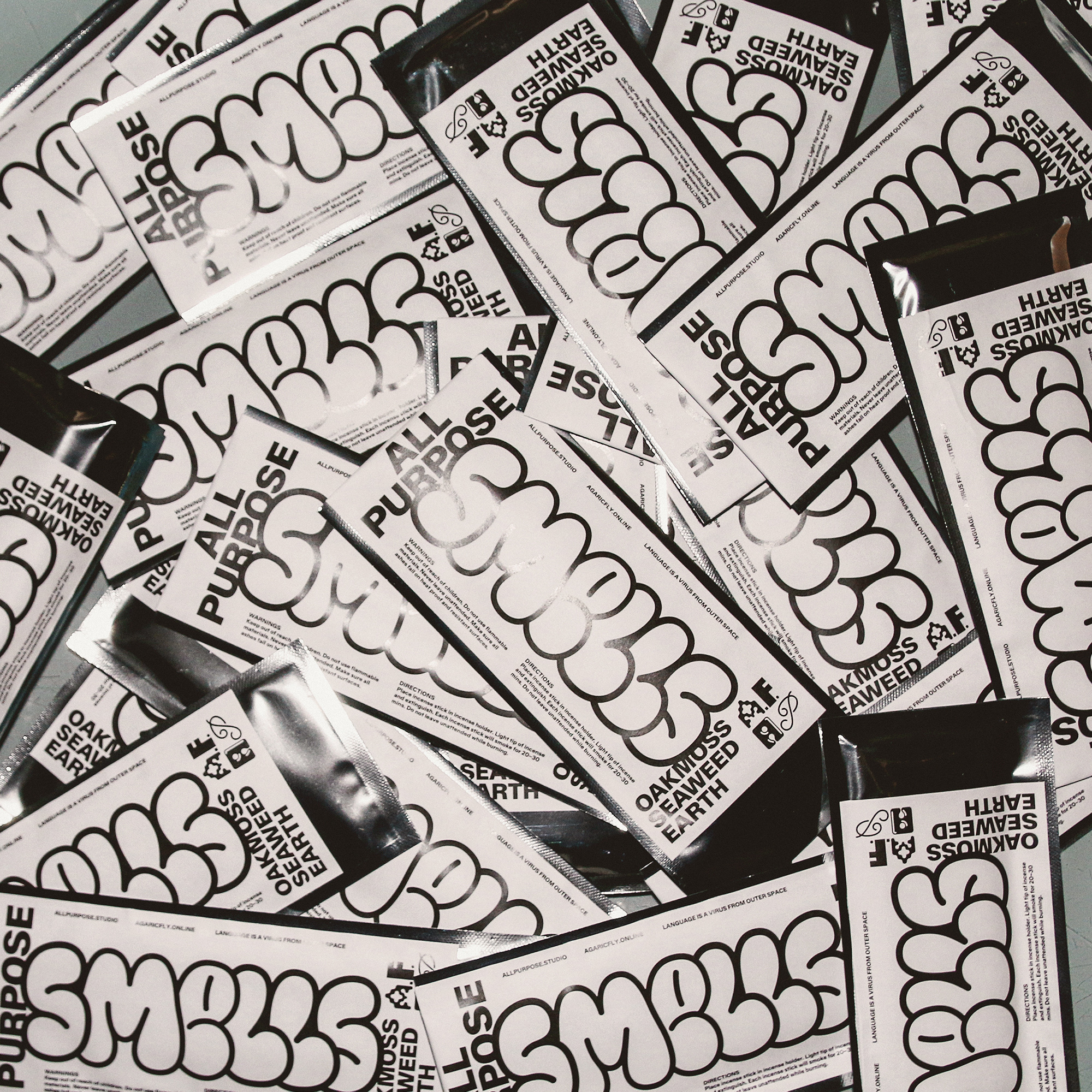 The All Purpose × Agaric Fly incense package was a thoughtfully designed gift to make your space smell fragrant. The pack contains 20 mini incense sticks with a blend of oakmoss, seaweed, and earthy scents. This limited run of 200 packs was created in January 2023 and features All Purpose Grotesk and AP Frowup on its packaging design.