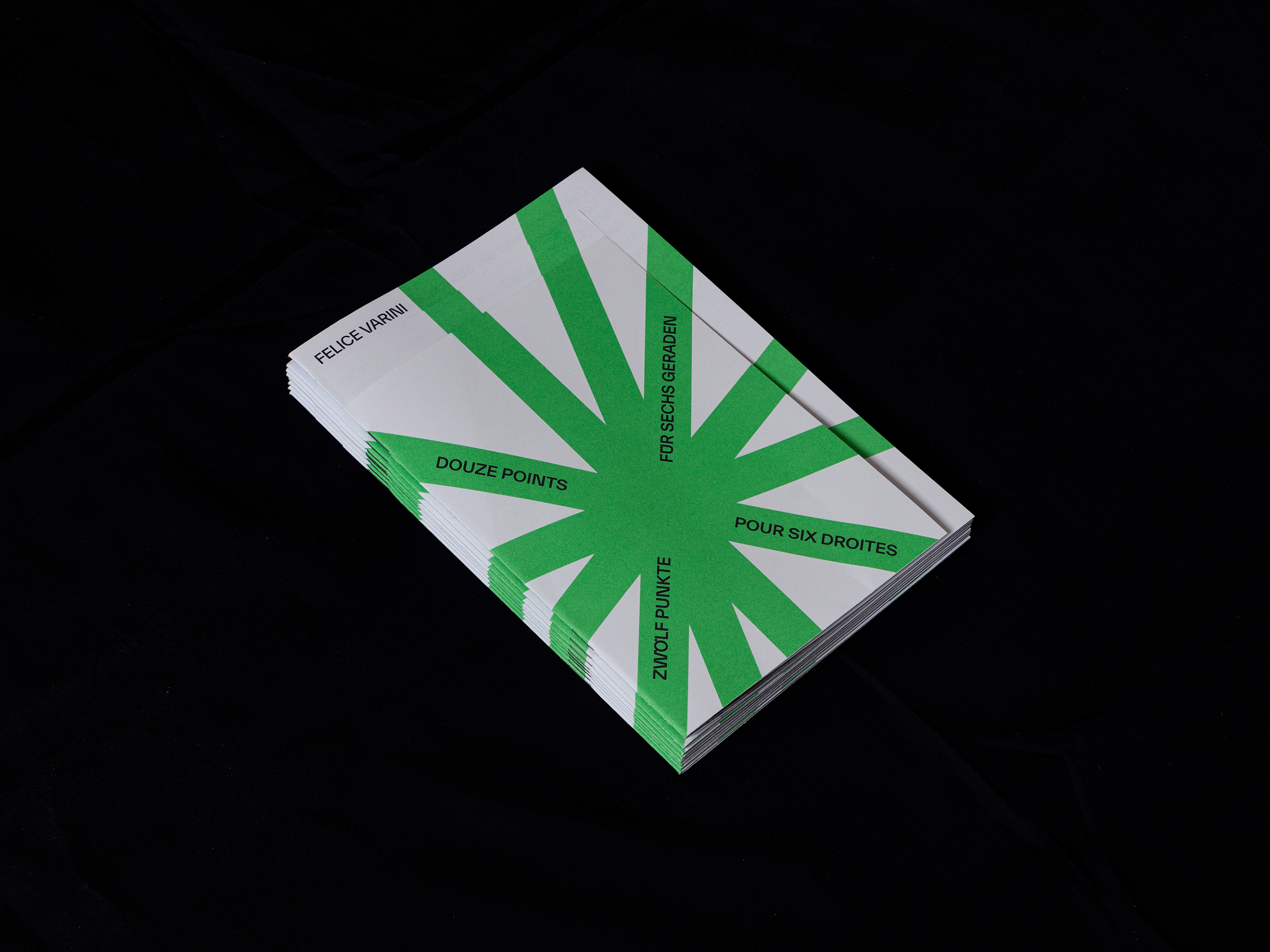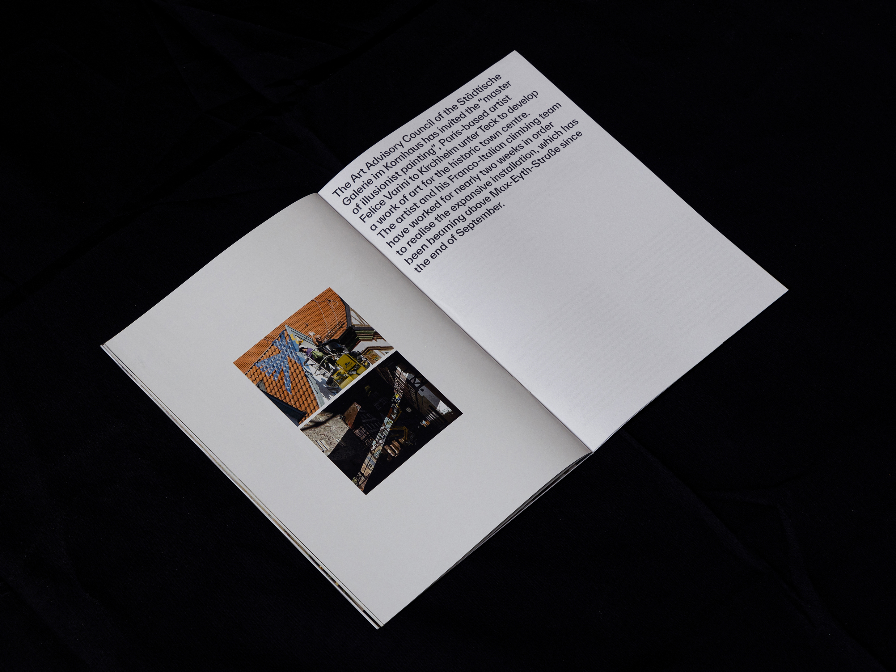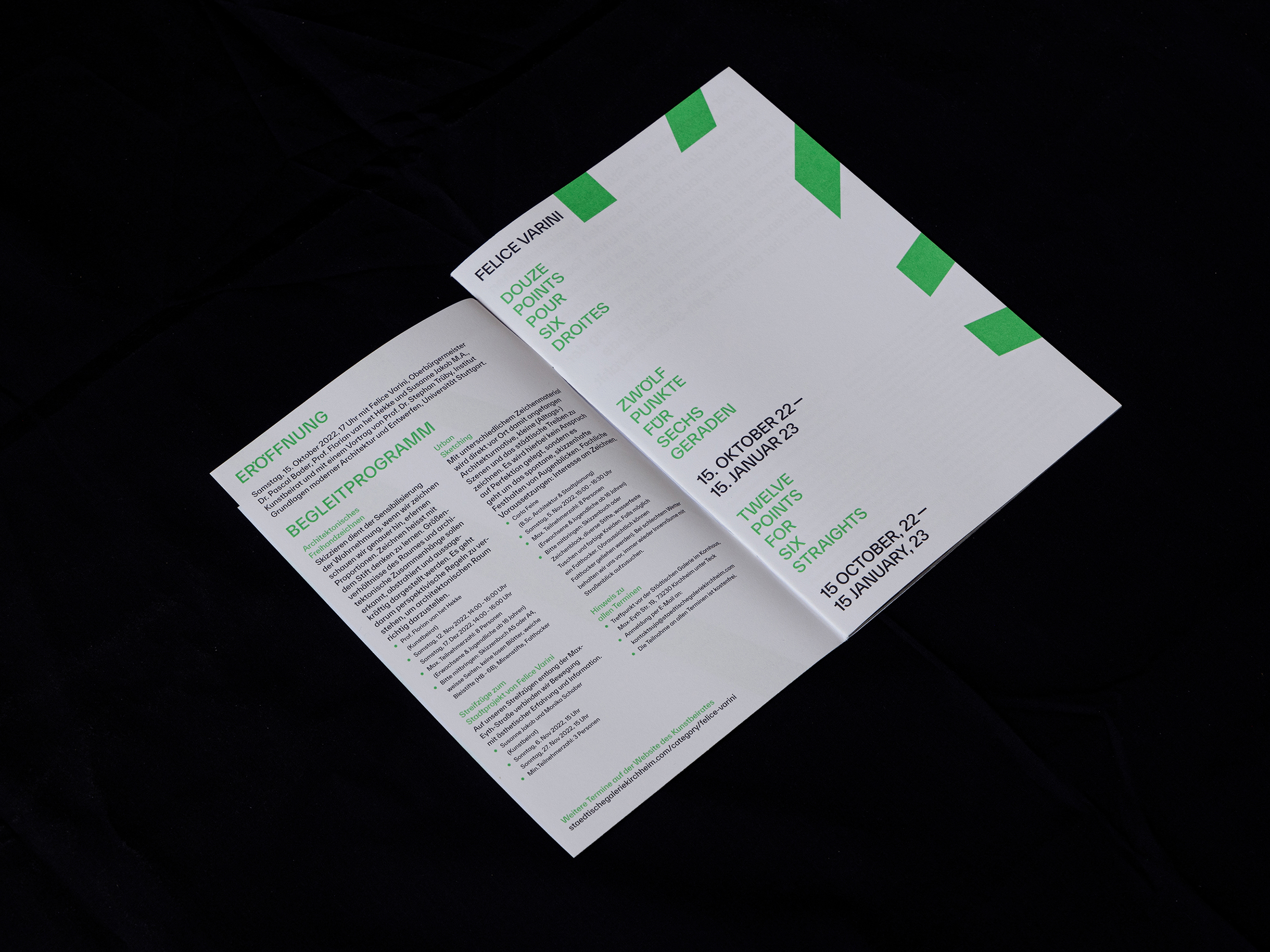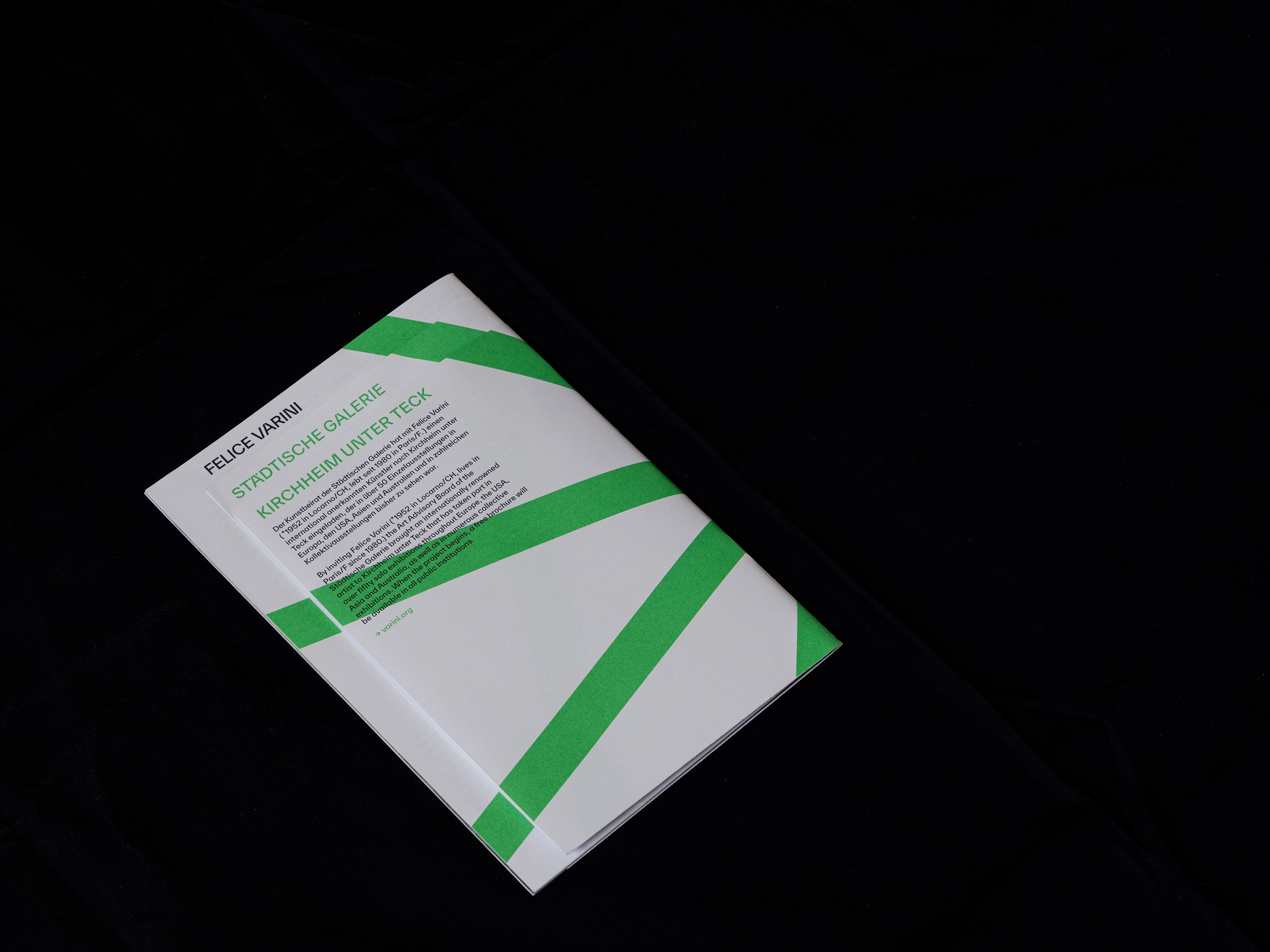 Small publication we’ve designed on the occasion of the Felice Varini’s opening at the Städtische Galerie Kirchheim [municipal gallery of Kirchheim]. Similar to Varini’s work the lines crossing the cover and the backcover are connected and visible from a special point of view, while continuing on the pages in between.
