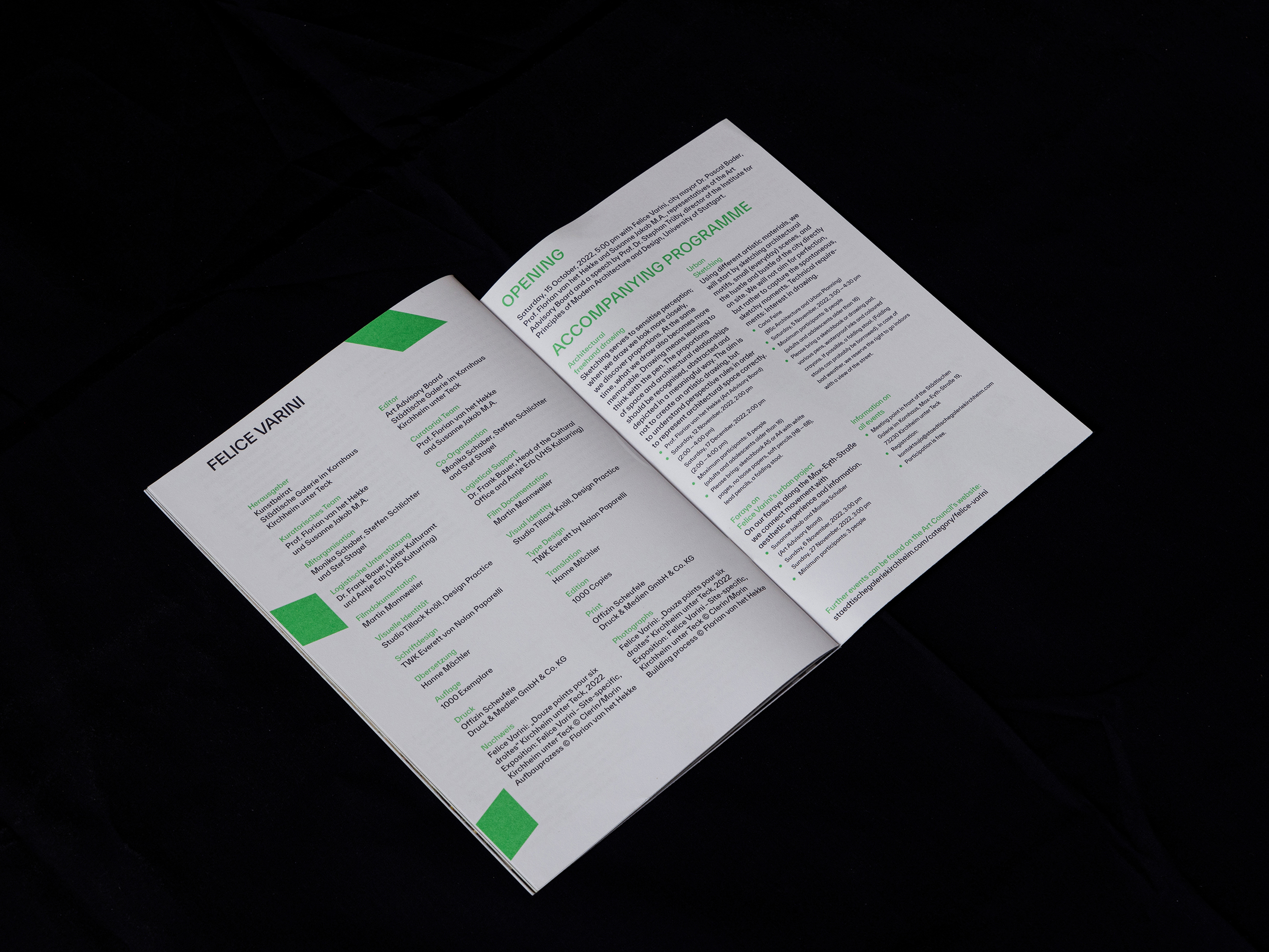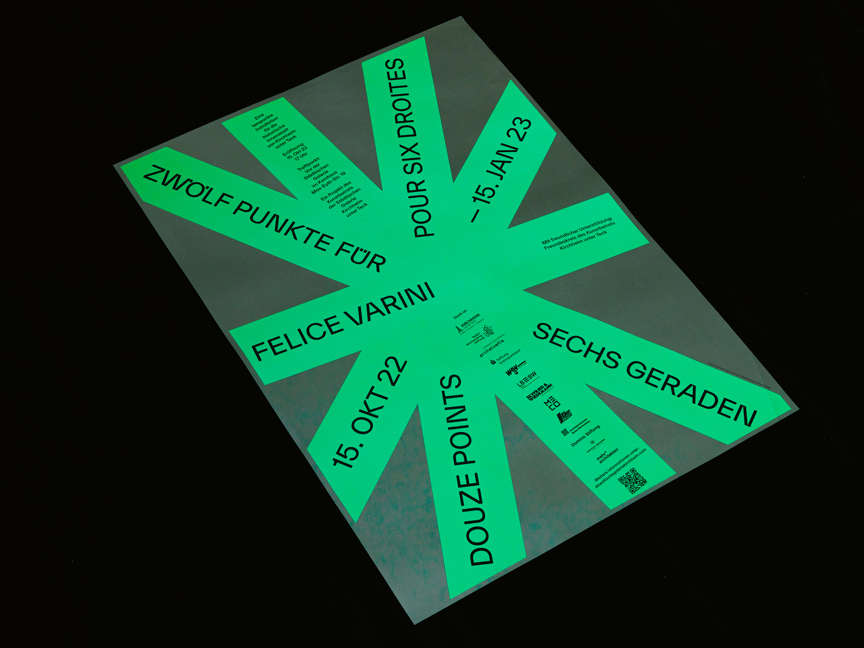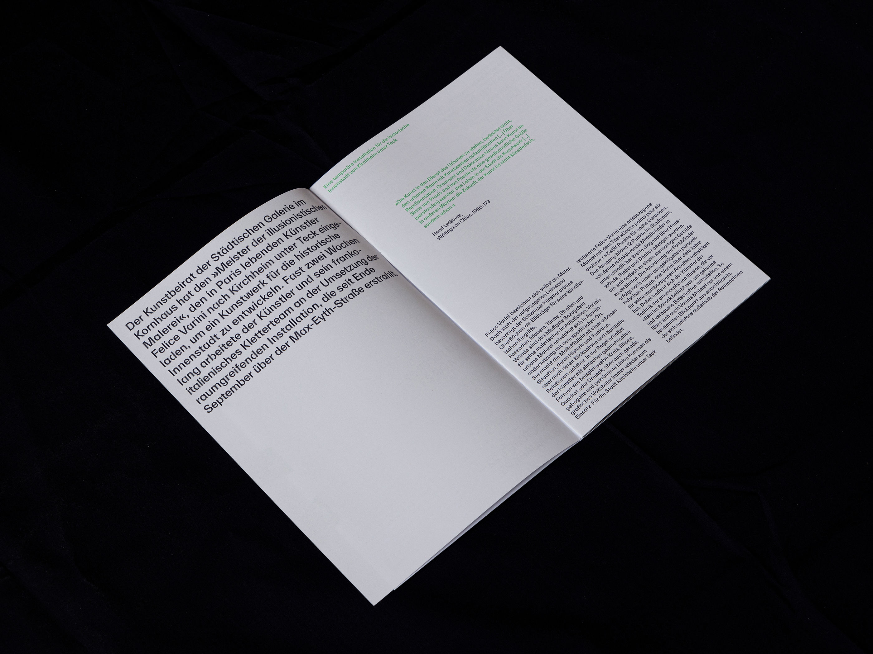 Small publication we’ve designed on the occasion of the Felice Varini’s opening at the Städtische Galerie Kirchheim [municipal gallery of Kirchheim]. Similar to Varini’s work the lines crossing the cover and the backcover are connected and visible from a special point of view, while continuing on the pages in between.