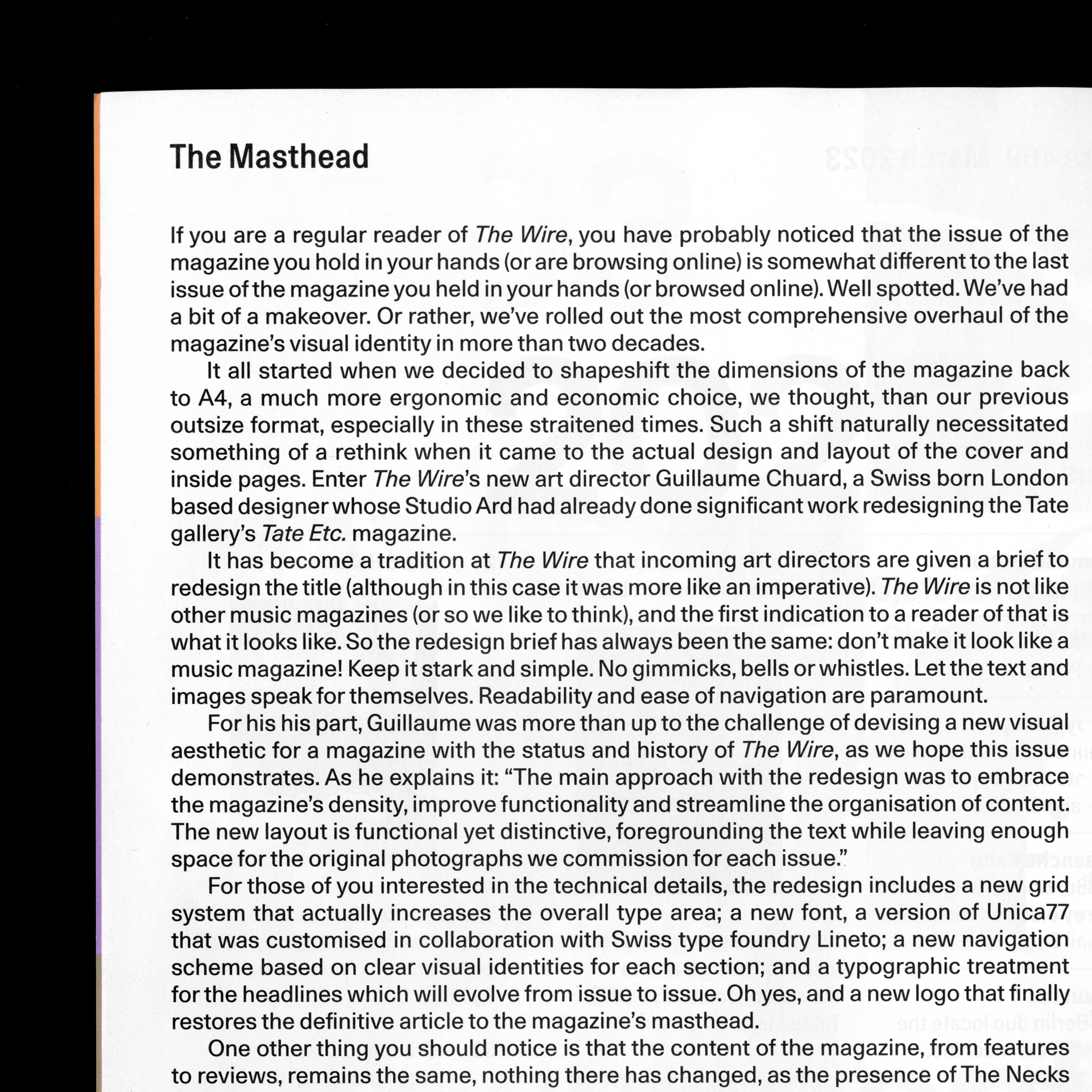 The studio developed a brand new logo and custom cut of LL Unica77 in collaboration with Lineto which restores the definitive article to the magazine’s masthead. The new layout is functional, simple yet distinctive, foregrounding the text while leaving enough space for the original photographs we commission for each issue. The new masthead embodies this radical simplicity: The Wire is The Wire; the name speaking for itself. The Wire about their new typography: