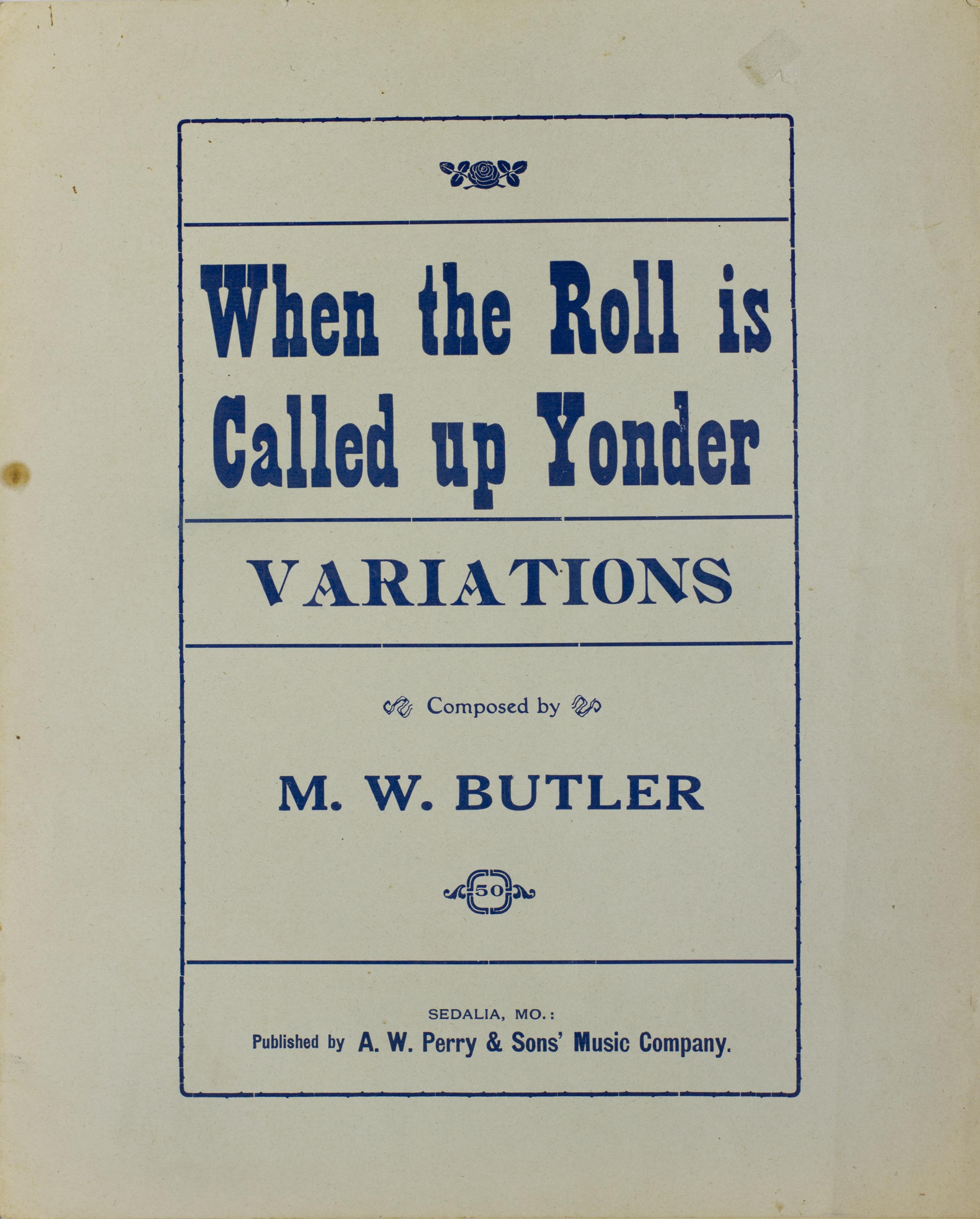 A sheet music booklet published by A.W. Perry & Sons’ Music Company in Sedalia, Missouri, consisting of variations of “When the Roll is Called up Yonder” and several other songs, composed by M.W. Butler – a pseudonym of Philip Perry (1859–1953), one of the sons of founder Austin W. Perry (1829–1900).