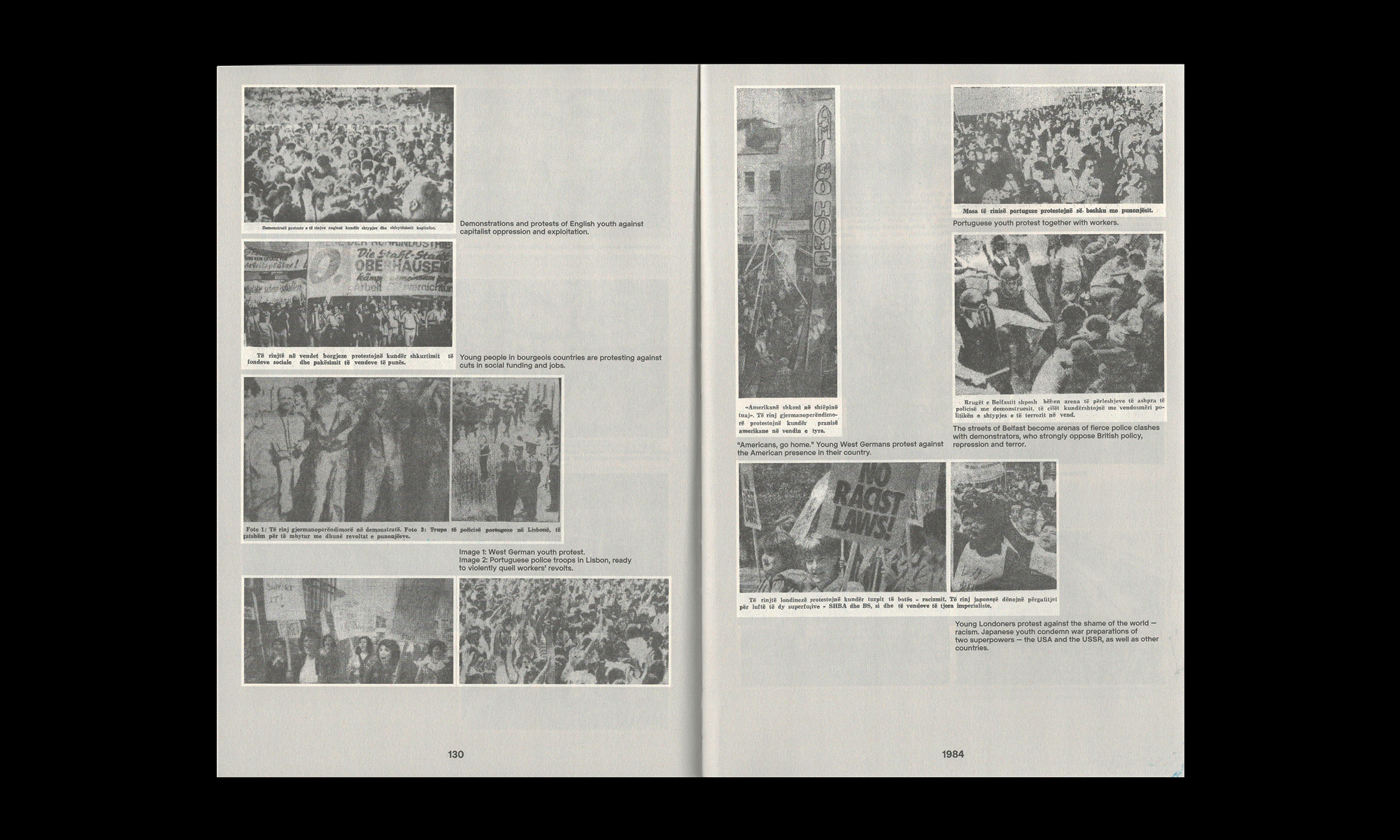 Apart from the musical internationalism, the book also includes a section of nine abstract slogans depicting the political and artistic contradictions of socialist Albania; annotated bibliography of books published in different languages on Albania; the collection of images taken from the biweekly Zëri i Rinisë (The Voice of Youth) published in 1984 and 1985.