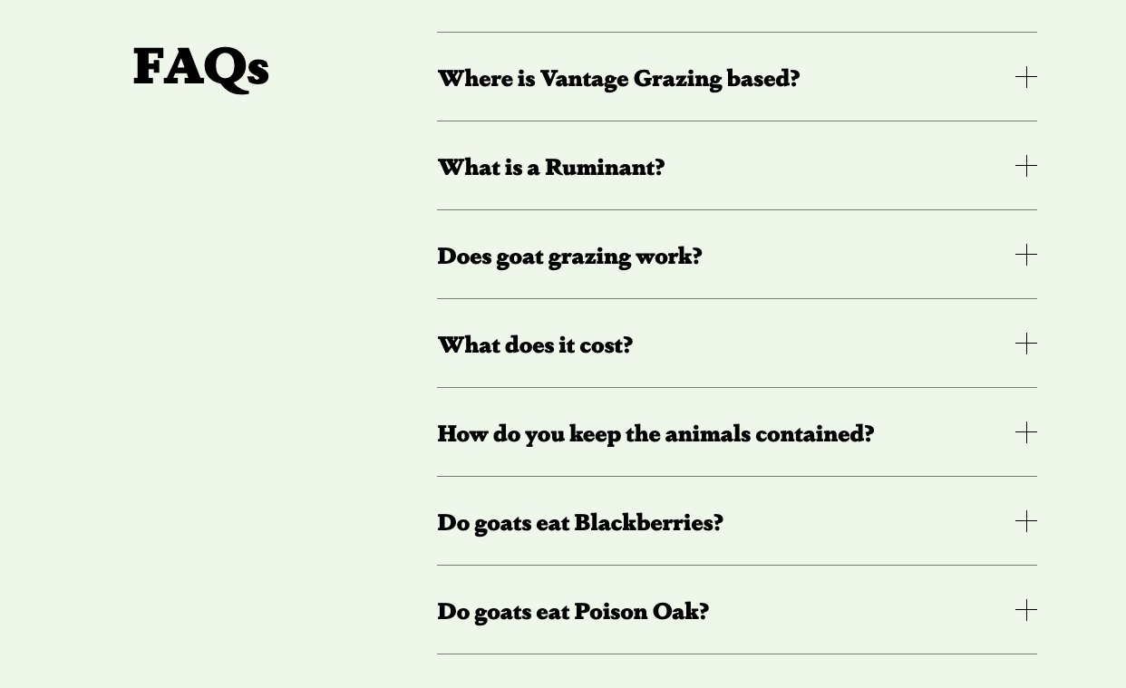 Based in the Pacific Northwest, Vantage Grazing is a mobile herd of goats that can be rented for managing vegetation. The website provides answers to the most common questions one might have about GaaS, or Grazing as a Service, and shows examples of the little ruminants at work.