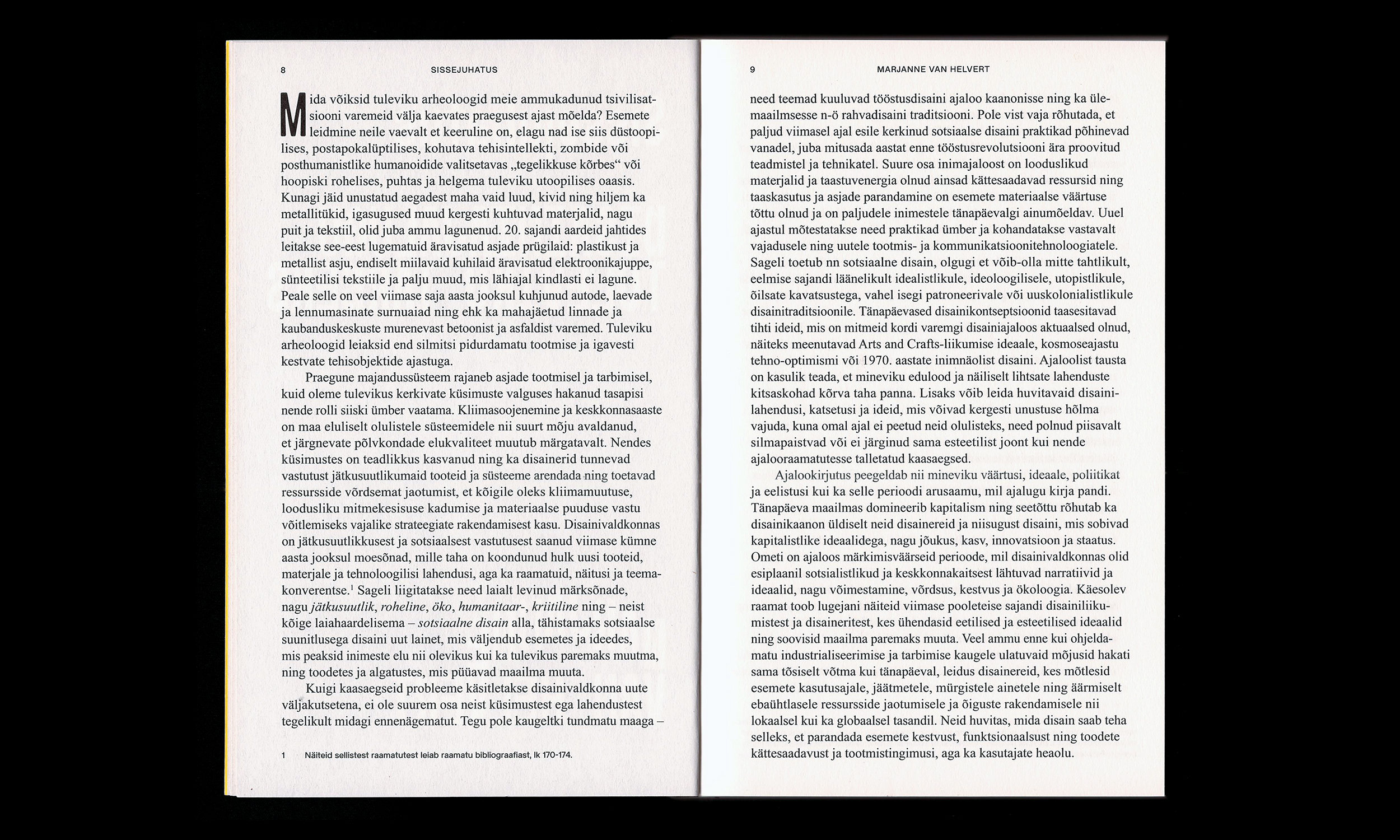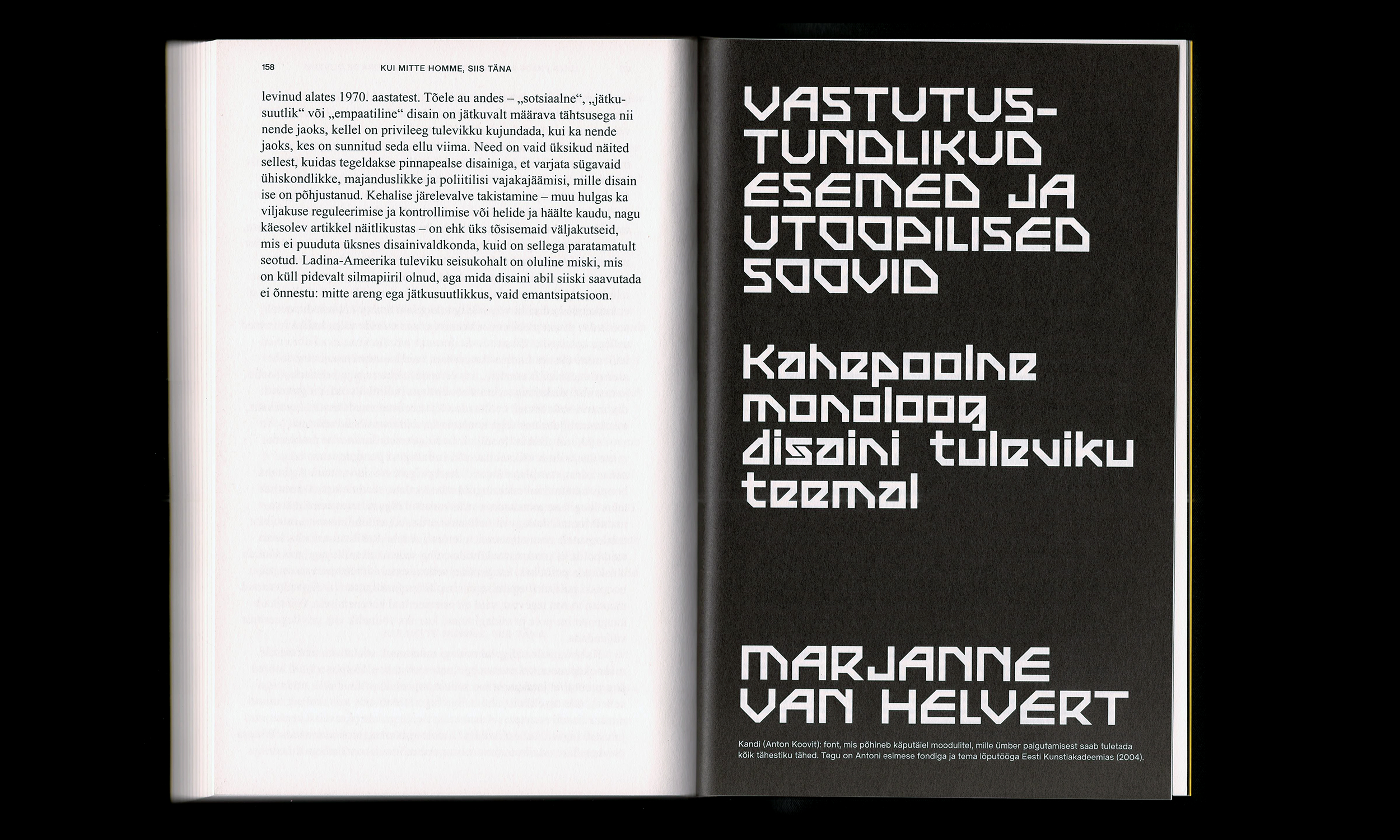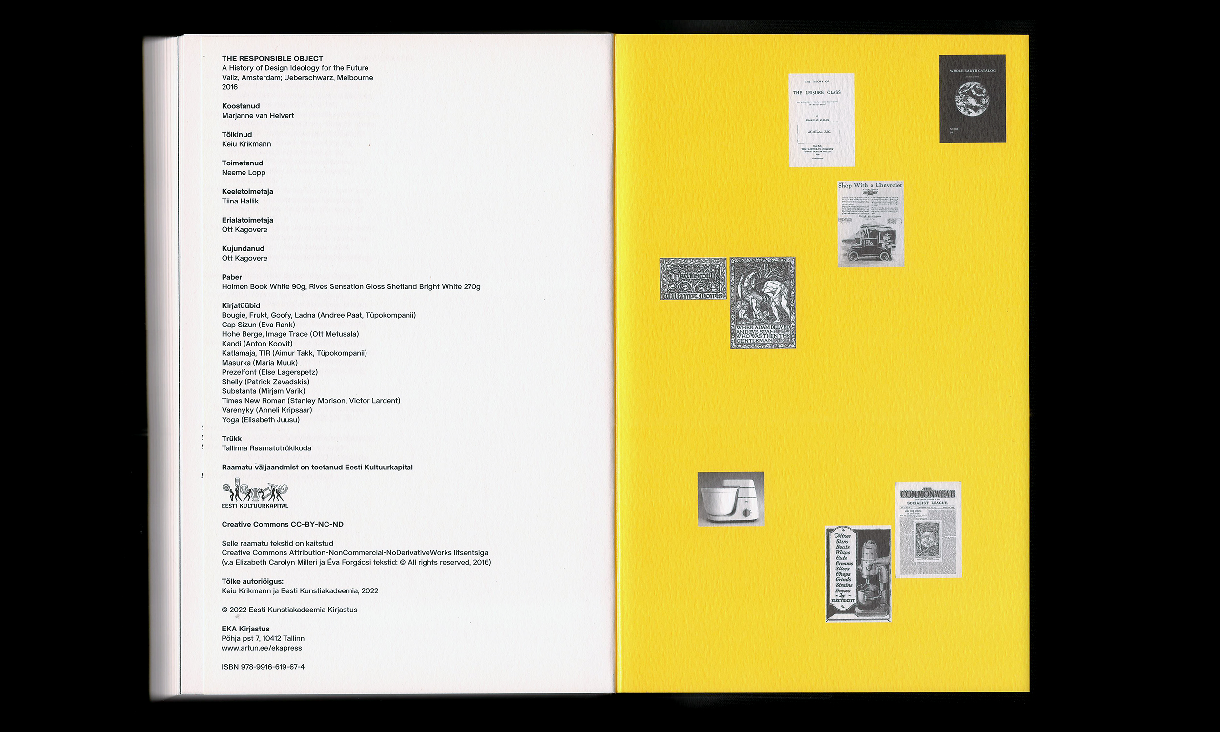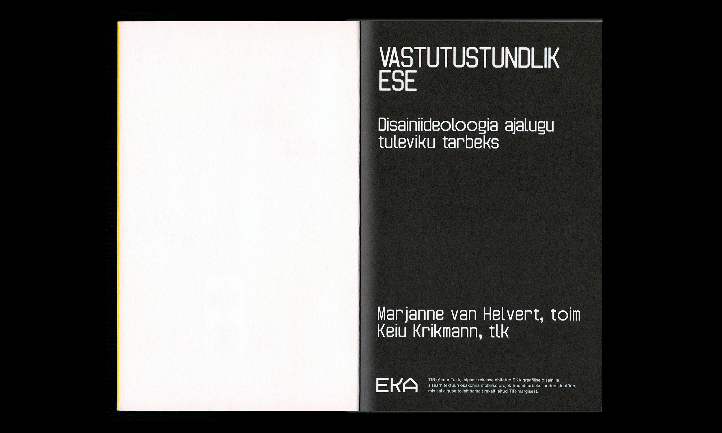 Estonian translation of The Responsible Object. A History of Design Ideology for the Future by Marjanne van Helvert (originally published in 2016 by Valiz), published in 2022 by EKA Press (Eesti Kunstiakadeemia Kirjastus), translated by Keiu Krikmann and designed by Ott Kagovere. The title page of each chapter of the book features a different typeface by an Estonian designer.