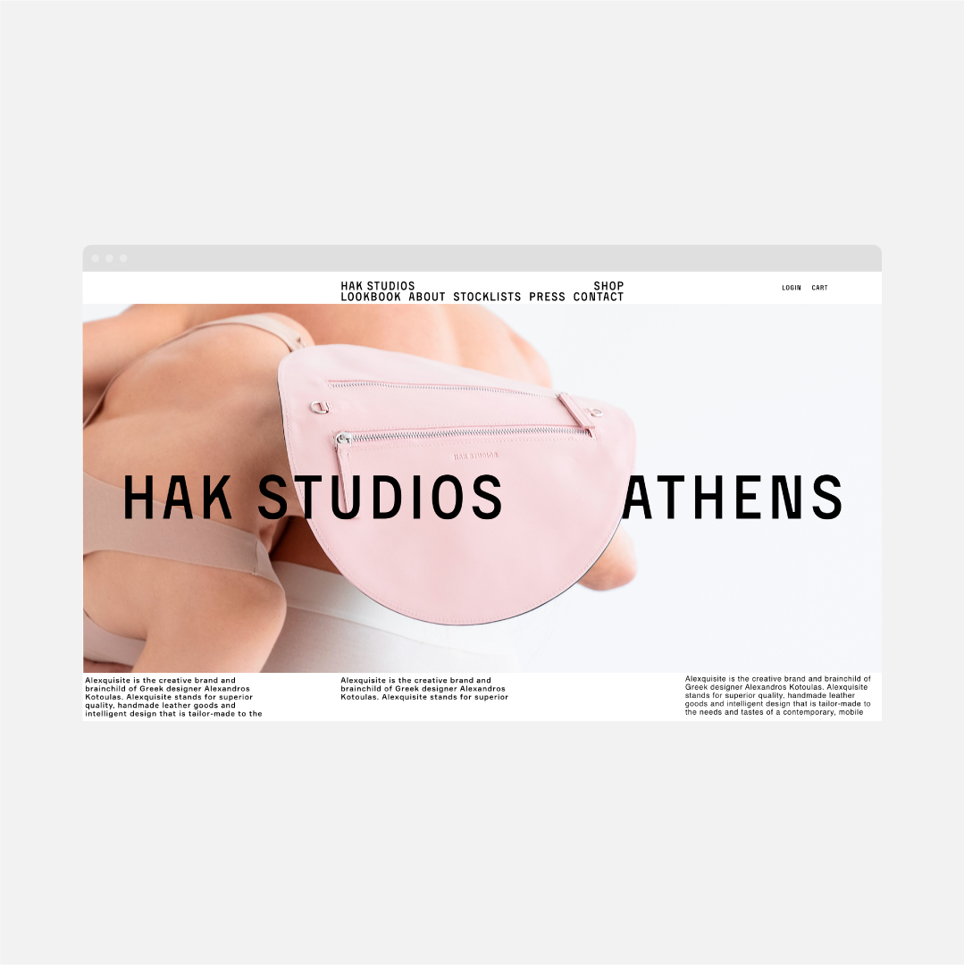 In collaboration with the founder, Semiotik Design developed the naming and visual identity. The corporate image is built around photographs that show intimate combinations of bodies and HAK Studios pieces, and typography set in Activist and Formular from Brownfox.