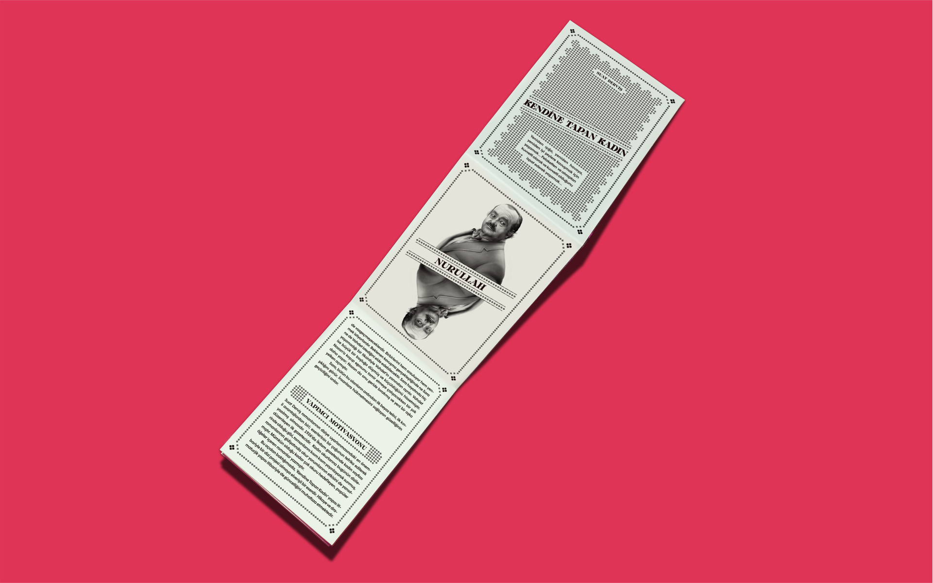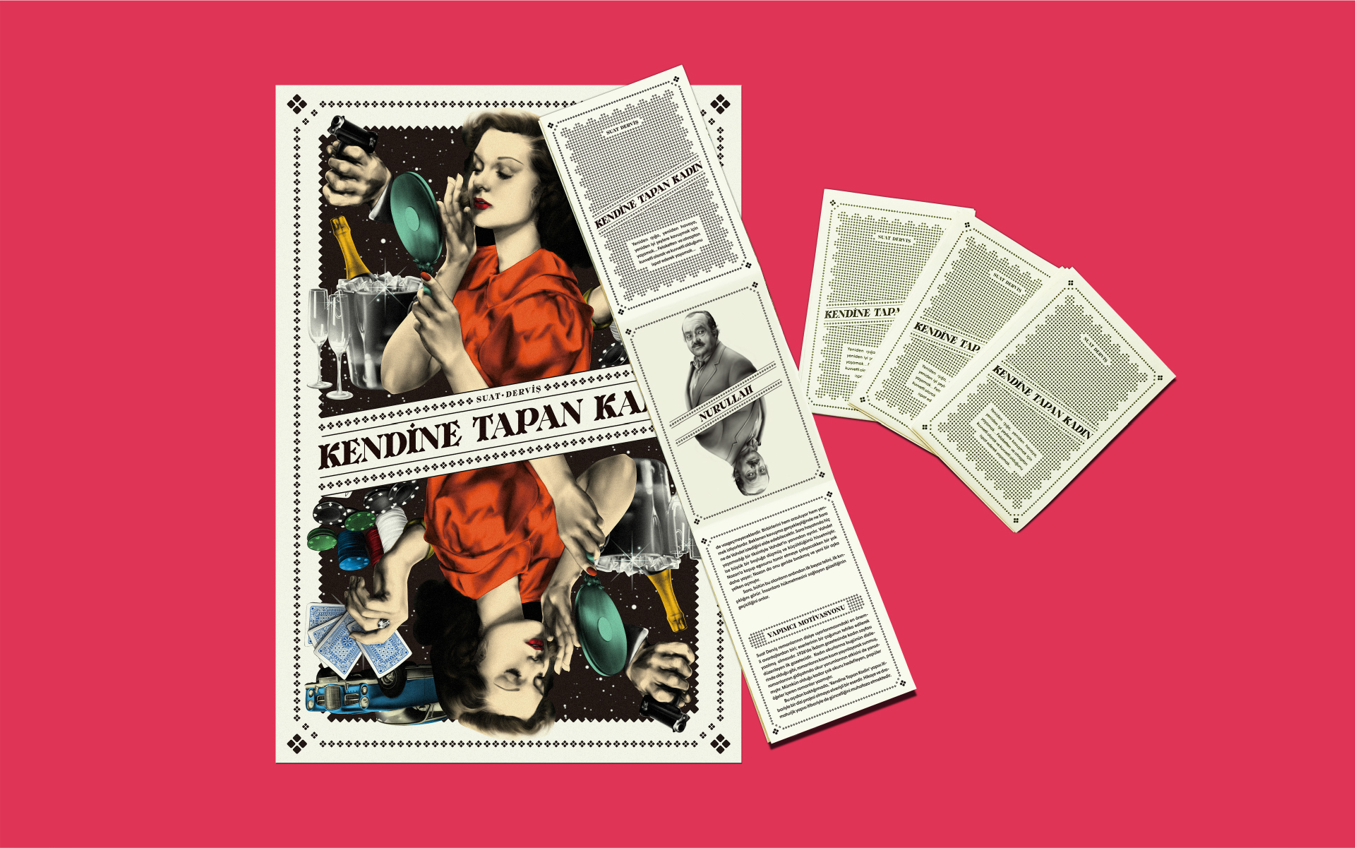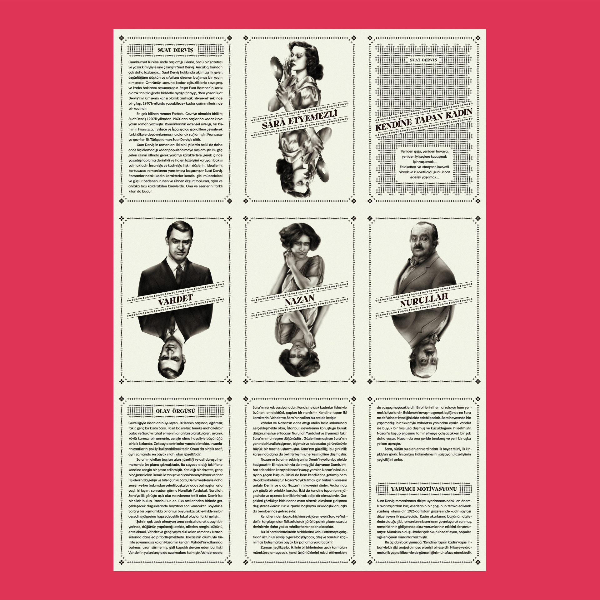 Suat Derviş’s novel Kendine Tapan Kadın (“The Woman Who Adores Herself”) was written in the 1950s and is now being made into a film. This brochure with character illustrations combined on a double-sided poster reflects the spirit of the time to pitch the upcoming project of Turkish film producer Sevil Demirci. The brochure, which heralds the production, is a double-sided 33×48cm (13×18.9inch) area surrounded by illustrations drawn with traditional methods.
