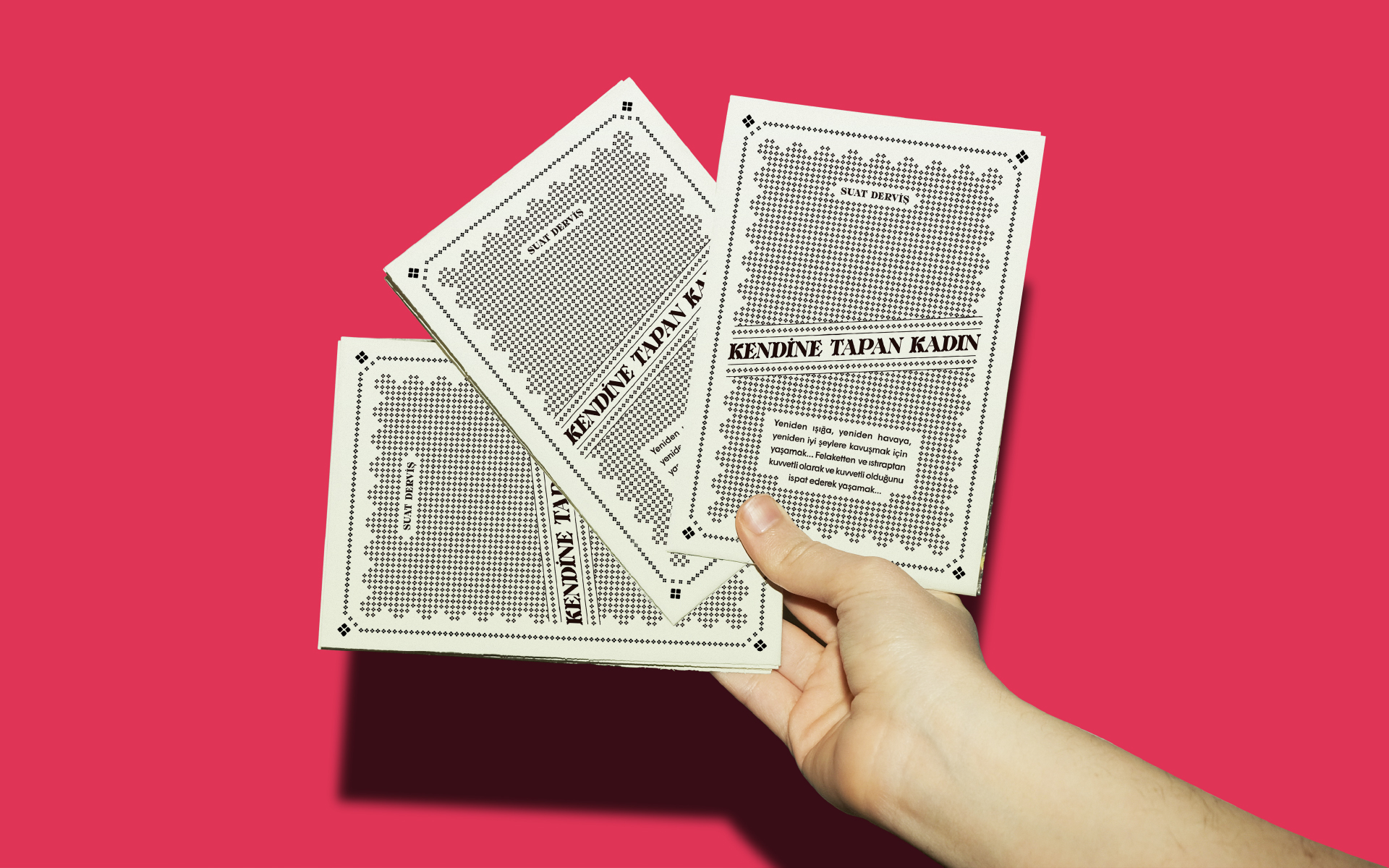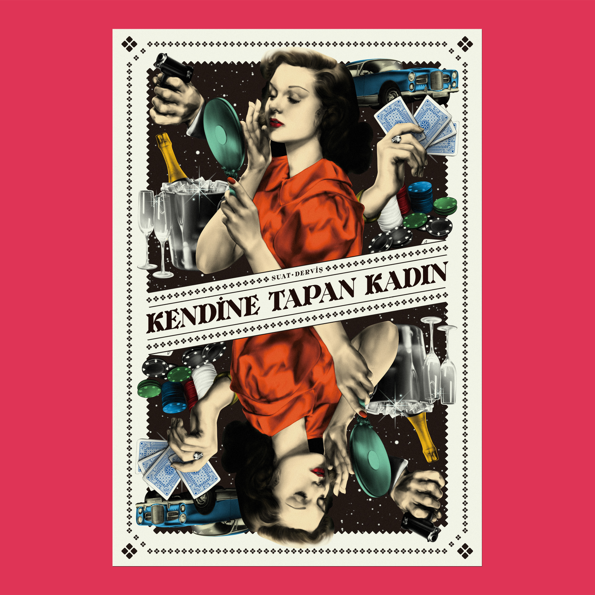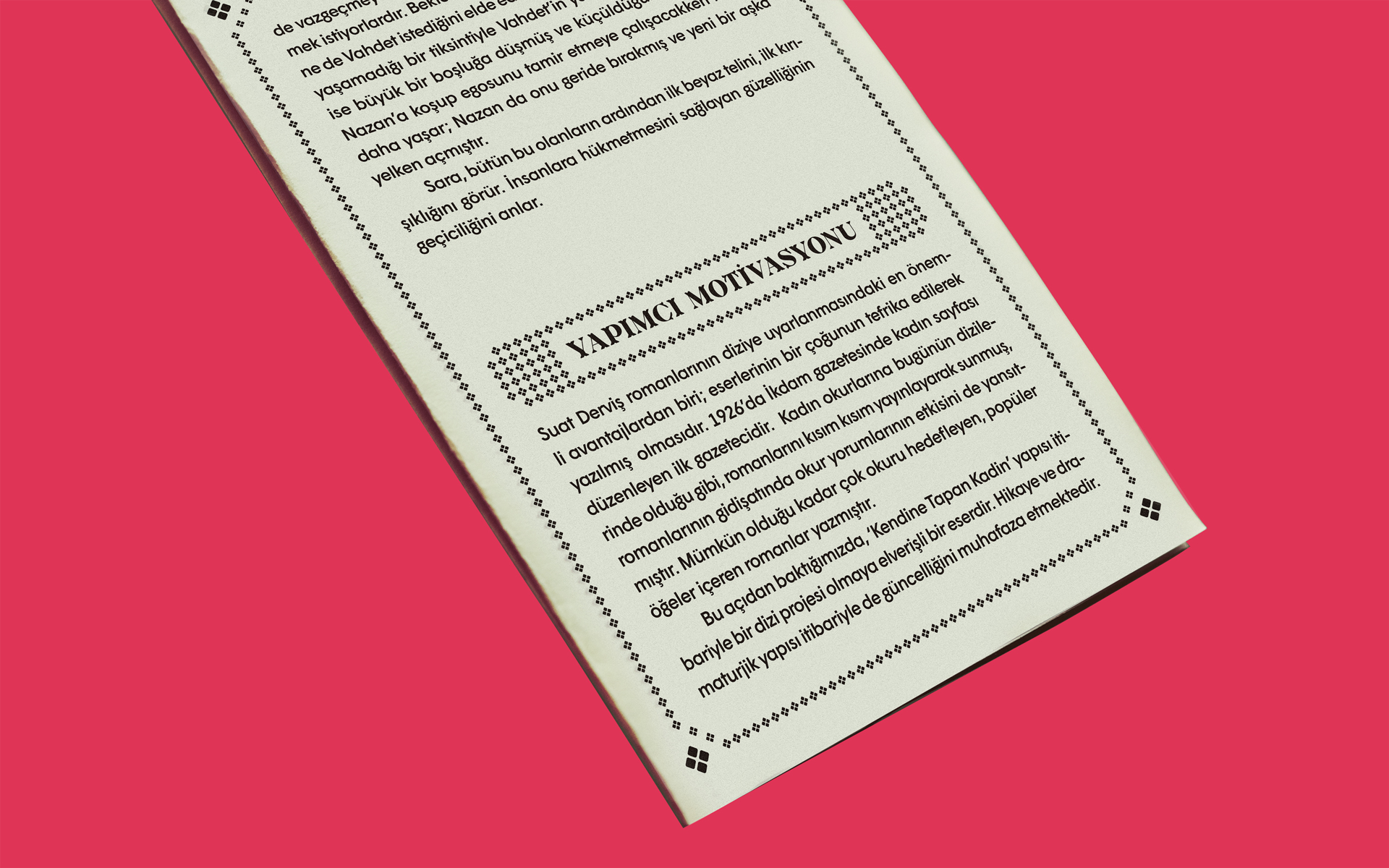 Suat Derviş’s novel Kendine Tapan Kadın (“The Woman Who Adores Herself”) was written in the 1950s and is now being made into a film. This brochure with character illustrations combined on a double-sided poster reflects the spirit of the time to pitch the upcoming project of Turkish film producer Sevil Demirci. The brochure, which heralds the production, is a double-sided 33×48cm (13×18.9inch) area surrounded by illustrations drawn with traditional methods.