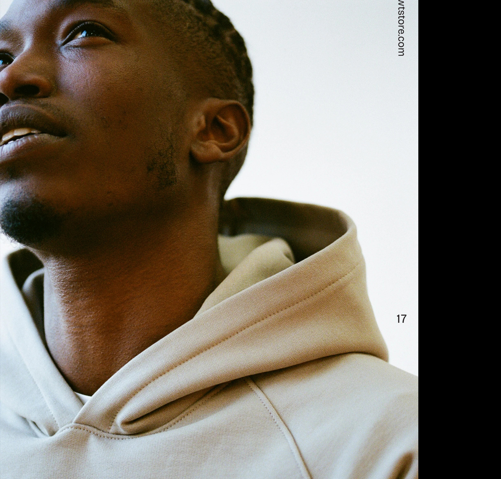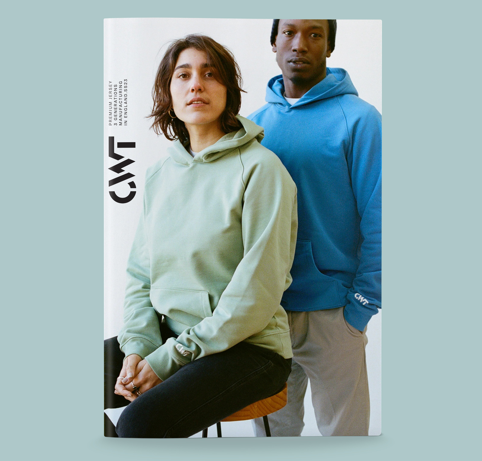 The founder’s family roots are in the 1960s textiles and tailoring trade of Leicester (UK), and the letter-forms seemed fitting given their similar age and urbane aesthetic quality—city-born type for city-born clothing. The logotype is used fairly discreetly, screen-printed onto sleeves or lower panels, and applied inside the garments as high-definition woven labels.