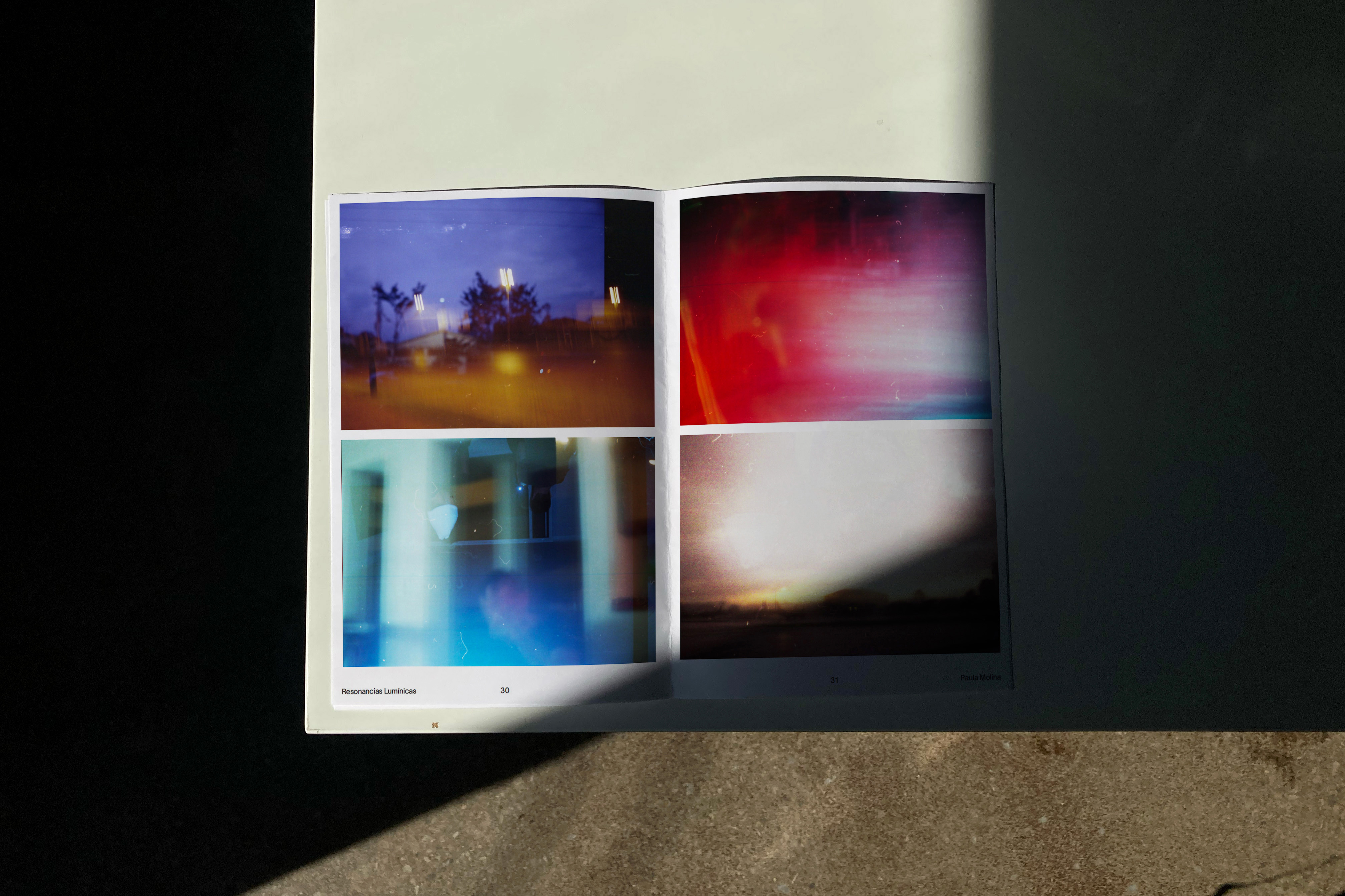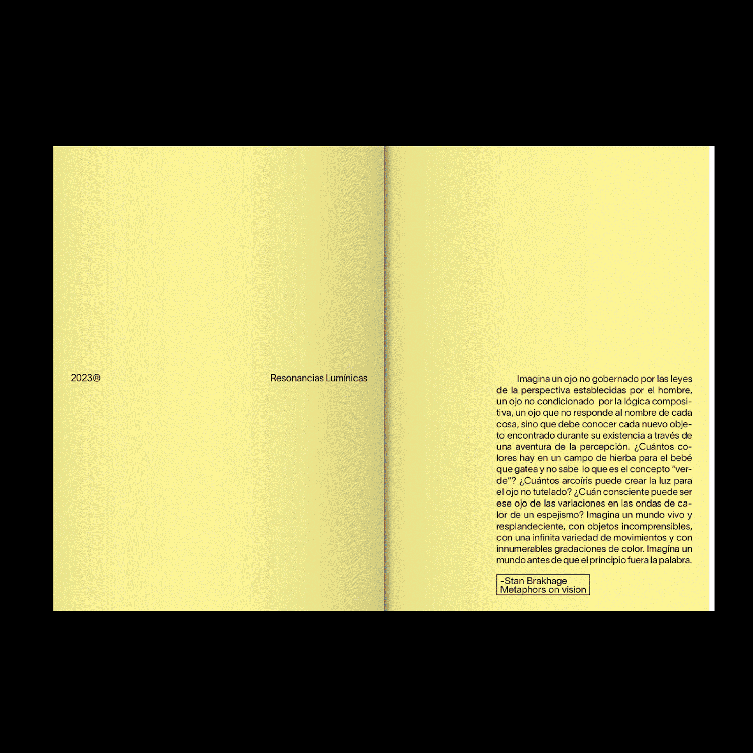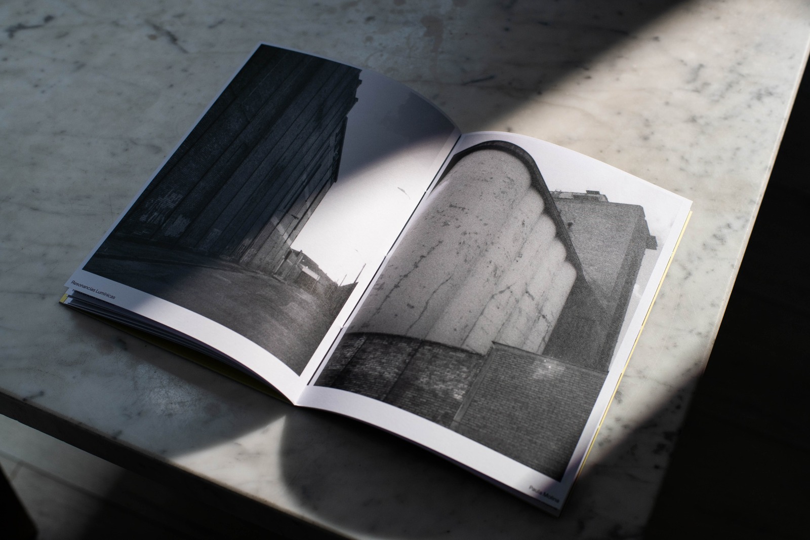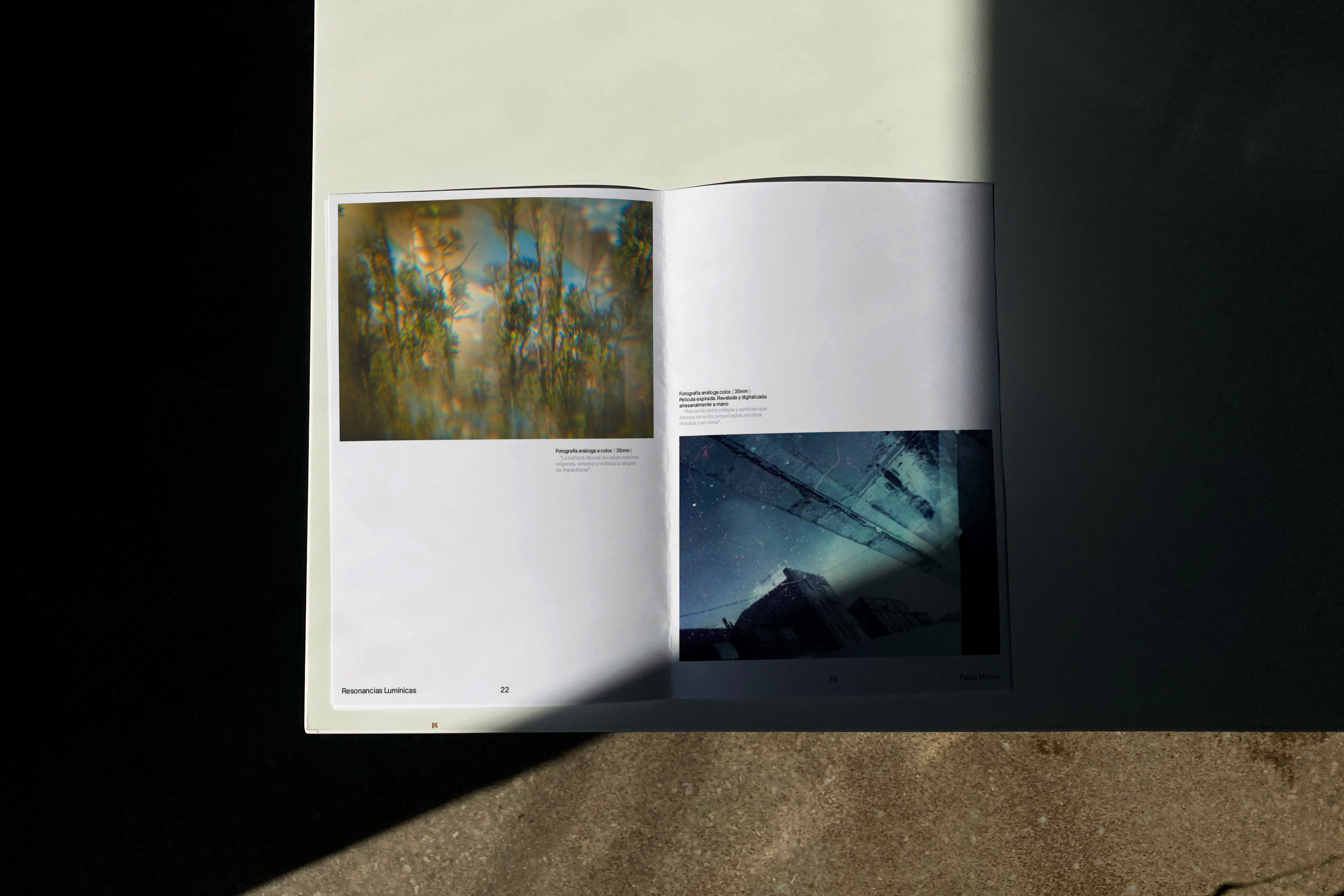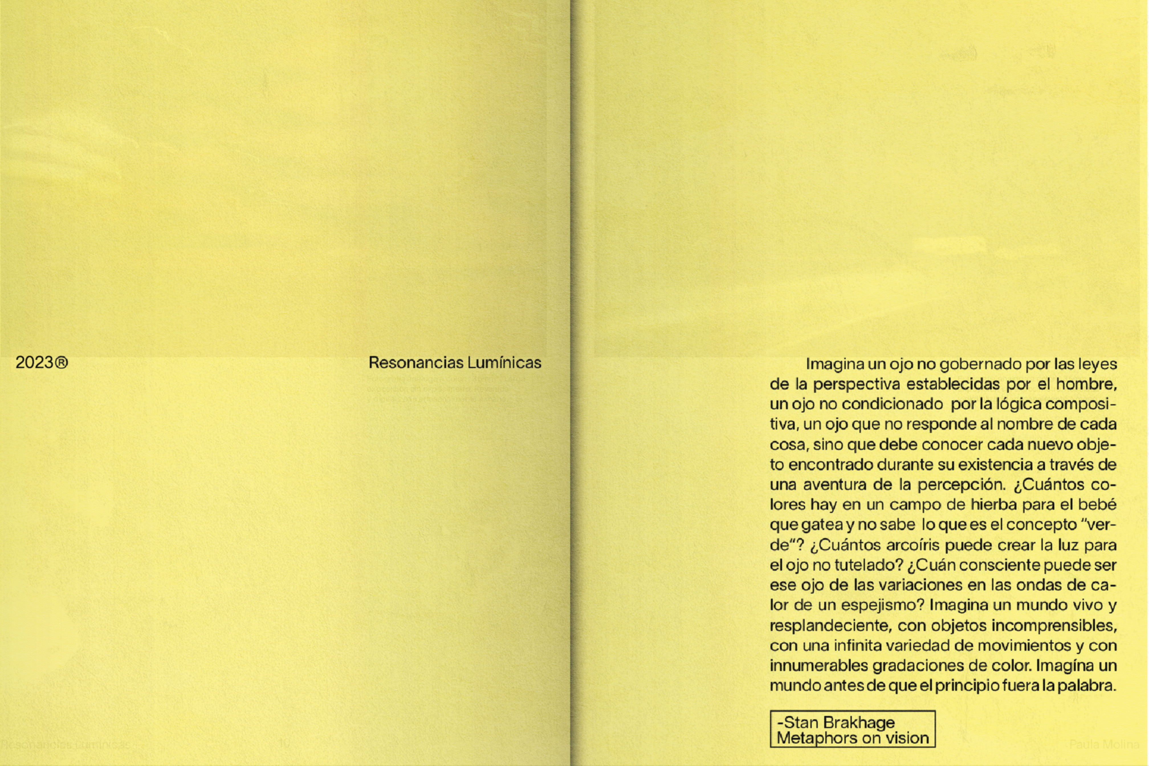 For the book titled Resonancias Lumínicas it was decided to choose the color yellow as a representation of light, the simple design seeks to give all the focus to the images. On the cover, Rhubarb was used in outline to represent the path of light that shapes the images through light, with adjusted endings of the R and L to fit the cover. TWK Lausanne was used for the body text, which is comfortable to read at any text size.
