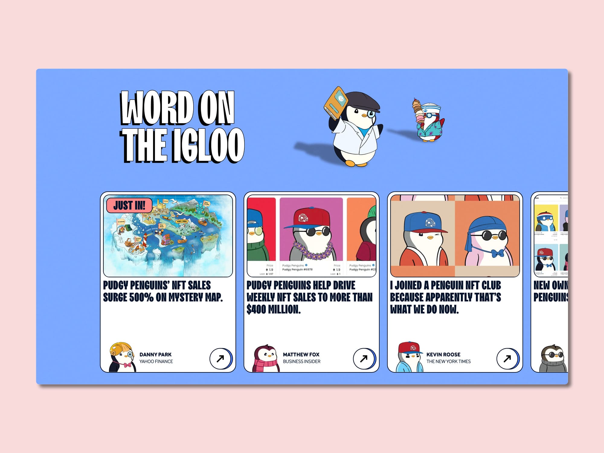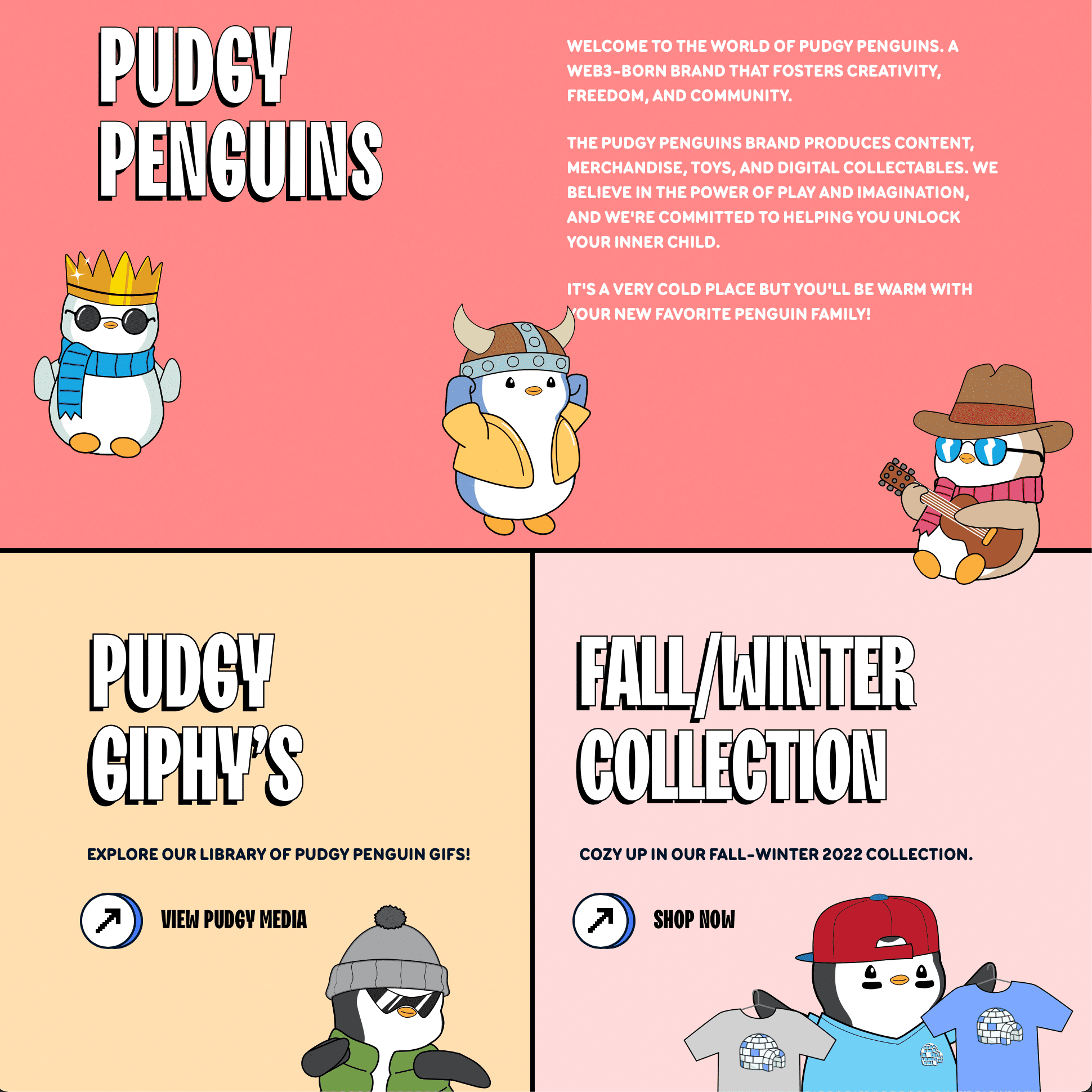 Pudgy Penguins is a Web3 IP brand that produces content, merchandise, toys, and digital collectables. Embodying love, empathy, and compassion, the Pudgy Penguins are a beacon of good vibes and positivity for everyone.