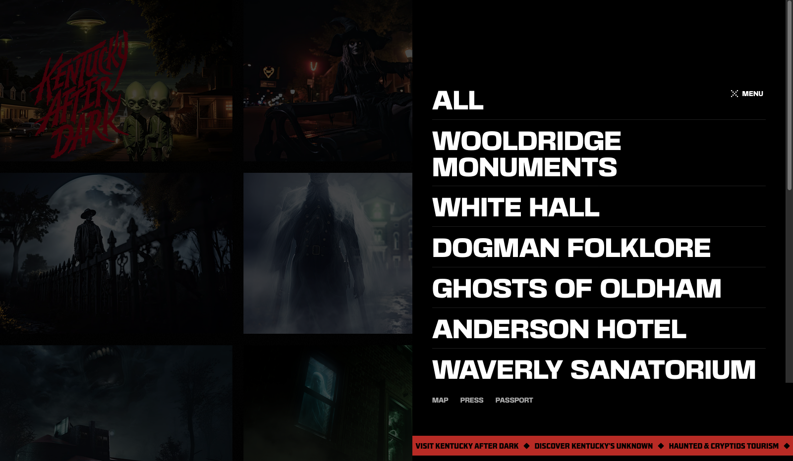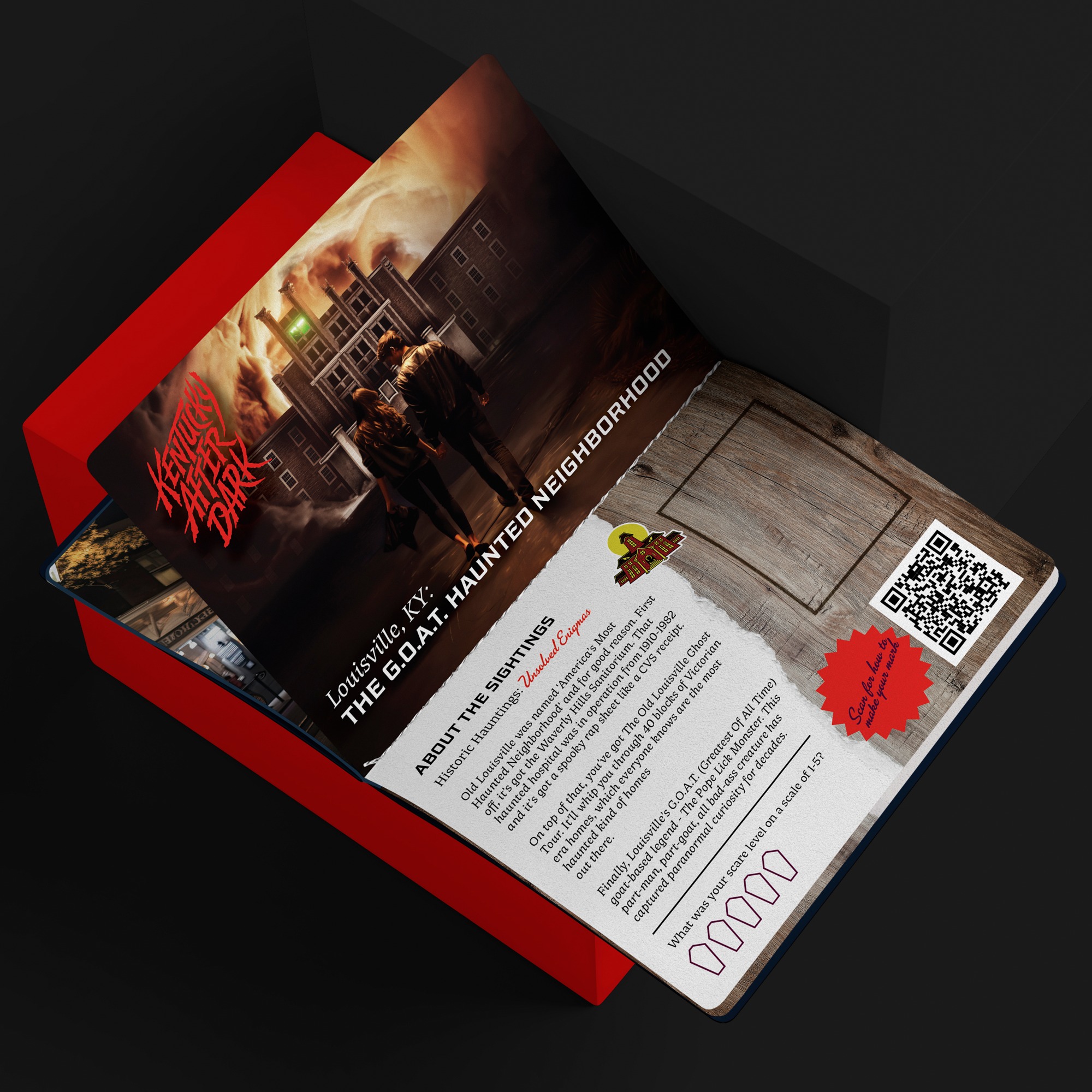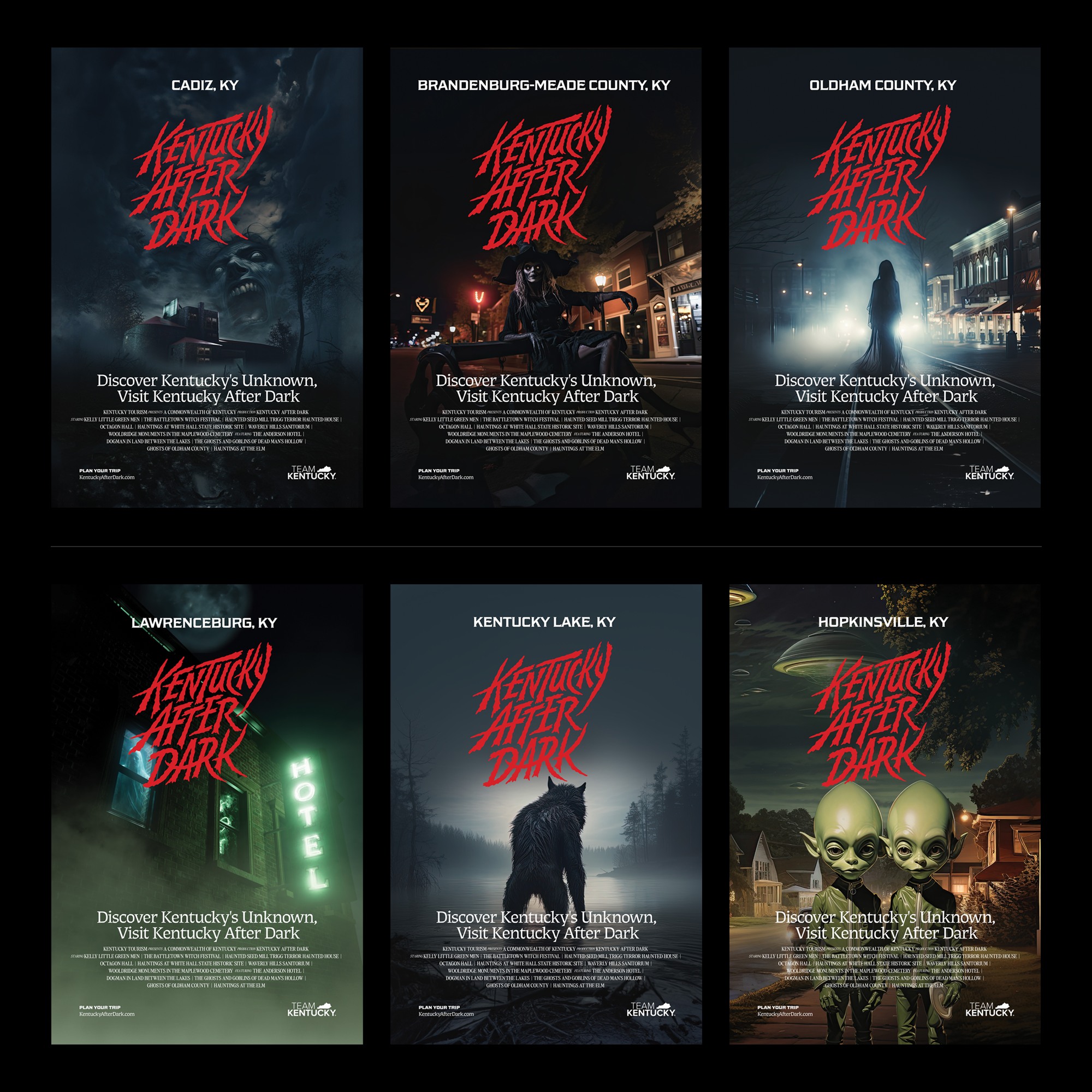 “Kentucky After Dark” is an advertising campaign devised by indie agency Coomer, on behalf of a collective of small local Kentucky tourism boards. The campaign aims to highlight local spooky and paranormal folklore to draw people to lesser-known sites throughout the state, using a passport program. The passport contains imagery and descriptions of each location, as well as fill-in sections for participants.