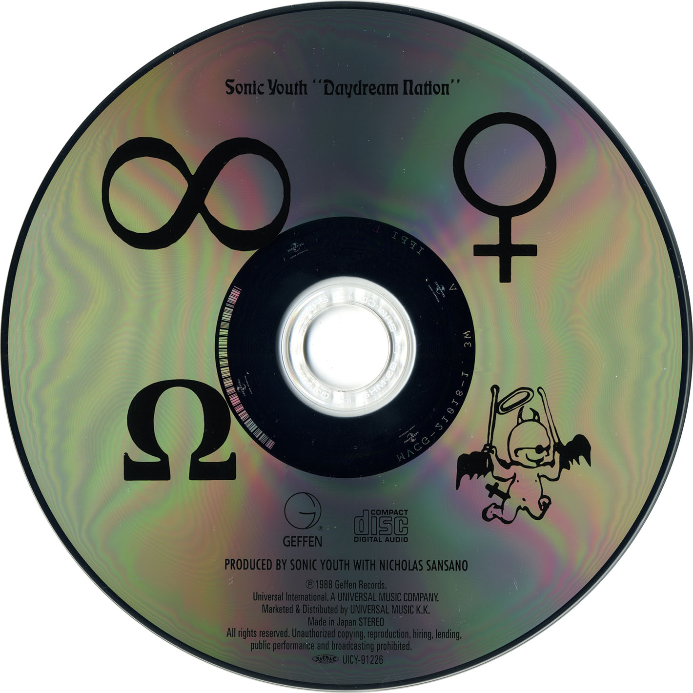 The cover for Daydream Nation features the 1983 Gerhard Richter painting Kerze (“Candle”). The back cover art is a similar Richter painting from 1982. The vinyl version’s four sides and the compact disc inner tray contain four symbols each representing one of the members of the band, in an homage to—and parody of—the four symbols from the fourth Led Zeppelin album. The symbols are infinity (∞) for Ranaldo (referencing his 1987 album From Here to Infinity), female (♀) for Gordon, uppercase omega (Ω) for Moore (referencing Leo, his zodiac sign), and a drawing of a demonic–angelic baby holding drumsticks for Shelley.